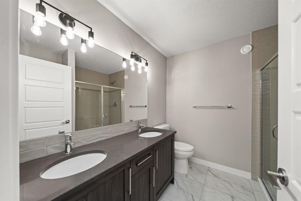 Welcome to 110 Sora Gardens! This kitchen is a standout: modern quartz countertops, stainless appliances, plus a generous island that works for meal prep, homework, or hosting friends-all while staying connected to the rest of the main floor through the open plan. Engineered hardwood on the main level adds durability and an upscale feel that stands the test of time. On the upper level, the primary suite provides a private retreat with ensuite and walk-in closet. Two additional bedrooms offer flexibility-space for kids, guests, or a home office. Upper-floor laundry makes daily routines easier. A separate side entrance to the basement provides future flexibility for expanded living space or potential for suite (subject to city approval). With no condo fees, the peace of mind that comes with a new-home warranty, and thoughtful features throughout, this home is built to give strong long-term value and low maintenance. Situated with easy access to Deerfoot and Stoney Trail, commuting is simplified. Nestled steps from the wetlands, walking paths, and green space, this home delivers a lifestyle that balances nature, convenience, and investment potential. *** The First-Time Home Buyers' GST Rebate could save you up to $50,000 on a new home! You must be 18+, a Canadian citizen or permanent resident, and haven't owned or lived in a home you or your spouse/common-law partner owned in the last four years. Terms and conditions are subject to the Government of Canada/CRA rules and guidelines.***