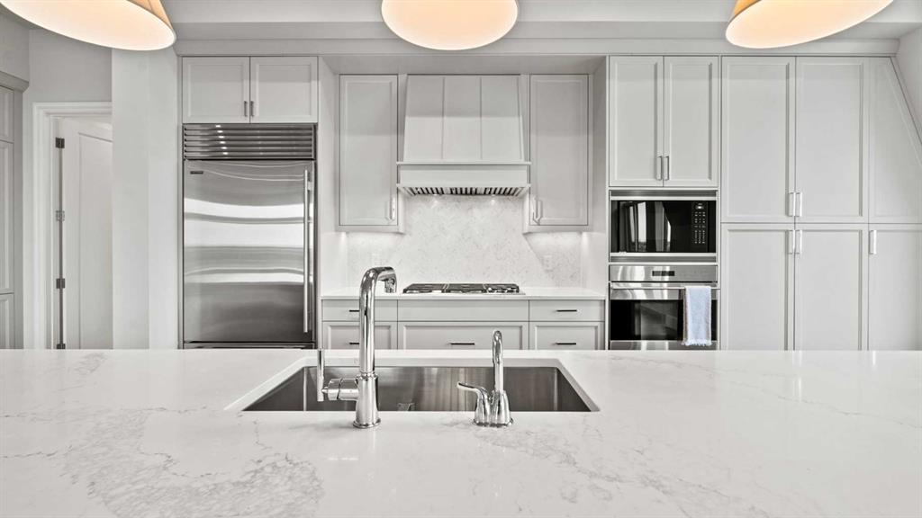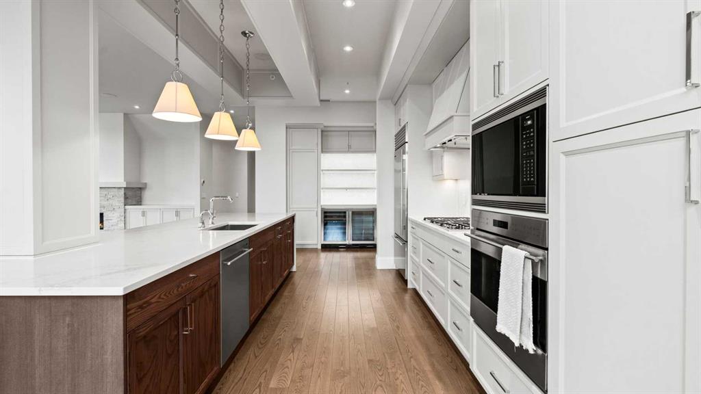 Penthouse living reaches a new level of sophistication in this exceptional residence at the prestigious, concrete-built Champagne. Perched high above it all, this east-facing penthouse spans 2,041 square feet of impeccably curated living space, framed by dramatic arched windows, double sliding patio doors, and two private outdoor spaces, including an east-facing rooftop balcony, that welcome in the morning sun and serene city views. Square footage is based on RMS measurements; original builder plans indicate a total area of approximately 2,280 square feet and are available for reference. Designed for those who appreciate timeless quality and uncompromising standards, the home showcases wide-plank hardwood flooring, 10-foot ceilings, and 8-foot interior doors, creating an immediate sense of volume and refinement. The expansive open-concept living and dining areas are flooded with natural light and seamlessly extend outdoors—ideal for both elegant entertaining and quiet mornings overlooking the skyline. At the heart of the home, the chef’s kitchen is a statement of form and function, appointed with Sub-Zero and Wolf appliances, premium cabinetry, and refined finishes that cater effortlessly to both everyday living and upscale hosting. Every detail has been considered, including Hunter Douglas powered blinds, allowing light and privacy to be adjusted at the touch of a button. The primary retreat is generously proportioned and serene, offering space for a king-sized bedroom suite and sitting area, while the ensuite bath delivers a spa-like experience worthy of a luxury hotel. A second bedroom, equally well-appointed, provides comfort and privacy for guests or family. This penthouse includes two oversized titled underground parking stalls, a rare and valuable convenience, along with the peace of mind that comes with Champagne’s reputation for exceptional maintenance and concrete construction. Champagne offers a refined, pet-friendly lifestyle with amenities such as a two-bay car wash, secure bike storage, and ample visitor parking. Just steps from the Bow River pathway system, Carburn Park, Sue Higgins Park, and the heart of Quarry Park—with its executive YMCA, dining, and services—this location balances tranquility with connectivity. Quick access to major routes ensures effortless commuting. This is not simply a condo—it is a penthouse residence for the discerning buyer who values space, privacy, and understated luxury.