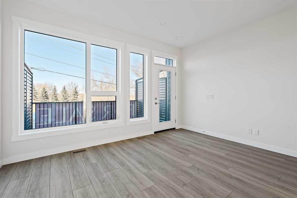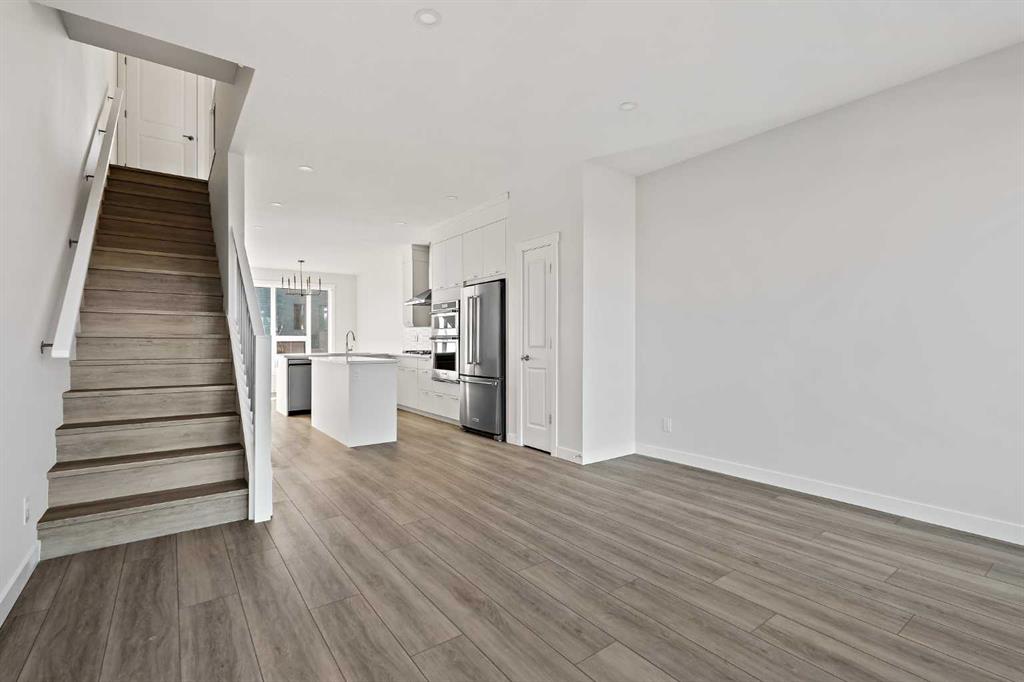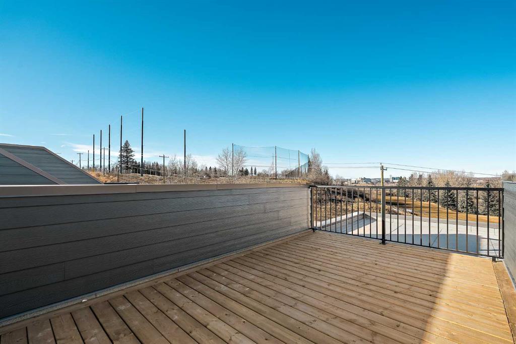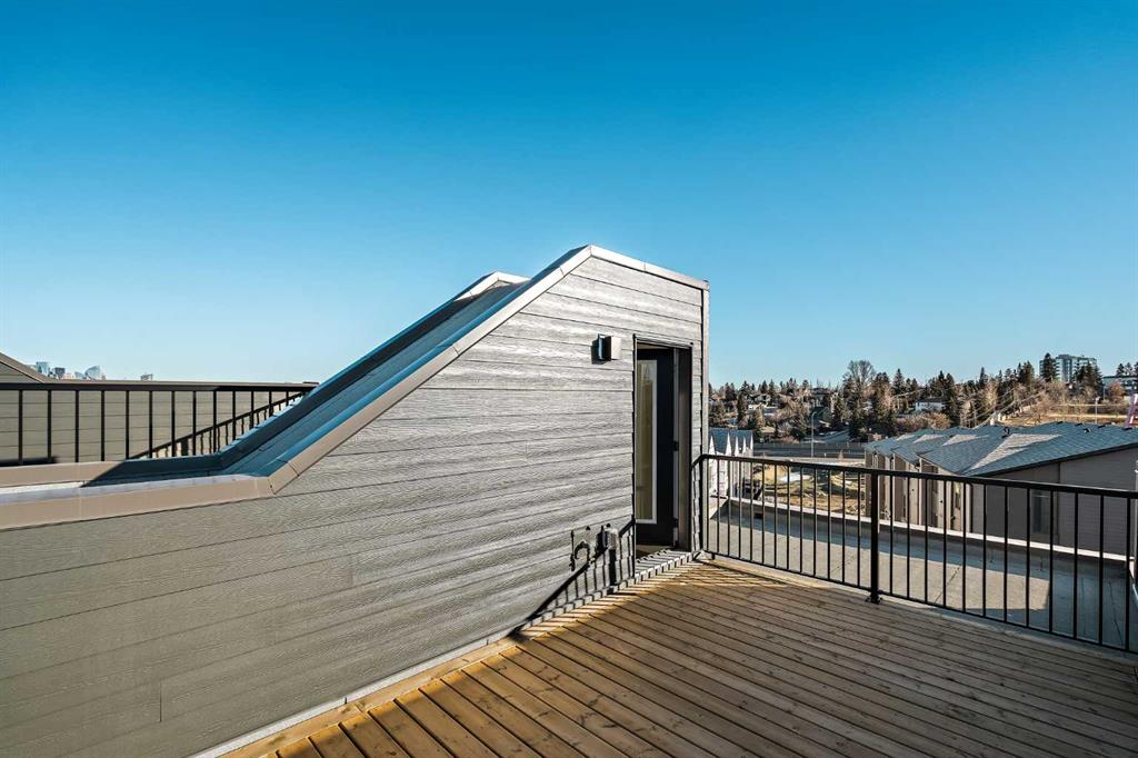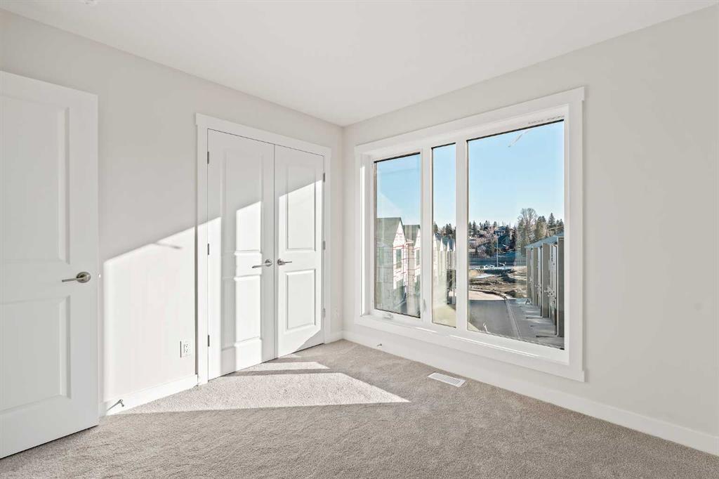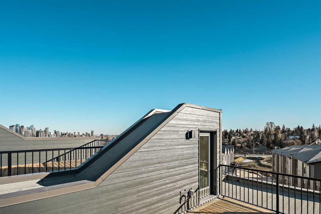 Welcome to The Alameda by Brookfield Residential - where modern design meets urban convenience, just minutes from downtown Calgary with stunning views! This beautiful 2-bedroom, 2.5-bathroom townhome offers over 1,500 sq. ft. of thoughtfully designed living space, complete with a single attached garage and a spacious main-level flex room - perfect for a home office, gym, or creative studio + 3 outdoor living spaces including a rooftop patio! The lower level features an expansive flex room spanning ~14'x14' with soaring 10' ceilings and a wall of windows overlooking your private patio and the front street. Experience open-concept living on the main level highlighted by 9’ ceilings throughout with oversized triple-pane windows at either end providing endless natural light all year long. The kitchen is a chef’s dream, featuring KitchenAid gourmet appliances, including a gas cooktop, wall oven/microwave, and a chimney hood fan, all complemented by elegant finishes and generous counter space and a pantry. The timeless white kitchen is central to the main level, opening to both the dining area and great room, creating the ideal space for entertaining. The great room has direct access to the main level balcony that spans 15' x 9'8" and includes a BBQ gas line for everyday convenience. The upper level features a large primary suite complete with walk-in closet and a private 4pc ensuite with dual sinks and a tiled walk-in shower. A large second bedroom, full bathroom and laundry complete the upper level. The top level of the home is where you'll spend your summers - soaking up the sun on your private ~200 ft2 rooftop patio with views overlooking the Shaganappi golf course and stunning views to the south and downtown Calgary! Complete with 2 living areas, 2 bedrooms, 2.5 bathrooms and 3 outdoor living spaces + a private attached garage, this home is perfect for professionals or down-sizers that appreciate convenience. Located away from Bow Trail, this premium location offers a quiet space for daily living with convenient access to the CTrain and downtown Calgary just minutes away. Additional features include convenient street parking in front, and full builder warranty + Alberta New Home Warranty - allowing you to purchase with peace of mind. This maintenance-free home is fully move-in ready with free legal fees for the purchaser in desirable Crown Park!