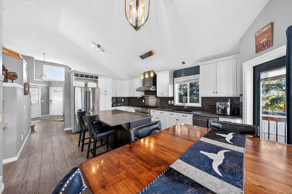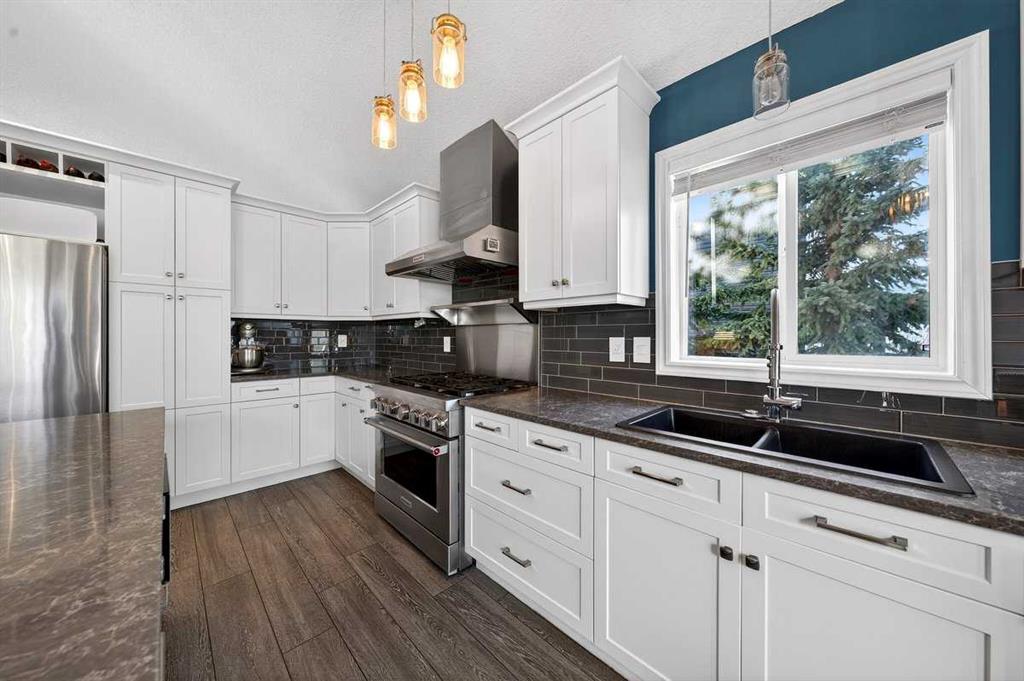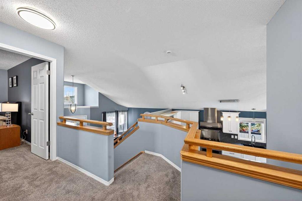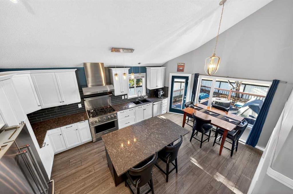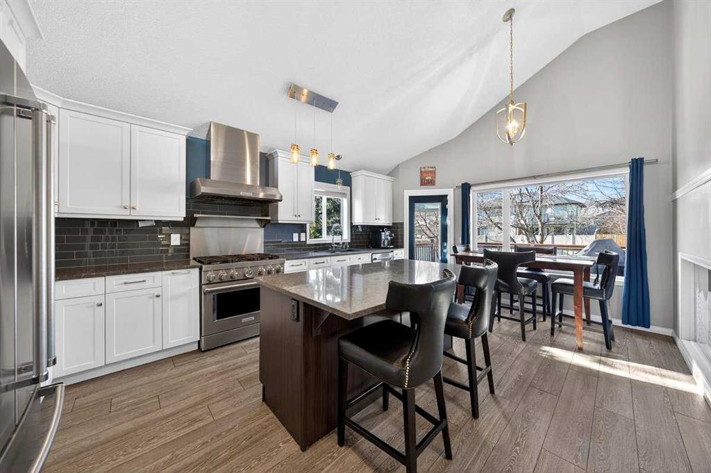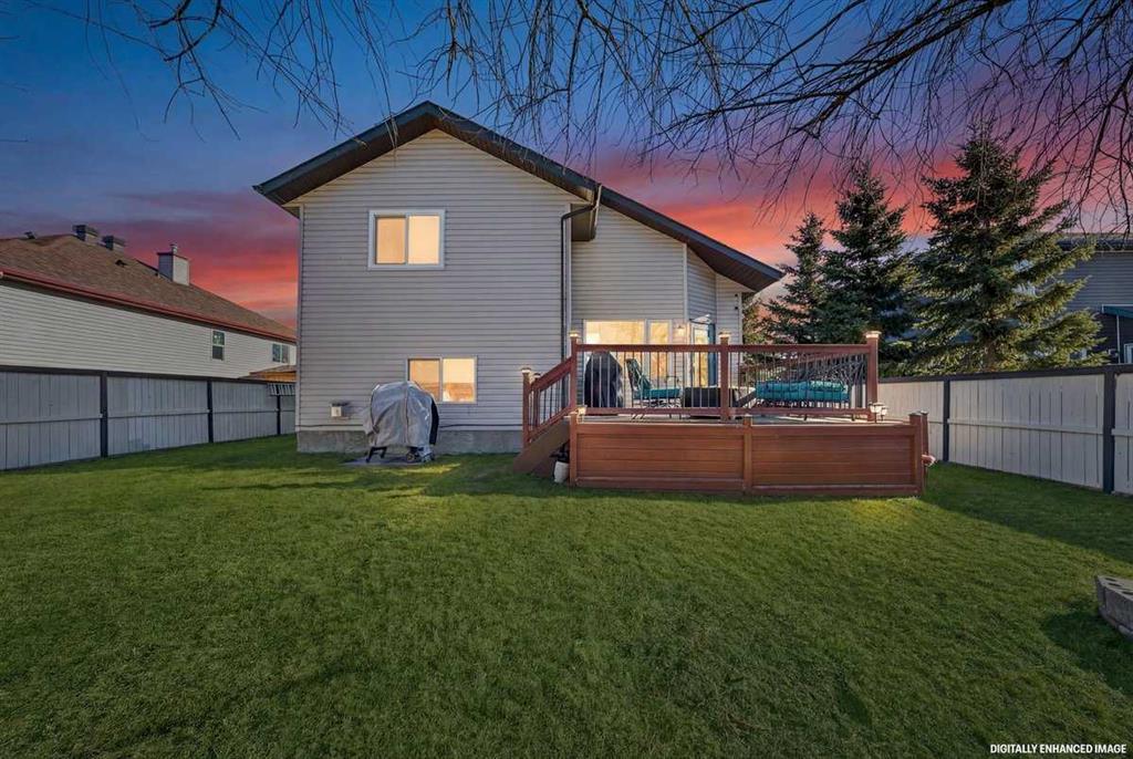 Welcome to this beautifully upgraded 5 bedroom, 2.5 bathroom split-level in the charming community of Crossfield, backing directly onto green space for added privacy and views. This home offers incredible value with $30,000 in fully paid solar panels, central air conditioning, and numerous major updates already completed. Inside, you’ll find unique porcelain flooring and new carpet throughout. The renovated kitchen (2020) features new cabinetry, quartz countertops, a large island with under-cabinet lighting, stainless steel backsplash, glass subway tile, and an impressive 36" dual fuel stove with hood fan and heat lamps. The fridge and dishwasher were replaced in 2020, and quartz counters continue into the bathrooms for a cohesive, modern finish. Additional updates include a new roof (2022), 50-gallon hot water tank (2021), garage door and opener (2021), water softener, and garburator. The heated garage also offers hot and cold water taps. Enjoy the maintenance-free deck with natural gas hookup (fire table can be included), a fully fenced yard, and a resin shed for extra storage. A move-in ready home with space for the whole family, premium upgrades, and energy efficiency already in place—this one truly checks all the boxes.