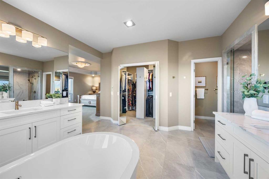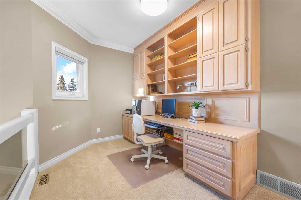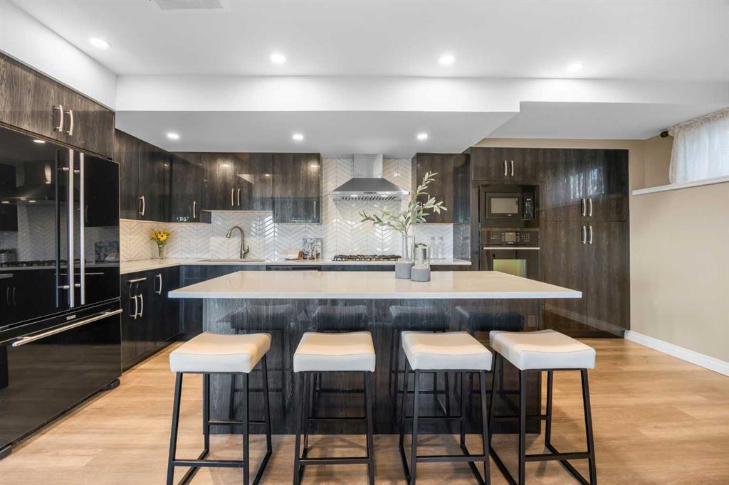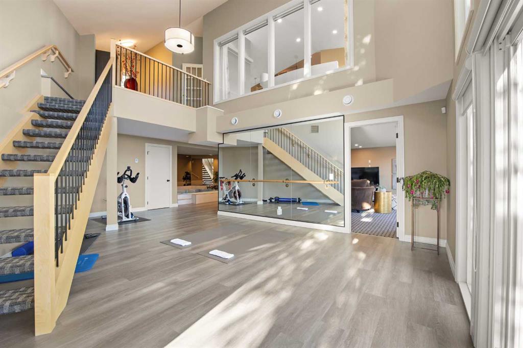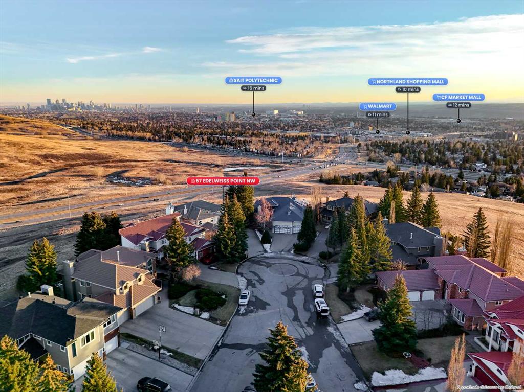 Welcome to the Pinnacle of luxury living at Edelweiss Point, an exclusive hilltop enclave in the prestigious community of Edgemont. This extraordinary 5+2 bedroom, 6 bathroom two-storey walkout estate offers over 6,800 sq ft of refined living space with breathtaking, unobstructed views of Nose Hill Park and Calgary's downtown skyline. Step through double doors to soaring vaulted ceilings and new engineered hardwood flooring throughout the main level, extending into the Living room where walls of windows frame spectacular panoramic views. The Living room opens to a sunny South-East-facing balcony to capture the breathtaking city and sunrise views. A 13-foot ceiling Den with built-in bookcases provides an inspiring workspace. The main level features floor-to-ceiling windows flooding the space with light. The newly renovated white Kitchen boasts quartz countertops, pantry, stainless steel Wolf six-burner gas stove, Sub-Zero fridge, and Bosch dishwasher. The Family room with gas fireplace connected well with the kitchen and Eating Nook, steps out to another Balcony to capture the Views. The elegant formal Dining room features French doors and recessed ceiling. A bedroom with cheater door to 3-piece bath offers guest or office flexibility, and the triple attached garage completes this level. Extensively renovated (2023-2024): all Poly-B are replaced, Navien boiler system, and updated bathroom fixtures. On the upper level, a loft with built-in desk provides versatile space for study. The luxurious Primary bedroom features a cozy seating area with gas-lit fireplace positioned perfectly for enjoying breathtaking views through large windows. The newly renovated 5-piece ensuite bath featuring heated floors, skylight above freestanding soaker tub, separate double vanity, oversized tiled standing shower, and walk-in closet. Three additional well-sized bedrooms complete this level—two share a Jack-and-Jill bathroom, while the other one has a cheater door to another full bath. All upper bathrooms updated (2023-2024). The fully finished walkout basement (2021) with renovated kitchen and bathroom is designed for entertaining and versatile living. A spectacular highlight is the 19-foot vaulted ceiling gym/dance room with skylight and three large mirrors, perfect for fitness enthusiasts, yoga practice, or dance rehearsals. An indoor jacuzzi room and Recreation room offer additional luxury amenities. A full Kitchen with large island, Living room with gas-lit fireplace, Dining area, and 2 bedrooms with 2 full baths complete this exceptional level. Step outside to your South-East-facing backyard backing onto green space with magnificent views of Nose Hill Park and downtown Calgary. Low-maintenance paved patio gardens and mature landscaping, with direct green space access for peaceful walks. Additional highlights include all windows replaced (2012/2013) and 2 decks with new vinyl (2024). Located in prestigious Edgemont—a rare opportunity at Calgary's most coveted hilltop address.