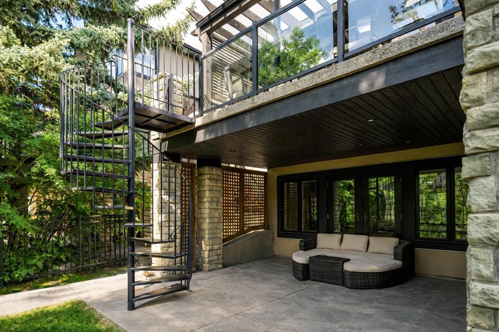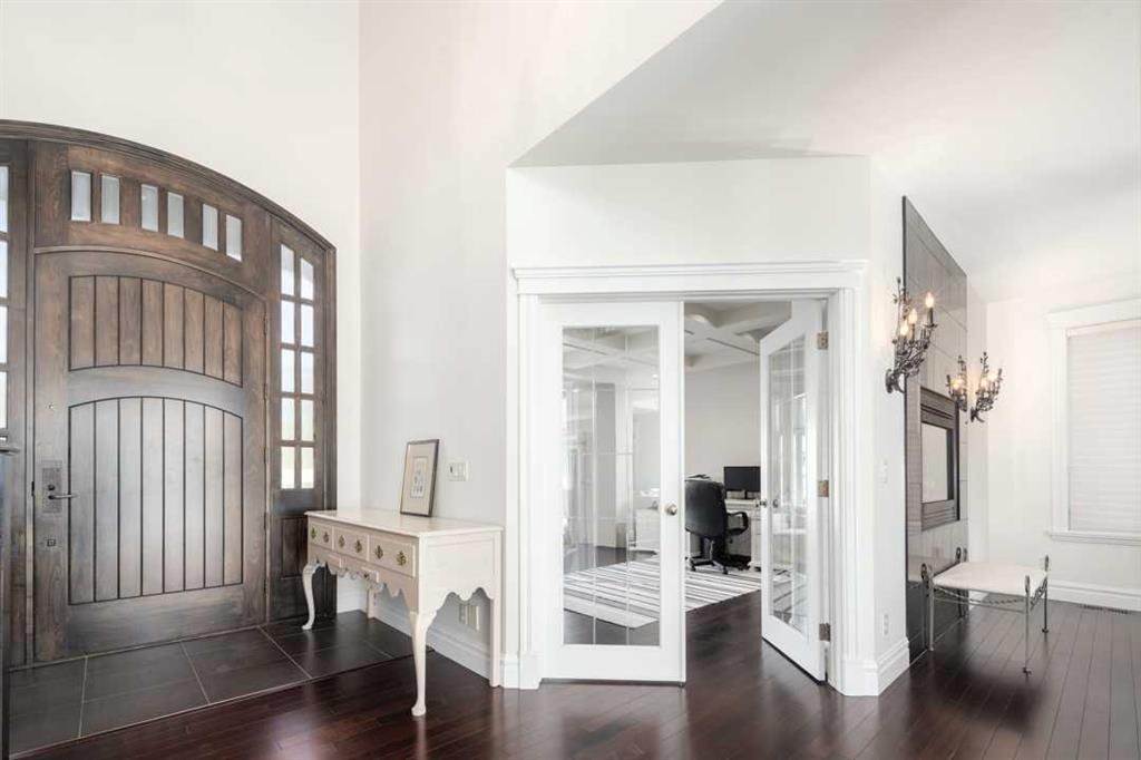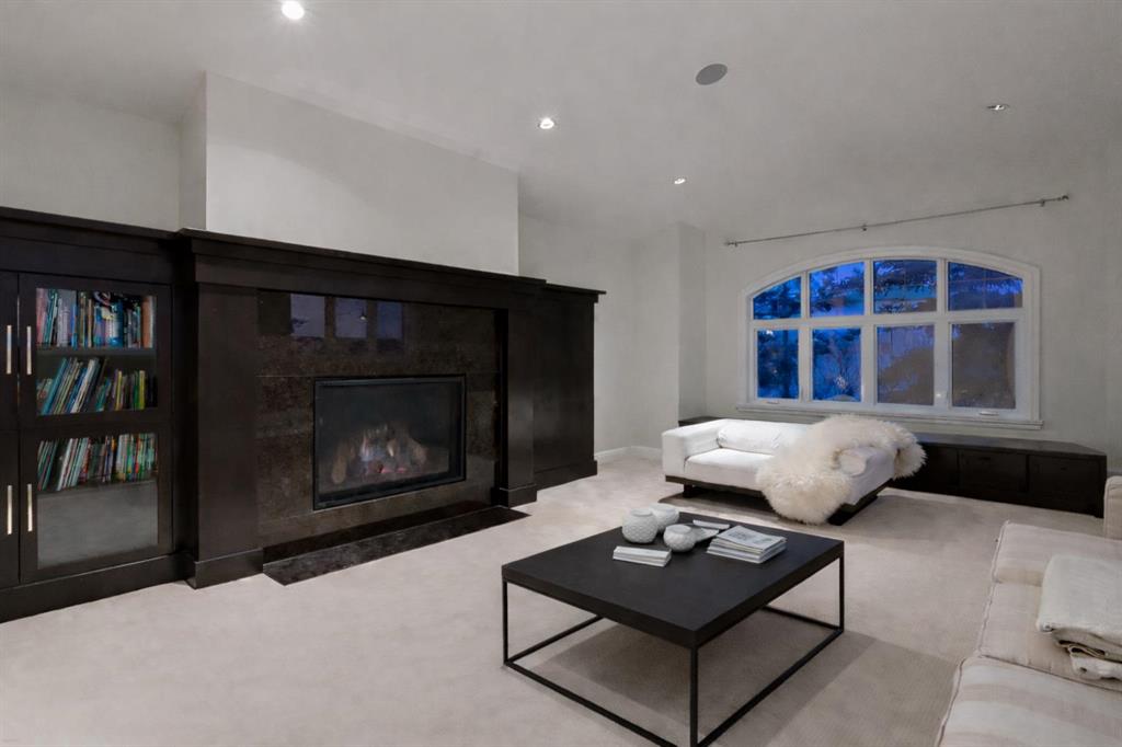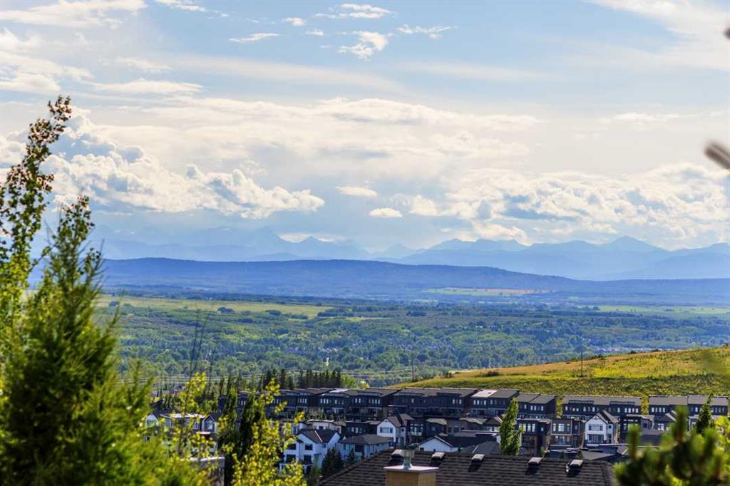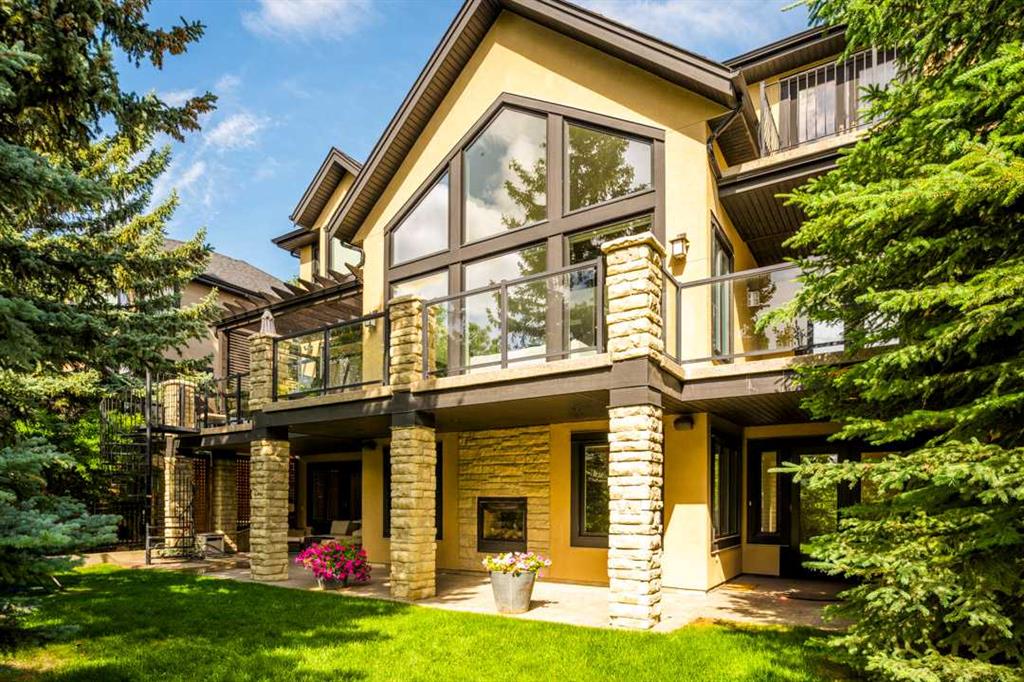 Balanced with natural light, this beautifully crafted family home captures breathtaking West-facing views of the Rocky Mountains, set against a serene, tree-lined backdrop. A timeless custom maple front door creates a warm first impression, complemented by natural stone detailing. Thoughtfully designed with custom-built cabinetry throughout, the home blends elegance with everyday functionality. Inside, a vaulted sitting room immediately draws the eye. Expansive windows frame the views while a sleek floor-to-ceiling fireplace adds contemporary architectural presence. Just off the foyer, a private executive office with French doors and coffered ceilings connects seamlessly to the formal dining room through a double-sided fireplace. The kitchen features Sub-Zero, Wolf, and Miele appliances and flows into a bright breakfast nook that opens onto the west-facing deck—ideal for alfresco dining. Overlooking the private, treed backyard, the pergola-covered deck includes stairs leading to the spacious yard below. A generous walk-through pantry connects to a fully equipped mudroom with extensive storage, a sink, and access to the triple garage. The grand curved wood staircase leads upstairs to three spacious bedrooms and a large flex room. The primary suite offers a private terrace with sweeping Rocky views, his & her custom closets, and an expansive ensuite with heated floors, his & her vanities, and a dedicated vanity area. Above the garage, the inviting flex room features its own fireplace and ample space for media & games. Two additional bedrooms share a 5-piece Jack-and-Jill bathroom with a double vanity, ideal for siblings. A well-appointed laundry room with built-in cabinetry, a sink, and hanging space completes the upper level. The fully developed walkout basement features travertine flooring and radiant in-floor heating throughout. A double-sided fireplace connects the interior family room to the covered exterior deck. This level is designed for versatility, offering a theatre room, bright home gym, additional bedroom, and a 4-piece bath with a steam shower. With a wet bar and private backyard access from two points, the lower-level functions beautifully as a retreat for growing or multigenerational families. Ideally located near Calgary’s top private and public schools—including Rundle College, Webber Academy, and Ernest Manning High School—this home also offers quick access to Westside Rec Centre, Aspen Landing Shopping Centre, and Highway 1 for easy escapes to Banff.