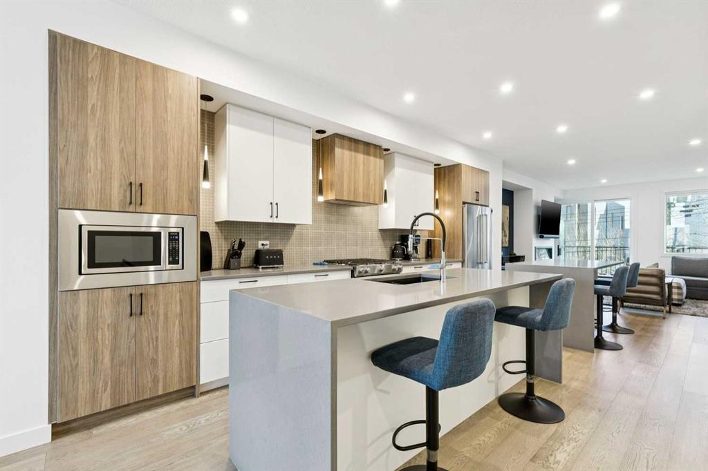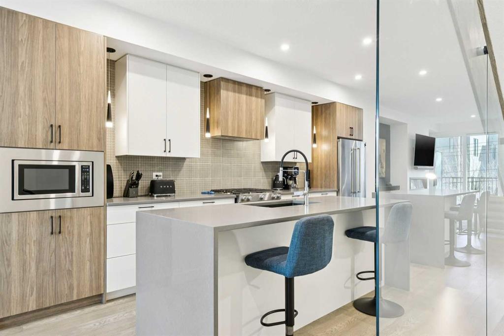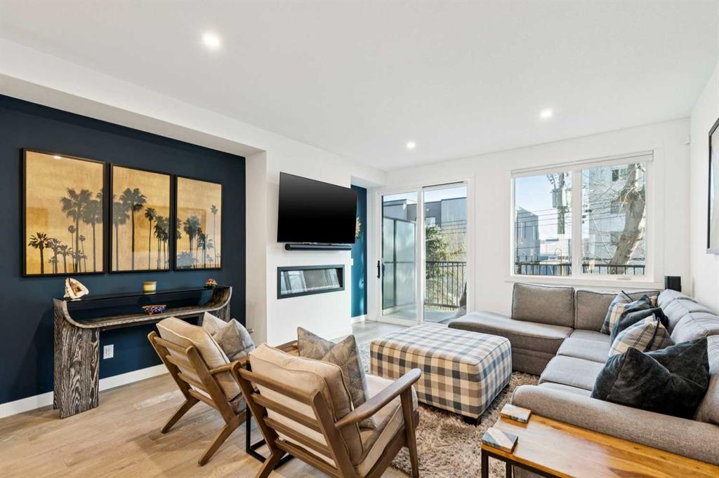 Experience elevated urban living in this stunning luxury townhome offering unobstructed views of Calgary’s downtown skyline. Sitting at 2,648 sq. ft. of thoughtfully designed living space, 3 bedrooms, 3.5 bathrooms, a rooftop loft and patio, a lower-level flex space, and a private yard, this home delivers a rare combination of luxury, space, and versatility. From the moment you arrive, the quality and attention to detail are evident. A west-facing front patio welcomes you in and sets the tone for the seamless indoor-outdoor lifestyle this home was designed for. Inside, the open-concept main floor is ideal for entertaining and features upscale finishes and extensive upgrades throughout. The dining area overlooks the front patio and flows effortlessly into the chef-inspired kitchen, complete with double islands, upgraded backsplash, stainless steel appliances, and exceptional storage. The spacious living room is anchored by a cozy fireplace and opens onto a private back deck with a gas line, perfect for summer grilling and relaxed evenings at home. Completing this level is a powder room perfectly placed adjacent to the kitchen for guests. The second level offers two generously sized bedrooms on each end of the home providing privacy and natural light throughout the day. The east-facing bedroom comes complete with a spacious 5-piece ensuite and the west-facing bedroom has access to the centrally located 4-piece This floor also includes convenient laundry with an upgraded stone countertop and an additional flex space ideal for a home office or reading lounge. The top floor is truly the showpiece. A spacious primary retreat features a walk-in closet and spa-inspired ensuite, while the adjoining upper lounge opens onto the spectacular rooftop patio. Complete with patio lighting and a fire table, this space feels magical and is the perfect setting to enjoy Calgary’s warm summer nights with the downtown skyline as your backdrop. The fully developed walkout lower level adds even more flexibility, offering a tandem attached garage and a bright flex room overlooking the fenced yard, ideal for a home gym, office, or creative studio. Mature trees and upgraded landscaping with stonework and a lower pathway enhance the outdoor experience, while three private patio spaces provide exceptional options for entertaining or relaxing. Additional features include central air conditioning, custom window coverings including blackout blinds in the primary suite, Lux windows throughout, upgraded epoxy flooring and custom garage cabinets, smart home capabilities, and numerous thoughtful upgrades that elevate everyday living. Located steps from trendy shops, restaurants, and cafés and just minutes to downtown, this home offers unmatched walkability without compromising space or luxury.