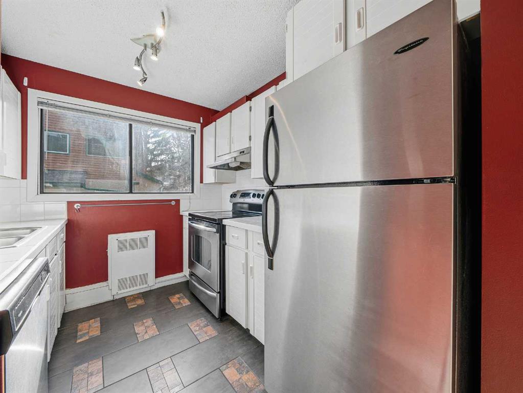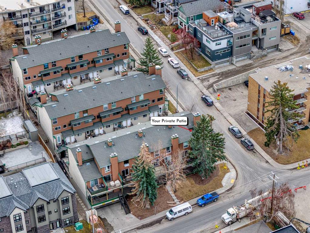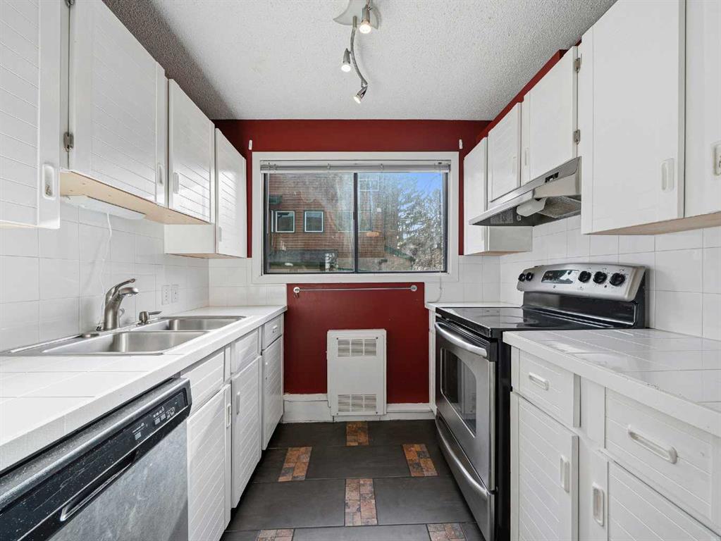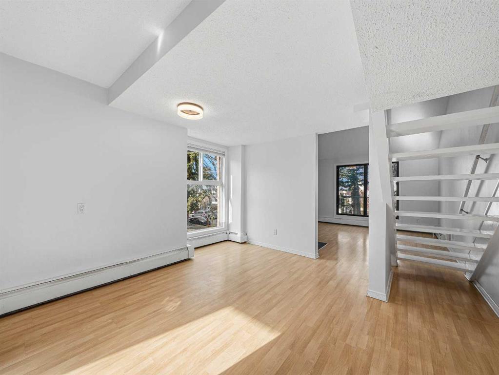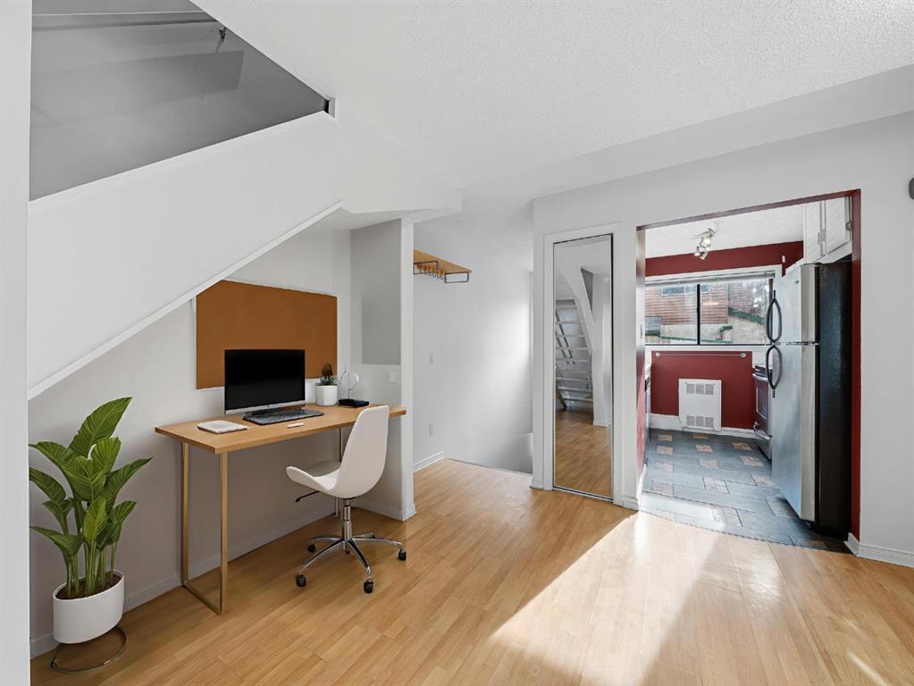 INNER-CITY LIVING WITH DOWNTOWN VIEWS! Welcome to this bright and beautifully refreshed 2-storey stacked townhouse in the heart of Bankview — just steps to 17th Avenue’s restaurants, cafés, nightlife and everyday amenities. From the moment you walk in, the soaring 20-ft cathedral ceiling creates an immediate sense of space. The main floor offers a well sized living area anchored by a cozy corner wood-burning fireplace and double sliding doors leading to your private balcony with views of downtown Calgary — the perfect spot for morning coffee or evening unwinding under the glow of the city lights. The galley-style kitchen features stainless steel appliances, generous cabinetry and excellent natural light, flowing seamlessly into a dedicated dining area and flexible den space ideal for a home office or study nook. Recent upgrades give this home a fresh, move-in ready feel, including new luxury vinyl plank flooring on the stairs and upper level, fresh white paint throughout, updated light fixtures, a new washer and dryer, plus a refreshed bathroom complete with new vanity and modern finishes. Upstairs, the primary bedroom is bright and inviting with a striking floor-to-ceiling corner window. A full 4-piece bathroom and convenient in-suite laundry complete the upper level. Additional features include heated underground parking with private storage — a rare and valuable perk for inner-city living. Whether you’re a first-time buyer looking to get into the market, a student wanting quick access to downtown and transit, or an investor seeking a well-located rental property, this is a smart opportunity in one of Calgary’s most walkable neighbourhoods. Enjoy quick access to Marda Loop, Mission, downtown, public transit, grocery stores, gyms and countless local hotspots — all just minutes from your door. Urban lifestyle. Smart investment. Exceptional value.