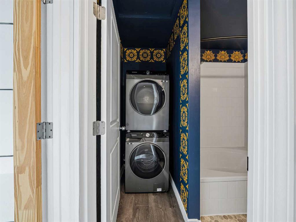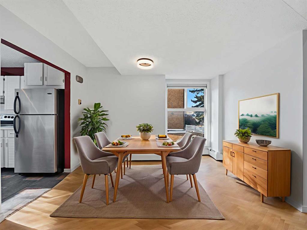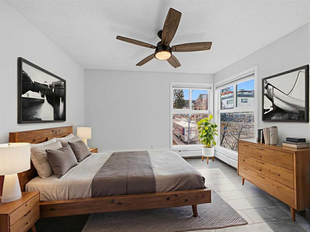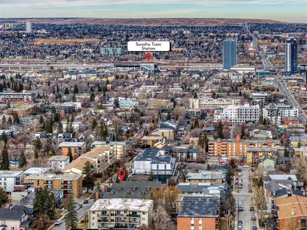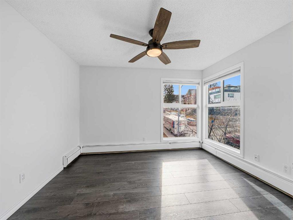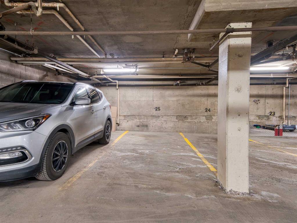 INNER-CITY LIVING WITH DOWNTOWN VIEWS! Welcome to this bright and beautifully refreshed 2-storey stacked townhouse in the heart of Bankview — just steps to 17th Avenue’s restaurants, cafés, nightlife and everyday amenities. From the moment you walk in, the soaring 20-ft cathedral ceiling creates an immediate sense of space. The main floor offers a well sized living area anchored by a cozy corner wood-burning fireplace and double sliding doors leading to your private balcony with views of downtown Calgary — the perfect spot for morning coffee or evening unwinding under the glow of the city lights. The galley-style kitchen features stainless steel appliances, generous cabinetry and excellent natural light, flowing seamlessly into a dedicated dining area and flexible den space ideal for a home office or study nook. Recent upgrades give this home a fresh, move-in ready feel, including new luxury vinyl plank flooring on the stairs and upper level, fresh white paint throughout, updated light fixtures, a new washer and dryer, plus a refreshed bathroom complete with new vanity and modern finishes. Upstairs, the primary bedroom is bright and inviting with a striking floor-to-ceiling corner window. A full 4-piece bathroom and convenient in-suite laundry complete the upper level. Additional features include heated underground parking with private storage — a rare and valuable perk for inner-city living. Whether you’re a first-time buyer looking to get into the market, a student wanting quick access to downtown and transit, or an investor seeking a well-located rental property, this is a smart opportunity in one of Calgary’s most walkable neighbourhoods. Enjoy quick access to Marda Loop, Mission, downtown, public transit, grocery stores, gyms and countless local hotspots — all just minutes from your door. Urban lifestyle. Smart investment. Exceptional value.
