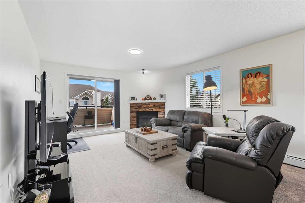 Set in the desirable Springbank area, this corner unit, updated 2-bedroom, 2-bathroom condo delivers an ideal balance of style, comfort, and everyday practicality. Offering over 1,100 sq. ft. of living space, this home has been thoughtfully improved with both recent and past upgrades that ensure it feels fresh, modern, and move-in ready. The spacious, open-concept layout allows for an effortless flow between living, dining, and kitchen spaces. A corner gas fireplace and baseboard heaters create a warm and welcoming atmosphere, while the south-facing balcony draws in abundant natural light. Measuring an impressive 12' x 9'7" , the covered balcony is an inviting retreat for outdoor dining or relaxing in the sun. Equipped with a gas BBQ hookup and a storage room, it extends your living space and enhances functionality. The kitchen has seen stylish updates, including a new countertop, along with a new fridge and microwave range hood fan combo added just last month. Complemented by modern lighting, and a convenient breakfast bar, the kitchen is both practical and appealing. Every room in the unit has been freshly painted, adding to the bright, clean feel. The primary bedroom is a private retreat featuring a walk-in closet and a full ensuite complete with soaker tub and separate shower. The second bedroom is thoughtfully positioned on the opposite side of the unit, offering privacy for guests or family, with a second full bathroom close by. Additional highlights include new in-suite washer and dryer just purchased in December 2025, newer carpeting, updated light fixtures, and fresh details throughout, making the space feel current and well cared for. This property also comes with 2 titled underground parking stalls, an extra storage locker, and access to a secured bike storage room in the parkade. The building itself is well-constructed with a mix of stone and vinyl siding, supported by a durable wood frame, and has been well maintained by a diligent condo board. With quick access to major roadways and the new Ring Road, commuting is straightforward, and the location offers excellent proximity to both city amenities and mountain getaways. This is a fantastic opportunity to own a spacious, upgraded condo in a well-run complex — one that combines convenience, value, and lifestyle. Arrange your showing today and see why this home stands out.