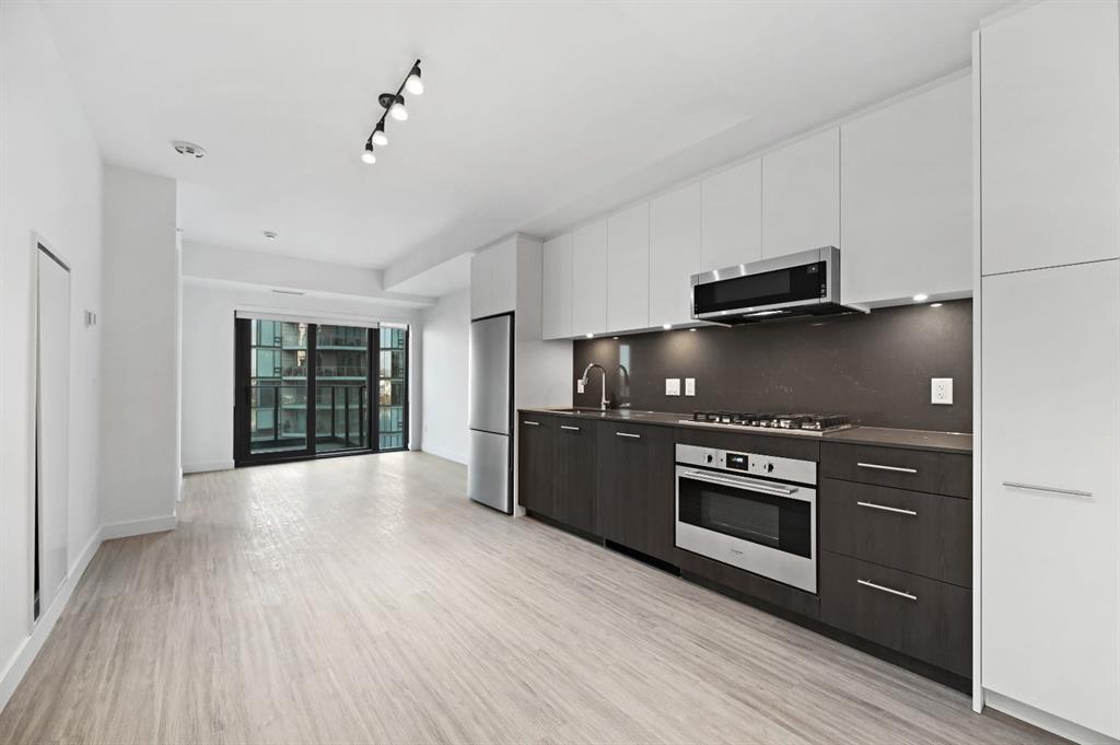 Elevate your lifestyle in this 9th floor residence at First & Park, Eau Claire’s newest luxury condo. This 2 bedroom, 2 bathroom home offers sophisticated design and sweeping north-facing views, creating a calm retreat above the city. The open layout features a modern chef’s kitchen with quartz countertops, integrated appliances, and stylish finishes, flowing seamlessly into a sun-filled living space framed by floor-to-ceiling windows. The primary suite is complete with a spa-inspired ensuite, while the second bedroom and full bath provide comfort for guests, family, or a home office. With titled underground parking and building amenities including: upscale gym & yoga studio (outdoor space beside with gas bbq hook ups), party lounge, modern co-working space and concierge. Step outside and enjoy the best of Calgary’s downtown — the Bow River pathways, Peace River Bridge, Prince’s Island Park, and vibrant dining and shopping are just moments away. Perfect for professionals, downsizers, or those seeking a lock-and-leave lifestyle, this is urban living at its finest. Packages available for FURNISHED UNITS!
