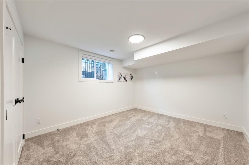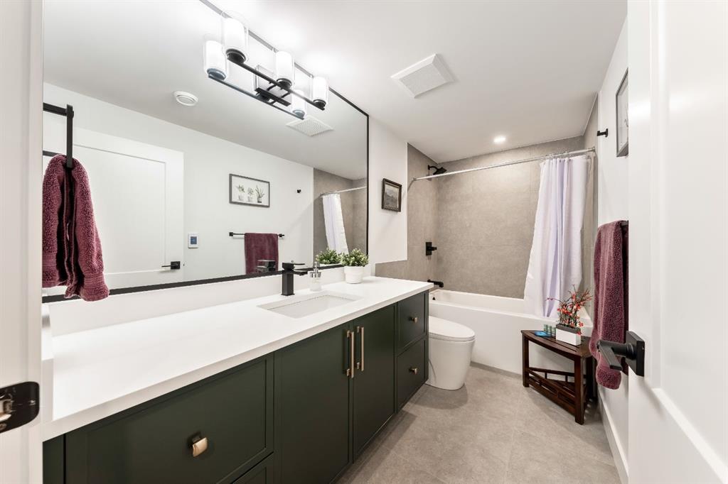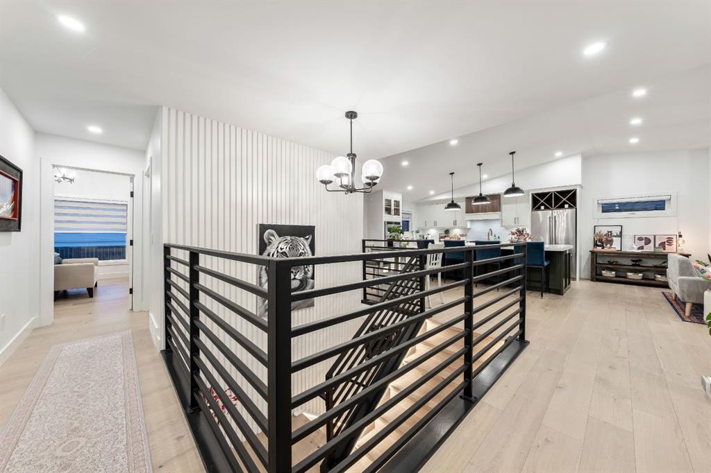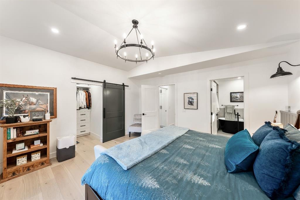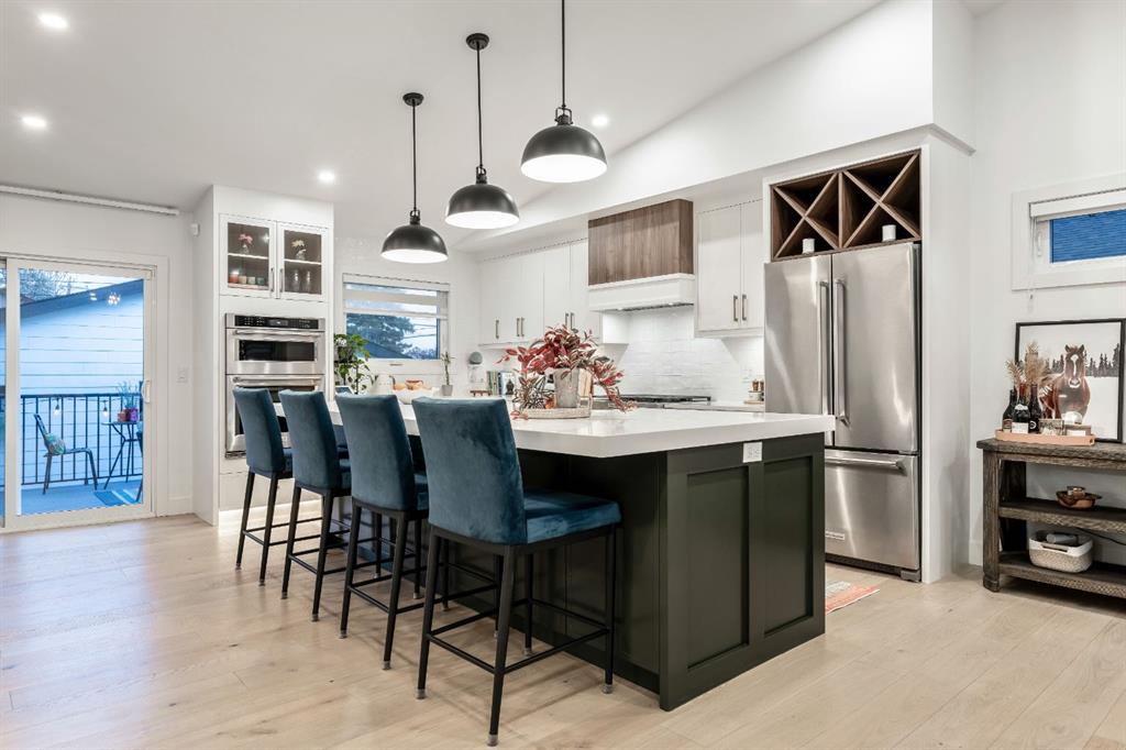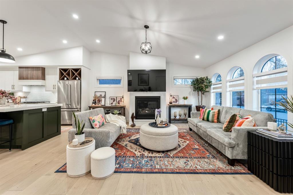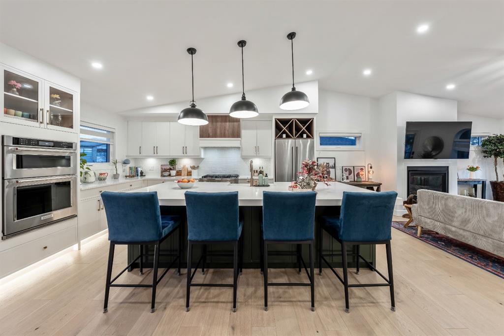 Welcome to this exceptional, fully renovated bungalow in the highly sought-after community of Wildwood—an outstanding opportunity for buyers looking for a truly move-in-ready home with timeless style and modern comfort. This property showcases a refined blend of contemporary finishes and classic architectural details, creating warmth and character rarely found in newer construction. Mature willow trees and professionally designed landscaping frame the approach, while new springline windows and premium Hardie board siding enhance the home’s striking exterior as you step through the charming brick archway onto the inviting front porch. Inside, the home has been thoughtfully reimagined with both front and rear additions, resulting in an expansive and functional layout. Vaulted ceilings, upgraded lighting, and beautiful white oak flooring highlight the bright, open-concept main level. Elegant arched windows flood the living space with natural light, drawing attention to the cozy gas fireplace that anchors the room. The kitchen is a true centrepiece, featuring a substantial quartz island, farmhouse sink, designer pendant lighting, custom hood fan, and a full KitchenAid stainless steel appliance package. Crisp white cabinetry and backsplash selections create a clean, sophisticated aesthetic ideal for both everyday living and entertaining. The adjoining dining area opens seamlessly to the rear deck through sliding glass doors, offering effortless indoor-outdoor flow. A sliding barn door reveals a beautifully designed mudroom complete with herringbone tile flooring, custom built-ins, a feature shiplap wall with bench and hooks, and floor-to-ceiling cabinetry surrounding the rough-in for a washer & dryer. Down the hall, the spacious primary suite offers a peaceful retreat with vaulted ceilings, a feature accent wall, and a custom walk-in closet with extensive built-ins. The spa-inspired ensuite includes dual sinks, a freestanding soaker tub, a rainfall shower with bench, heated floors, and floating vanities—luxurious details that elevate everyday living. The second primary bedroom also features its own walk-in closet and private ensuite, making it ideal for guests or multigenerational living, while the stylish powder room completes the main level. Fully developed basement offers a comfortable lounge atmosphere with plush carpeting, a recreation area with wet bar, two additional bedrooms with walk-in closets, a fourth bathroom, and an additional well-appointed laundry space. Extensive upgrades include new subfloors, trusses, furnace, air conditioning, plumbing, electrical, and more—providing peace of mind for years to come. A double detached garage is located off the rear alley, and utilities have been relocated underground for added functionality and curb appeal. Situated near parks, schools, and the many amenities along Bow Trail—with downtown Calgary just minutes away—this beautifully renovated bungalow offers the perfect balance of location, lifestyle, and luxury.