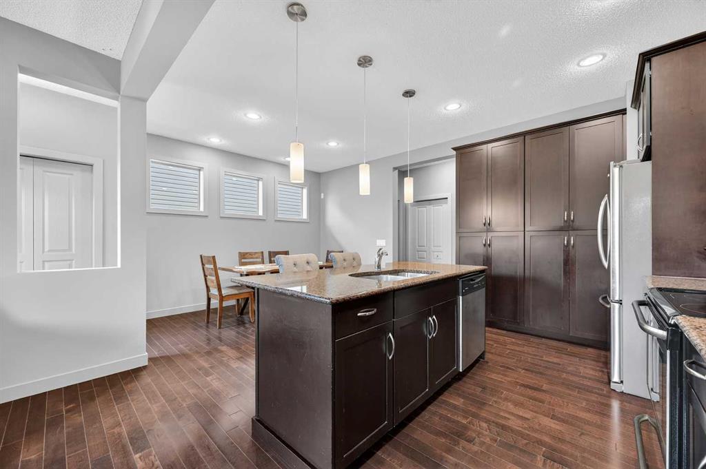JEWEL BOX OF A DEAL | CHAPARRAL VALLEY | NATURE & LUXURY COMBINED Welcome to a truly exceptional home where lifestyle meets location in the heart of Chaparral Valley—just steps from Fish Creek Park, the Bow River pathways, Blue Devil Golf Course, ponds, playgrounds, and an abundance of green space. This custom-crafted home offers over 1,629 sq ft of beautifully designed living space, 3 bedrooms plus a main-floor den, 2.5 bathrooms, and stunning views that create a peaceful retreat in an urban setting. The thoughtfully designed open-concept main level is ideal for modern family living and effortless entertaining. Soaring 9’ ceilings on both the primary enhance the spacious feel, while extra windows flood the interior with natural light. The chef-inspired kitchen is the heart of the home, featuring rich dark-stained shaker cabinets extended almost to the ceiling, granite countertops, a large central island with an eating bar, a wall pantry, a full-height tile backsplash, and upgraded stainless steel appliances. Overlooking the dining area and cozy great room with a gas fireplace, the main floor also includes a private front-facing den—perfect for a home office, reading room, or play area. Upstairs, you'll find a spacious primary suite with a private ensuite including a separate tiled shower, long vanities, and a supersized walk-in closet. Two additional bedrooms, an upper-floor laundry room, and a second full bathroom complete this well-planned level. Step outside to your backyard oasis, a sunny and private west-facing yard with a detached garage, low-maintenance landscaping, a raised BBQ deck, and a lower patio - all perfect for relaxing, entertaining, or family fun. Curb appeal is top-notch, featuring wood column accents, stone detailing, upper front verandah and a covered front porch that warmly welcomes guests. Additional upgrades include: Hardwood floors Modern lighting and plumbing fixtures Granite countertops Custom baseboards, doors, and trim Unspoiled basement with great development potential Located near schools, shopping, restaurants, public transit, and the South Health Campus in Seton, this home is a must-see for families, professionals, or anyone seeking a lifestyle rooted in both nature and convenience. Don’t miss your chance to view this one-of-a-kind property—call your friendly REALTOR® today for a private tour!