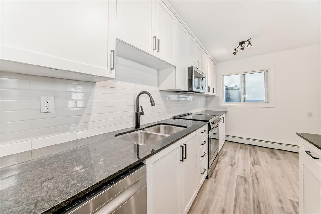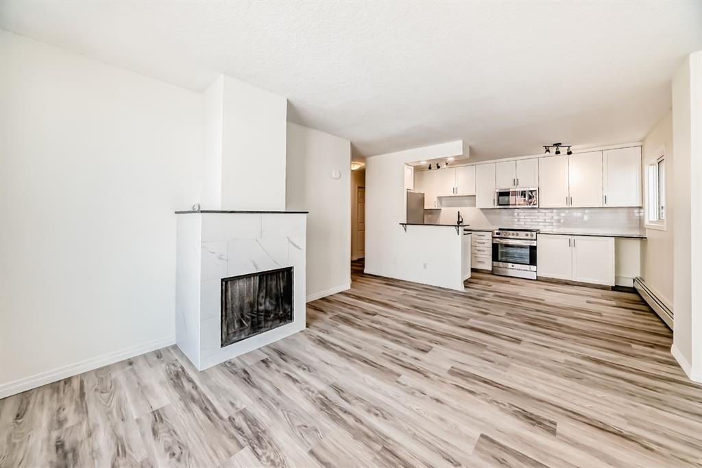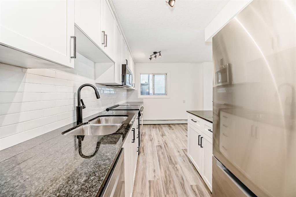 Presenting a turn-key opportunity at Larch Manor: a top-floor residence that has been updated to offer immediate comfort and sophisticated urban living. Upon entry, you are welcomed by fresh paint and brand new luxury vinyl plank flooring that flows seamlessly throughout the open concept layout. The recently renovated kitchen is both functional and refined, featuring full-height cabinetry, gleaming granite countertops, and a suite of brand new stainless-steel appliances highlighted by an induction convection stove. The adjacent living room is generously proportioned and opens onto a private patio where you can enjoy picturesque views of the Calgary Tower and downtown skyline. The home offers two spacious bedrooms, a well-appointed 4-piece bathroom, and the added convenience of a large storage room that discreetly houses a European combination washer and dryer. Beyond the interior, this home boasts one of the most desirable parking stalls in the complex—fully covered and positioned directly at the back entry for unparalleled ease of access. Situated just two blocks from the heart of 17th Avenue, Larch Manor places you moments from Calgary’s finest boutiques, dining, and lifestyle amenities, all while maintaining an impressive walkability score and effortless connectivity to the rest of the city. Ideal for the discerning first-time buyer or anyone seeking a truly move-in ready home, this property is a rare find. Contact your favourite agent to schedule your private viewing.