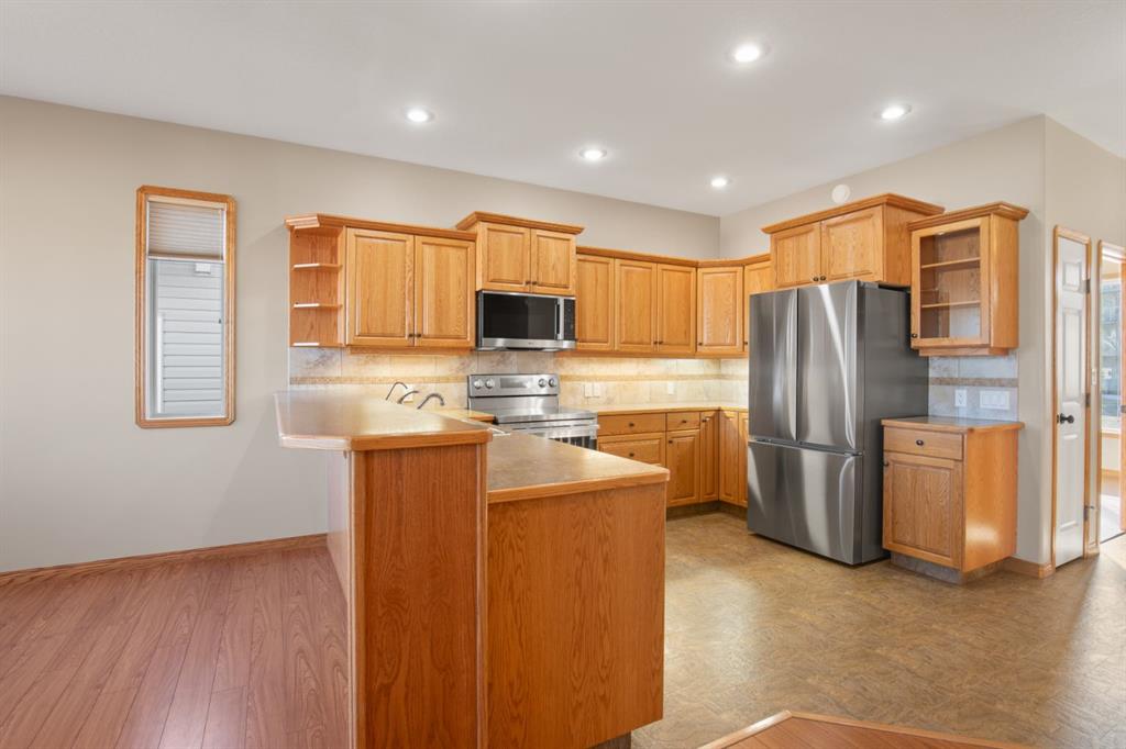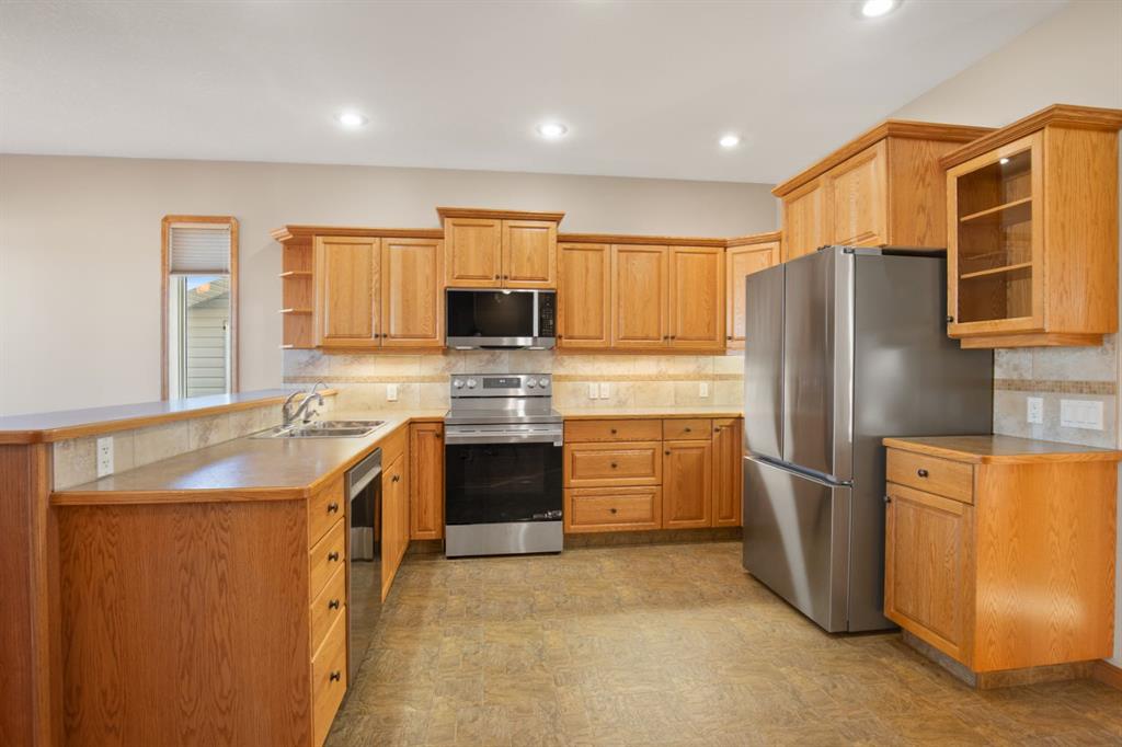 This spacious lovingly cared for 1444 sq foot bungalow will impress you with its excellent design and use of space. An executive office is conveniently located at the entry of the home. The office could also make a fifth bedroom. The open floor plan has the kitchen looking onto the great room. The gas fireplace can be enjoyed from the kitchen, dining area & great room. The kitchen has brand new stainless steel appliances, a pantry + an abundance of quality cabinets and countertop space. The dining area can accomodate a large dining set, it leads out to the deck and good sized well cared for yard. The yard has a garden spot + space for RV parking. You'll appreciate the easy care laminate and lino flooring throughout the main floor and the soaring 9 foot ceilings.. The spacious primary bedroom can accommodate large furniture + it offers an ensuite with a tub/shower combo.There is a second bedroom on the main level. Laundry is conveniently located on the main level making this ideal for those looking for main floor living. The lower level was professionally completed to the same high standard as the upper floor. It has newer plush carpeting. This area is made for entertaining with its super sized family room offering plenty of space for a media area and a games area where a pool table could fit. There are 2 additional large bedrooms + a full bathroom. For your comfort there is in- floor heating. The attached double garage has a gas line roughed in.The location offers excellent walkability to the Co-op for groceries, coffee shops and other amenities. It offers easy access in and out of the city. The sellers state the neighborhood is very community minded with many of the neighbours meeting weekly for coffee + they host an annual BBQ. If you're seeking a meticulously cared for home in a neighbourhood where neighbours get to know one another & look out for each other, this may be just the property for you!