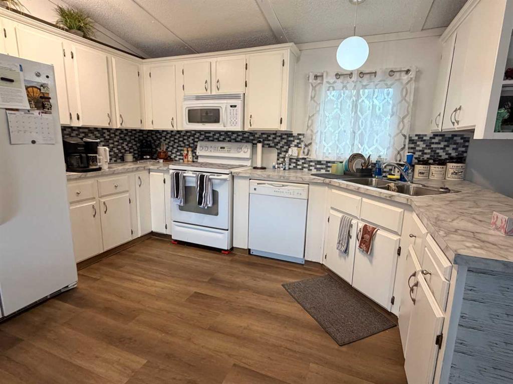 Welcome to this 1,200 sq ft mobile home on it's own lot! The open concept vaulted ceiling, living/kitchen/dining areas make it ideal for everyday living. On one end you'll find a nice size primary bedroom with ample closet space and a 4 pc ensuite with soaker tub. Off the living room is another bedroom with a built in desk that could be used as an office, down the hall you'll find the third bedroom and 4pc bathroom. Plenty of updates have been done throughout the home including paint from one end to the other, removing old skylights, and replacing shingles in 2023, water tank in 2024, a built in microwave installed, water taps, plumbing, commercial grade heat tape underneath and the list goes on. Enjoy the comfort of high efficient furnace, A/C, a covered deck to enjoy most seasons, a natural gas hook up for the BBQ, plenty of parking space in the back, 2 sheds and a fully landscaped yard. This home is a few steps from LT Westlake and not far from shopping centres as well. If you're in the market for an affordable place to call home, plan to visit this one!