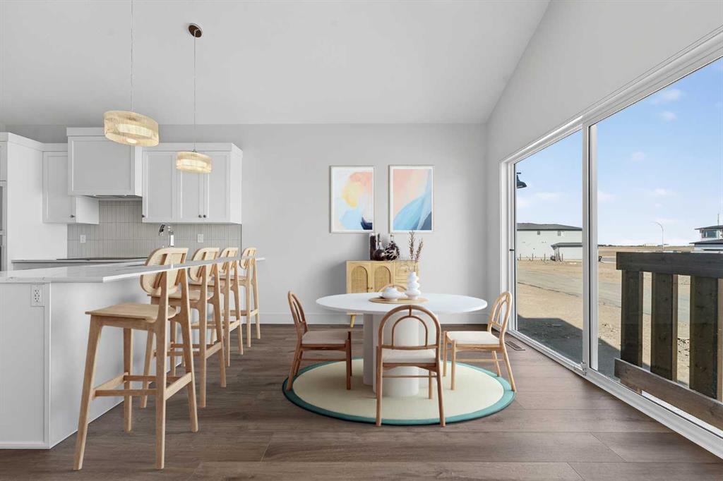 Welcome to the Glenbarr bi-level by Stranville Living Master Builder, located in the exciting new community of Blackwolf, just a short two-minute walk from Legacy Park — and when I say close, I mean you can grab your skates or pickleball paddle and be there in no time. Legacy Park truly is one of the best outdoor spaces in Lethbridge, featuring an outdoor skating rink, pickleball and basketball courts, a skate park, spray park, and beautiful walking paths that wrap around the scenic pond. Living here means your weekends practically plan themselves. Step inside and you’re immediately greeted by the soaring vaulted ceilings that make this home feel bright, open, and far larger than you’d expect. The kitchen is a standout and showcases Stranville’s signature finish quality, complete with a paneled Fisher & Paykel fridge, paneled dishwasher, sleek induction cooktop, built-in oven and microwave, quartz countertops, slow-close cabinetry, and convenient bar seating. It’s modern, clean, and thoughtfully designed for both everyday living and entertaining. Just off the kitchen is the dining area, positioned perfectly beside sliding glass doors that lead out to your future deck — an ideal extension of your living space during the warmer months. The adjacent living room features an oversized window that floods the main floor with natural light, creating a warm and inviting atmosphere. This level also includes two generously sized bedrooms along with a well-appointed four-piece bathroom, offering flexibility for family, guests, or a home office setup. Upstairs, you’ll find the laundry conveniently located near the private primary retreat. The primary bedroom continues the vaulted ceiling design and features another oversized window, enhancing the sense of space and light. The ensuite is finished with dual vanities, a walk-in shower, and an impressive 11-foot-long walk-in closet that provides plenty of storage without compromise. With alley access at the rear and Stranville’s elevated finish standards throughout, this brand-new home delivers the perfect balance of thoughtful design, modern style, and an unbeatable location in one of Lethbridge’s most recreation-focused communities. This home is virtually staged.