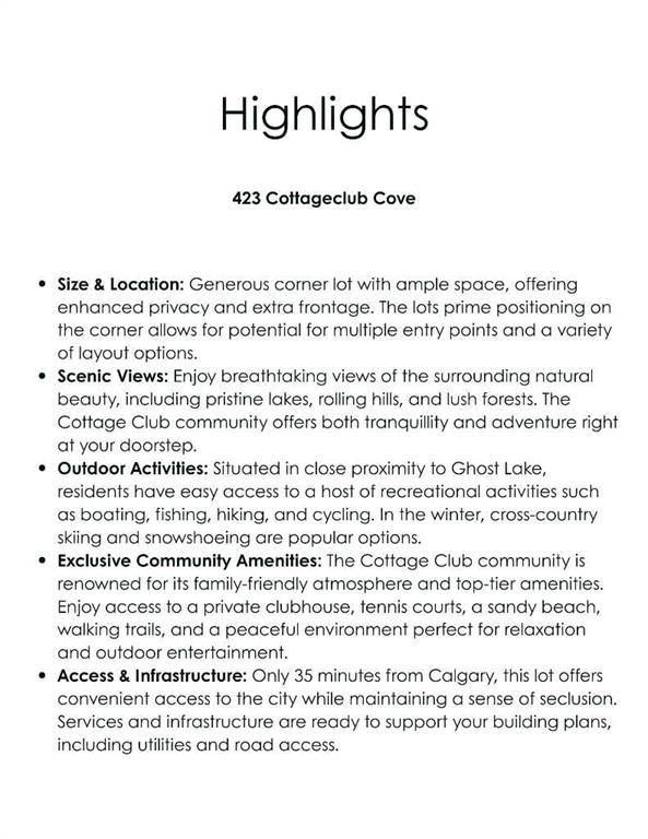 Welcome to an incredible opportunity to own a premium corner lot in the sought-after Cottage Club at Ghost Lake, Alberta. Nestled just a 35 minute drive from Calgary, this stunning location offers the perfect balance of serene lake views, outdoor adventure, and luxury living. Whether you’re looking to build your dream getaway or a full-time residence, this lot provides the ideal canvas for your vision. Property Highlights: Size & Location: Generous corner lot with ample space, offering enhanced privacy and extra frontage. The lots prime positioning on the corner allows for potential for multiple entry points and a variety of layout options. Scenic Views: Enjoy breathtaking views of the surrounding natural beauty, including pristine lakes, rolling hills, and lush forests. The Cottage Club community offers both tranquility and adventure right at your doorstep. Outdoor Activities: Situated in close proximity to Ghost Lake, residents have easy access to a host of recreational activities such as boating, fishing, hiking, and cycling. In the winter, cross-country skiing and snowshoeing are popular options. Exclusive Community Amenities: The Cottage Club community is renowned for its family-friendly atmosphere and top-tier amenities. Enjoy access to a private clubhouse, tennis courts, a sandy beach, walking trails, and a peaceful environment perfect for relaxation and outdoor entertainment. Access & Infrastructure: Only 35 minutes from Calgary, this lot offers convenient access to the city while maintaining a sense of seclusion. Services and infrastructure are ready to support your building plans, including utilities and road access. Why Cottage Club at Ghost Lake? Cottage Club is not just a location; it’s a lifestyle. Known for its welcoming community and recreational offerings, it has become one of the most desirable places to live and vacation in Alberta. Whether youre looking to enjoy a weekend retreat or settle in a peaceful, nature-filled environment, this corner lot is the ideal place to create your future. Don't miss the opportunity to make your mark in one of Albertas most beautiful communities. Contact us today to learn more about this exceptional corner lot in Cottage Club at Ghost Lake.