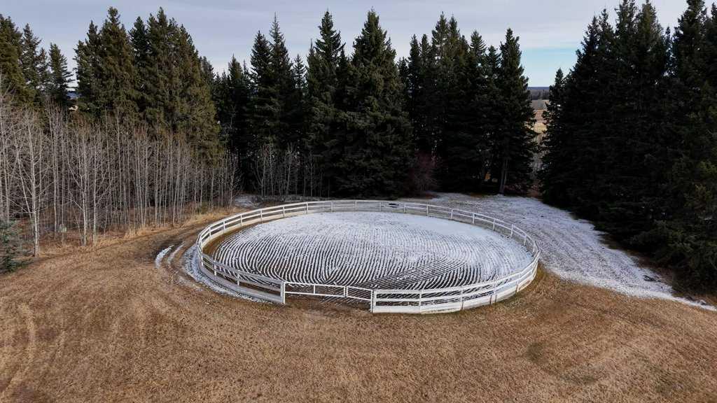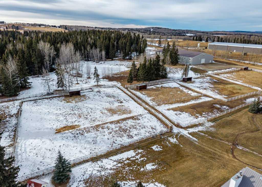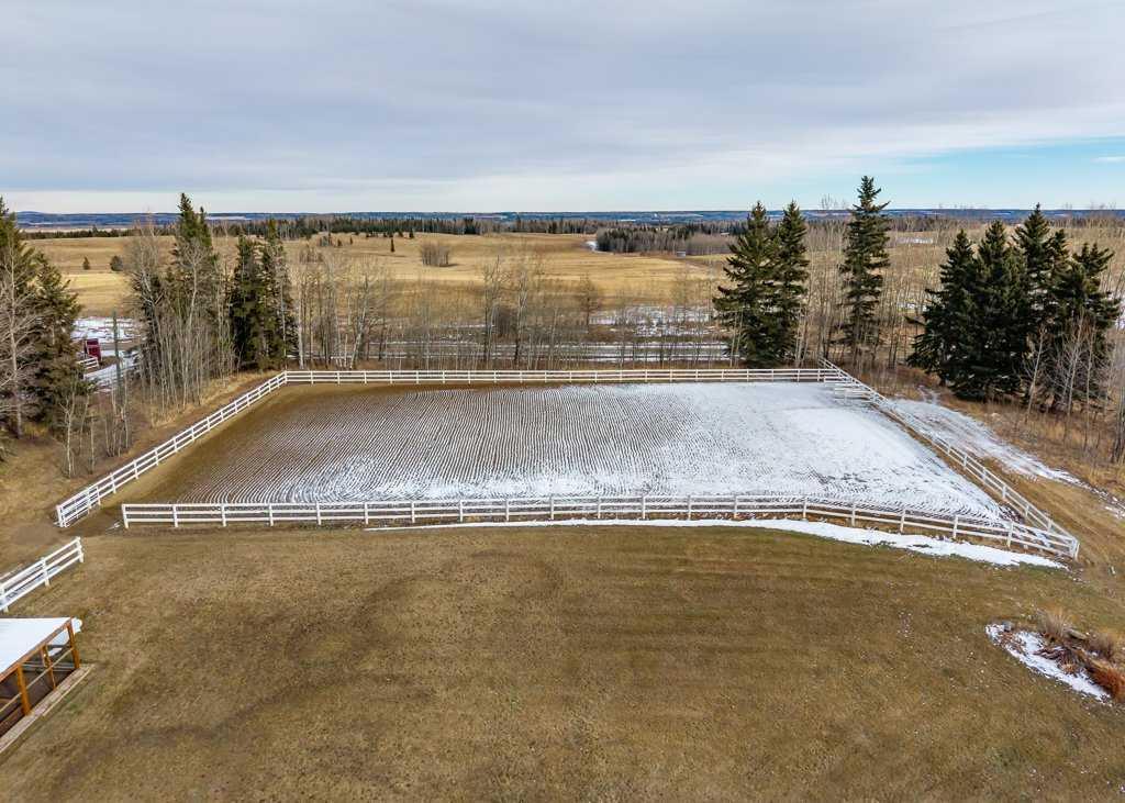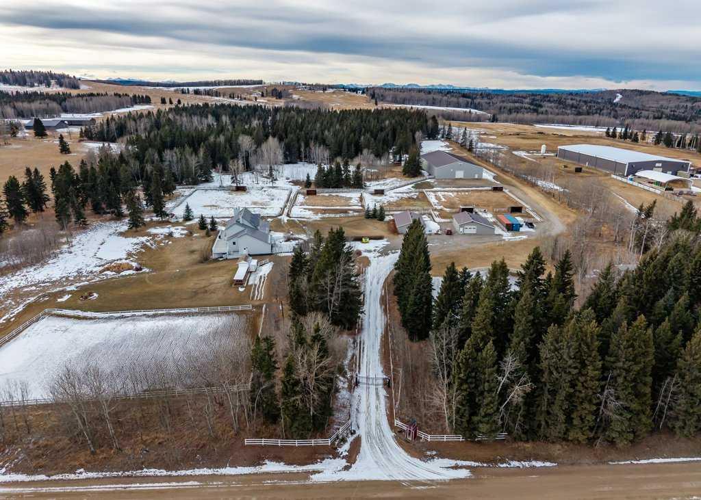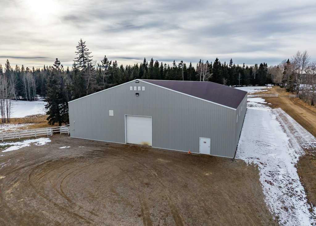 WHISPERING GROVE RANCH || TURN-KEY EQUESTRIAN OASIS Set against a breathtaking backdrop of mature forest & open pasture, this thoughtfully designed 43-acre equestrian estate just west of Bergen offers an exceptional blend of privacy, functionality, and natural beauty. The landscape features treed riding trails, practical paddocks, indoor & outdoor training facilities and a beautifully landscaped yard. A gated entrance creates a strong sense of arrival and provides security, opening to a well-planned yard with ample space for trailers, parking, and turnaround. At the heart of the property is the impressive 84’ x 180’ indoor heated riding arena constructed to commercial standards with premium, dust-controlled footing. South-facing windows provide excellent natural light, while small and large overhead doors, a stripping chute, return alley, spacious tack-up area and spectator viewing deck make the setup ideal for roping and cowhorse work. The heated five-stall barn is equally well appointed with rubber-coated floors, rubber-matted stalls with safety-built walls, and a large tack room featuring a unique 360-degree revolving tack door for efficient daily use. Outdoor facilities include a professionally graded 110’ x 170’ outdoor arena beautifully sheltered by trees, a round pen, and six plank-fenced paddocks, one of which offers direct alley access to the indoor arena. The residence offers timeless appeal with a traditional layout and has been recently painted throughout. A wrap-around deck overlooks the grounds and includes a gas line for BBQs, while the lower patio—wired for a hot tub—creates a private outdoor retreat. The driveway and lower patio feature durable recycled rubber paving. Inside, the main floor includes a generous formal dining room, a spacious formal living room, and a charming south-facing sitting room with a wood-burning river rock fireplace—perfect for sun-filled morning coffees. The expansive kitchen features miles of oak cabinetry, a large island with breakfast bar, gas stove, and patio doors opening to the south deck. A boot room with main-floor laundry includes a GE Profile 2-in-1 washer/dryer combo and provides access to the oversized heated double attached garage. Upstairs are four bedrooms, including a massive primary suite. The fully developed basement with in-floor heat offers a media room, bar area, flex space for a gym or games room, and a fifth bedroom. Additional amenities include a 30’ x 56’ heated and insulated shop, RV gravel pad overlooking a picturesque pond, secluded she-shed and firepit area, and an impressive chicken coop with enclosed outdoor run, divided hen house, and automatic door. The property features a strong drilled well (5 GPM when last tested) and a whole-house reverse osmosis system. This is a rare opportunity to acquire a fully turn-key equestrian estate in an extraordinary forested setting—perfectly suited for ropers and discerning buyers seeking privacy, quality, and a complete rural lifestyle. GST applicable.