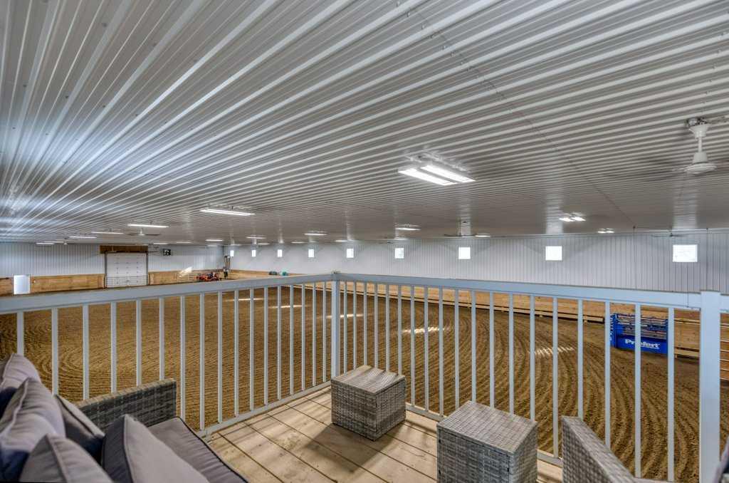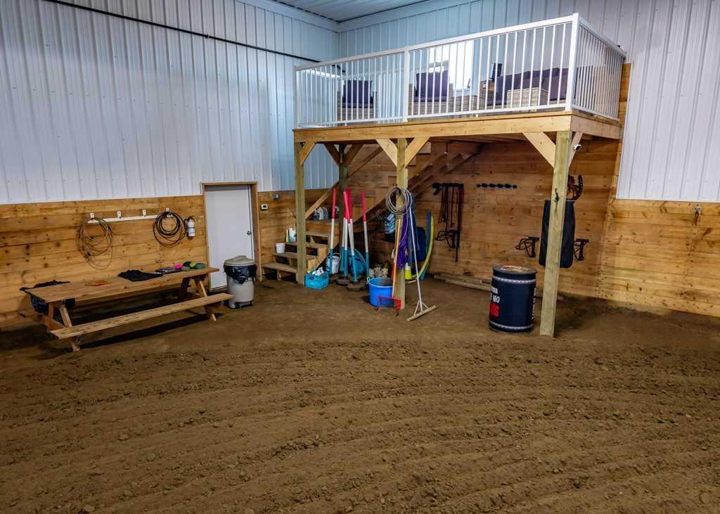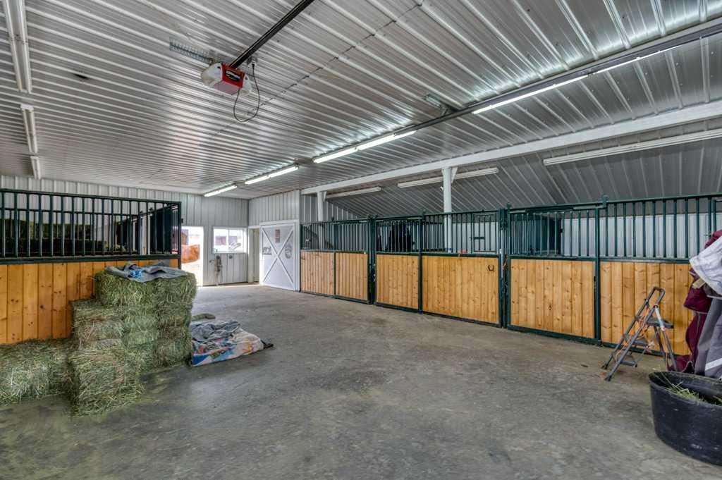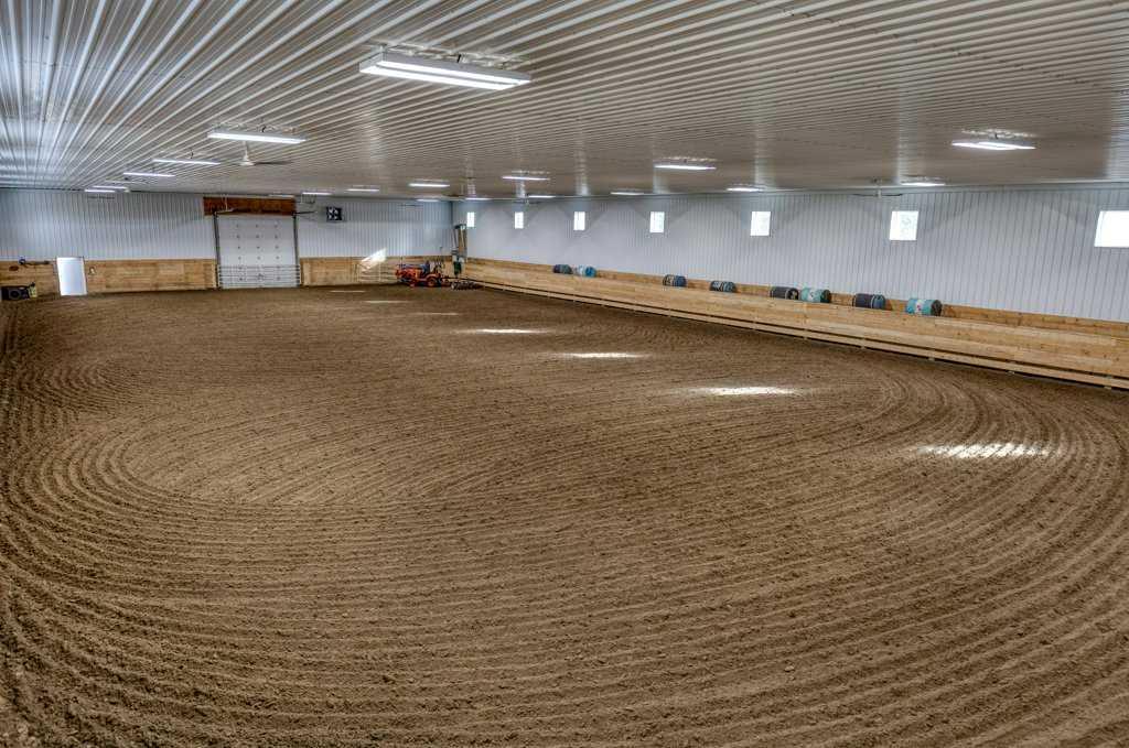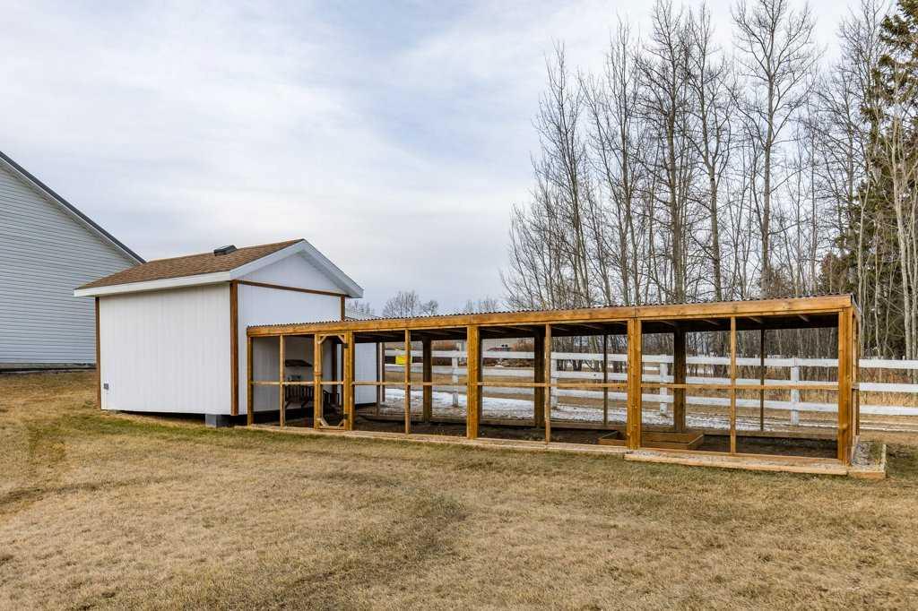 WHISPERING GROVE RANCH || TURN-KEY EQUESTRIAN OASIS Set against a breathtaking backdrop of mature forest & open pasture, this thoughtfully designed 43-acre equestrian estate just west of Bergen offers an exceptional blend of privacy, functionality, and natural beauty. The landscape features treed riding trails, practical paddocks, indoor & outdoor training facilities and a beautifully landscaped yard. A gated entrance creates a strong sense of arrival and provides security, opening to a well-planned yard with ample space for trailers, parking, and turnaround. At the heart of the property is the impressive 84’ x 180’ indoor heated riding arena constructed to commercial standards with premium, dust-controlled footing. South-facing windows provide excellent natural light, while small and large overhead doors, a stripping chute, return alley, spacious tack-up area and spectator viewing deck make the setup ideal for roping and cowhorse work. The heated five-stall barn is equally well appointed with rubber-coated floors, rubber-matted stalls with safety-built walls, and a large tack room featuring a unique 360-degree revolving tack door for efficient daily use. Outdoor facilities include a professionally graded 110’ x 170’ outdoor arena beautifully sheltered by trees, a round pen, and six plank-fenced paddocks, one of which offers direct alley access to the indoor arena. The residence offers timeless appeal with a traditional layout and has been recently painted throughout. A wrap-around deck overlooks the grounds and includes a gas line for BBQs, while the lower patio—wired for a hot tub—creates a private outdoor retreat. The driveway and lower patio feature durable recycled rubber paving. Inside, the main floor includes a generous formal dining room, a spacious formal living room, and a charming south-facing sitting room with a wood-burning river rock fireplace—perfect for sun-filled morning coffees. The expansive kitchen features miles of oak cabinetry, a large island with breakfast bar, gas stove, and patio doors opening to the south deck. A boot room with main-floor laundry includes a GE Profile 2-in-1 washer/dryer combo and provides access to the oversized heated double attached garage. Upstairs are four bedrooms, including a massive primary suite. The fully developed basement with in-floor heat offers a media room, bar area, flex space for a gym or games room, and a fifth bedroom. Additional amenities include a 30’ x 56’ heated and insulated shop, RV gravel pad overlooking a picturesque pond, secluded she-shed and firepit area, and an impressive chicken coop with enclosed outdoor run, divided hen house, and automatic door. The property features a strong drilled well (5 GPM when last tested) and a whole-house reverse osmosis system. This is a rare opportunity to acquire a fully turn-key equestrian estate in an extraordinary forested setting—perfectly suited for ropers and discerning buyers seeking privacy, quality, and a complete rural lifestyle. GST applicable.