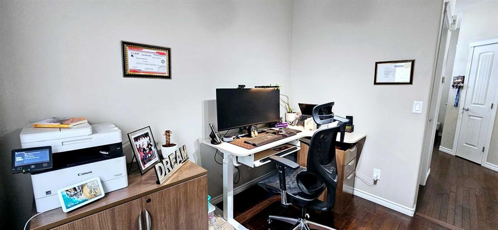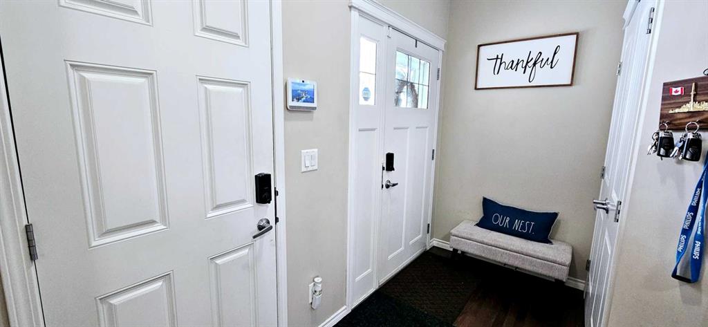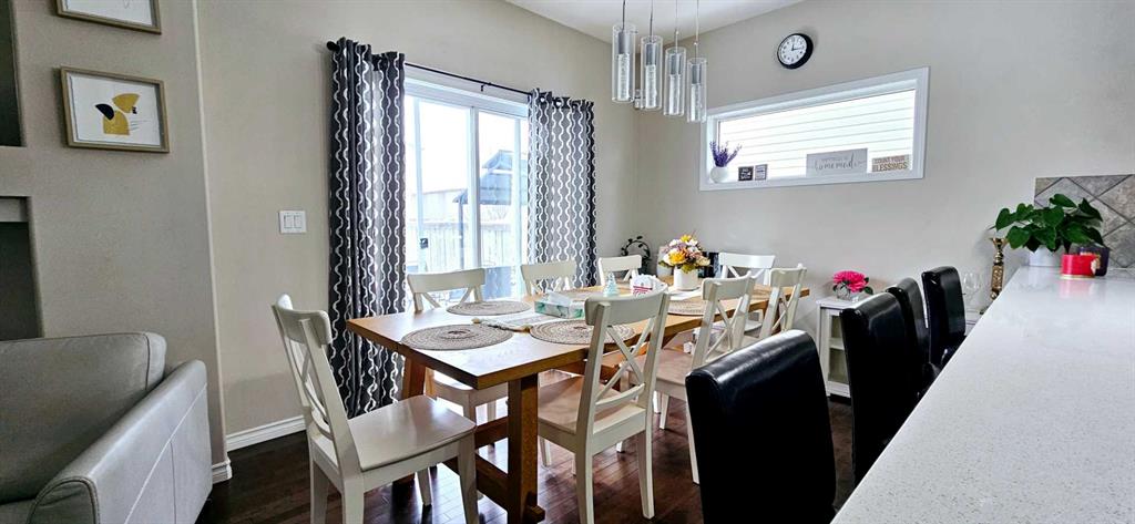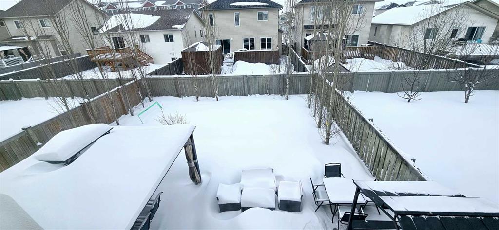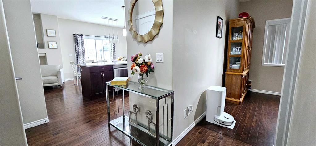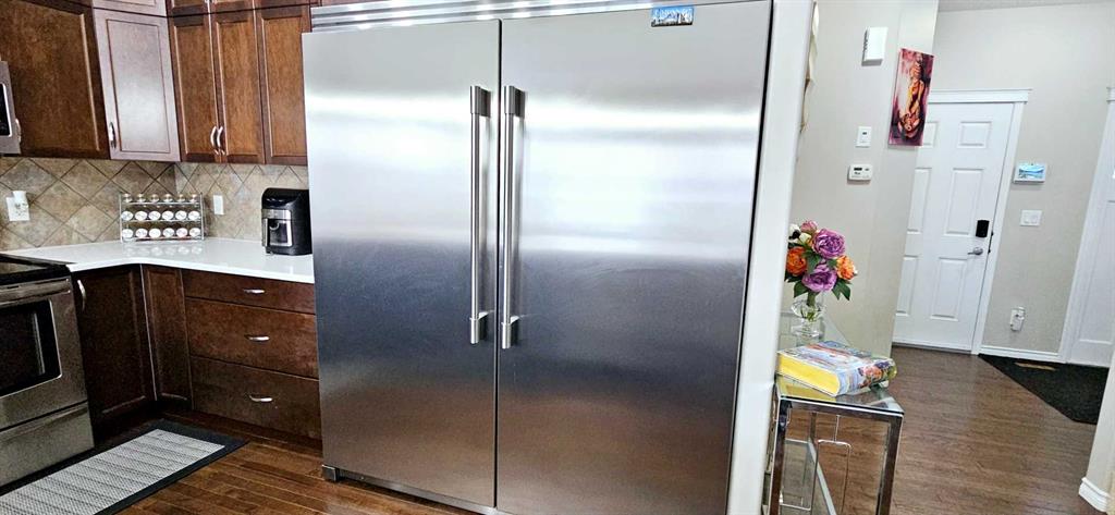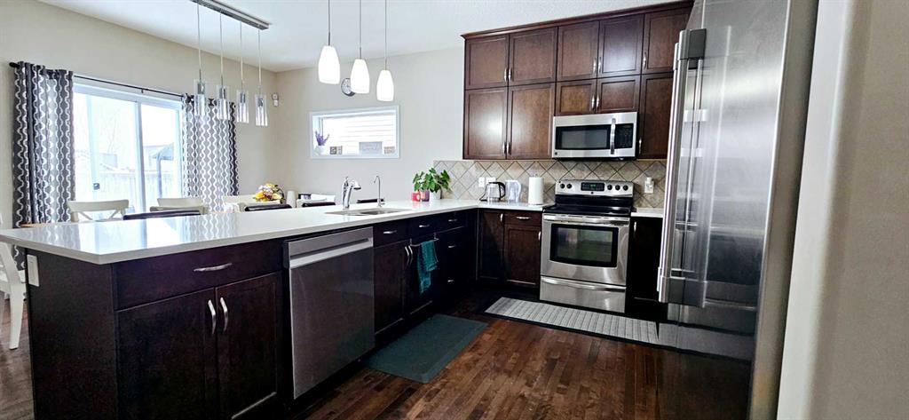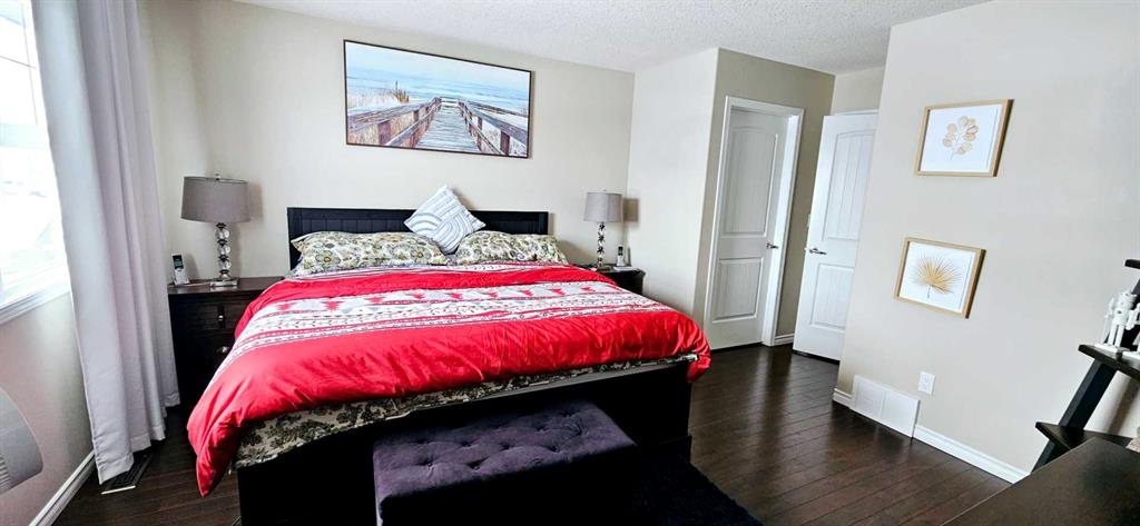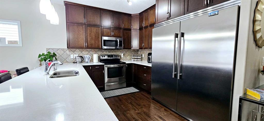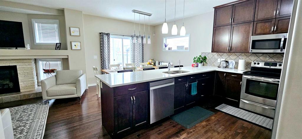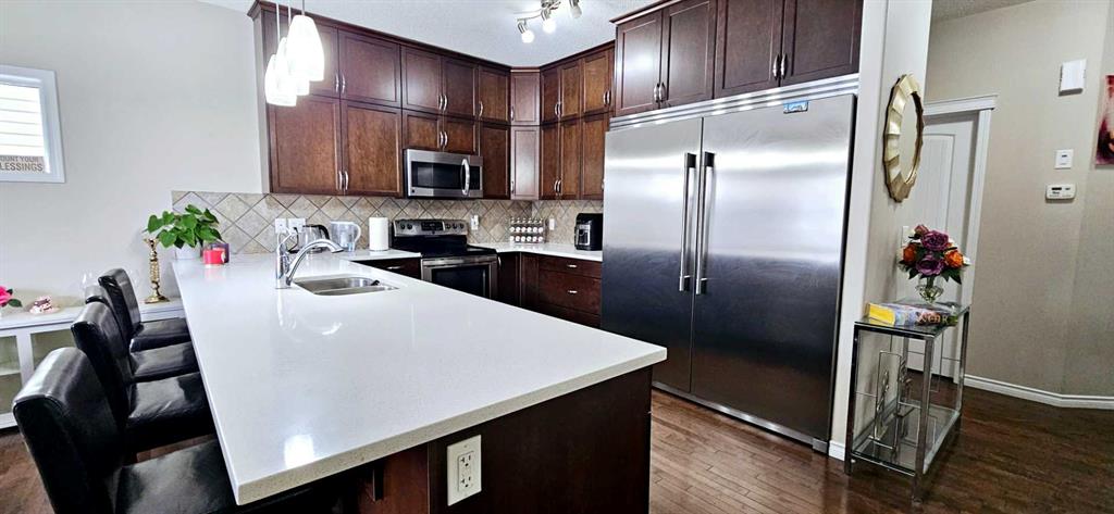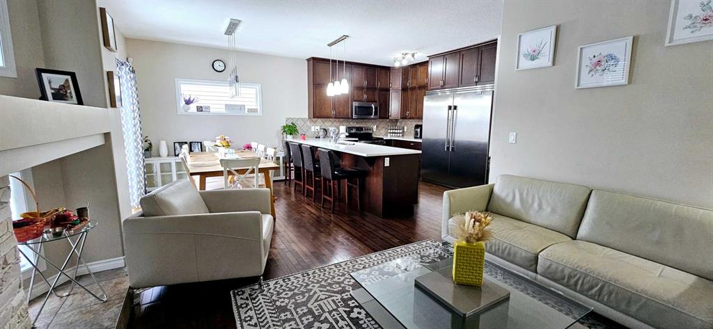 GORGEOUS Fully developed, air-conditioned two-story home in Riverstone, perfectly located close to schools and playgrounds. The amazing kitchen is truly the heart of the home, featuring a GIANT double door fridge/freezer combo, quartz countertops, extensive prep space, and cabinetry that extends all the way to the ceiling for both style and storage. The main floor showcases hardwood throughout, large windows that flood the space with natural light, a cozy gas fireplace, a dedicated office, and a convenient two-piece bathroom. Upstairs offers a spacious primary bedroom complete with a three-piece ensuite and walk-in closet. You’ll also find two additional bedrooms, a full bathroom, and an amazing Bonus family room, perfect for relaxing or family movie nights. The fully finished basement adds even more living space with a rec room, an additional bedroom, full bathroom, laundry room, and plenty of storage. Outside, the west facing yard is beautifully finished and move-in ready, featuring a massive deck, mature trees and is fully fenced This home truly checks every box. Contact your favorite Realtor and take a tour!!