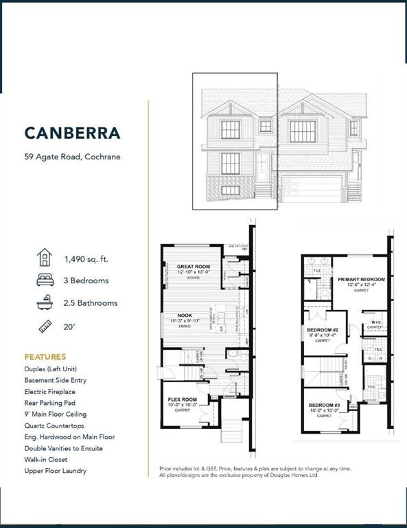 BRAND NEW HOME by Douglas Homes, Master Builder in central Greystone, short walking distance to parks, the Bow River, major shopping & interconnected pathway system. Featuring the Canberra with main floor forward enclosed Flex Room/4th Bedroom & separate side entry on an R-MX zoned home site for POTENTIAL future lower level suite. NOTE: a secondary suite would be subject to approval and permitting by the city/municipality. This gorgeous 3 bedroom, 2 & 1/2 half bath home offers 1490 sq ft of living space. This home is located on a Agate Road which provides immediate access to the Children's Park at the end of the street and easy access interconnective pathway system, perfect for those looking for a outdoor lifestyle. Loads of Designer & upgraded features in this beautiful, open floor plan. The main floor greets you with 8' front door, soaring 9' ceilings, oversized windows, built-in niches & fireplace. Gleaming Hardwood floors flow through the kitchen, hall & nook adding a feeling of warmth & style. At the front of the home you'll find an enclosed bright Flex Room (could also be a main floor bedroom) with 8'0" French Door and storage closet for the work from home crowd. The Kitchen is completed with Quartz Countertops, two tone Kitchen Cabinets, 42" uppers with decorative enclosed bulkhead, plenty of drawers including Pots & Pan drawers, soft close doors & drawers & new stainless steel Kitchen appliance package. Upstairs you'll find a generous Primary Bedroom with Ensuite - Quartz Counters with double vanities, 5' shower with Designer tiled walls & toilet in its own private doored room all completed with ceramic tile flooring & large walk-in closet accessed from the bedroom. The 2nd floor is completed by two good size additional bedrooms, main bath tub/shower combination with tiled walls, window, Quartz countertop, undermounted sink & ceramic tile flooring. You will love the convenience of 2nd Floor Laundry Room for side by side laundry completed with ceramic floor tile. This is a very popular plan, great for young families, investors or the down sizers. Spacious, Beautiful and Elegant! The perfect place for your perfect home. Call today! Photos are from prior build & are reflective of fit, finish & included features. Note: Front elevation of home & interior photos are for illustration purposes only. Actual elevation style, interior colors/finishes, & upgrades may be different than shown & the Seller is under no obligation to provide them as such. Directions: Come to the Show Home first located at 500 River Avenue. Showings only during Show Home hours & days. THIS HOME IS UNDER CONSTRUCTION