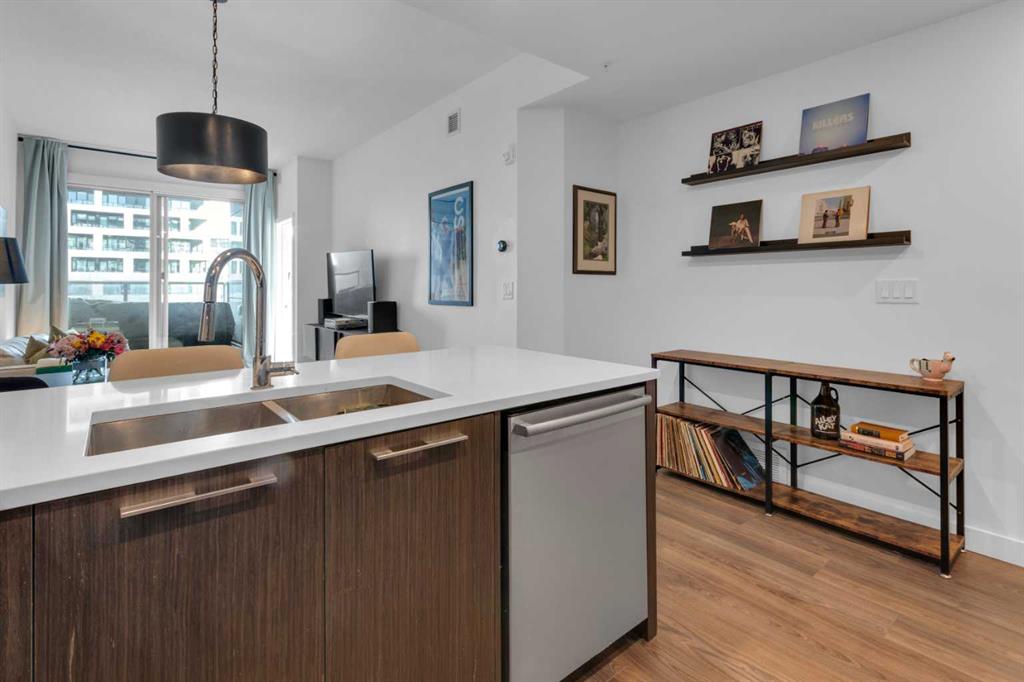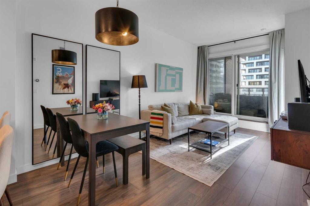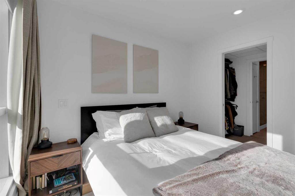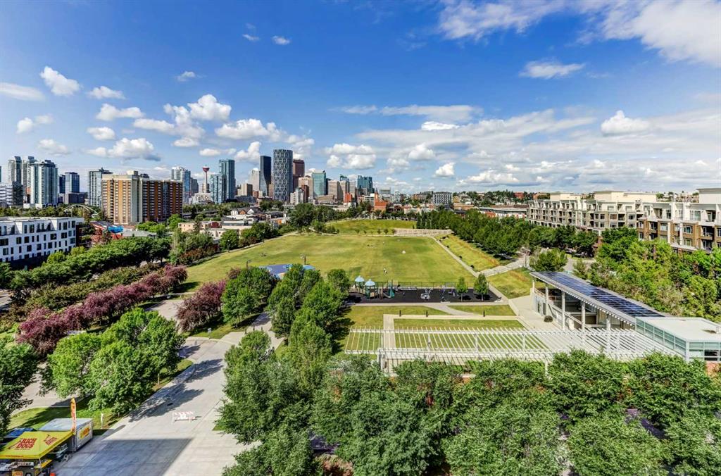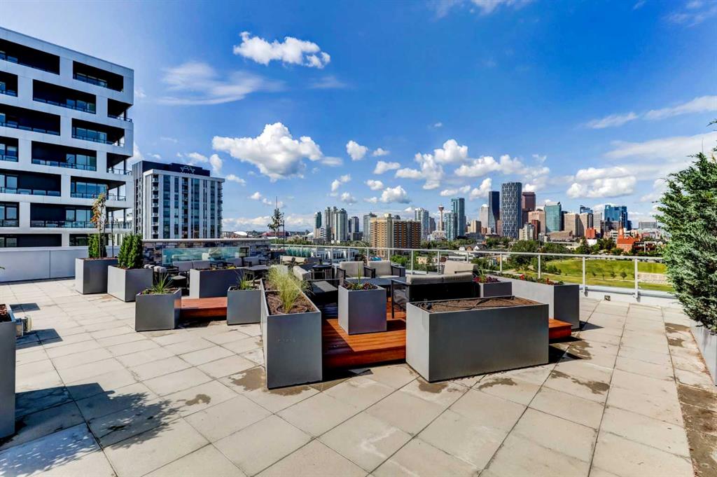Experience refined inner-city living in this beautifully designed 2 bedroom, 2 bath condo in the heart of Bridgeland. Featuring a south-facing exposure overlooking green space, this home is filled with natural light while offering a peaceful outlook rarely found in urban settings. The contemporary kitchen is both stylish and functional, showcasing quartz countertops, and a full suite of Bosch appliances, complemented by a premium Fisher & Paykel refrigerator. Designed for both everyday living and entertaining, the open-concept layout seamlessly connects the kitchen, dining, and living areas, creating a bright and welcoming space. The primary bedroom features a spacious walk-through wardrobe leading to a private ensuite, along with thoughtfully designed built-in storage that enhances both functionality and organization. The versatile second bedroom includes a built-in Murphy bed, allowing the space to easily transition between a guest room and a dedicated home office. A generously sized in-suite storage and laundry room adds exceptional convenience, a rare and valuable feature in condo living. This well-managed, pet-friendly building provides an impressive array of amenities, including concierge services, a fully equipped fitness centre, spin studio, yoga and movement room, rooftop terrace with panoramic city views, pet-washing station, secure bike storage, car wash bay, visitor parking in the secure underground parkade, and inviting community gathering spaces. Ideally located in vibrant Bridgeland, you are steps from cafés, dining, fitness studios, boutique shopping, local markets, parks, and the Bow River pathway system. With quick access to downtown and the C-Train nearby, commuting is effortless while enjoying one of Calgary’s most walkable and character-filled neighbourhoods. An exceptional opportunity to enjoy stylish urban living paired with premium amenities and a sought-after location.