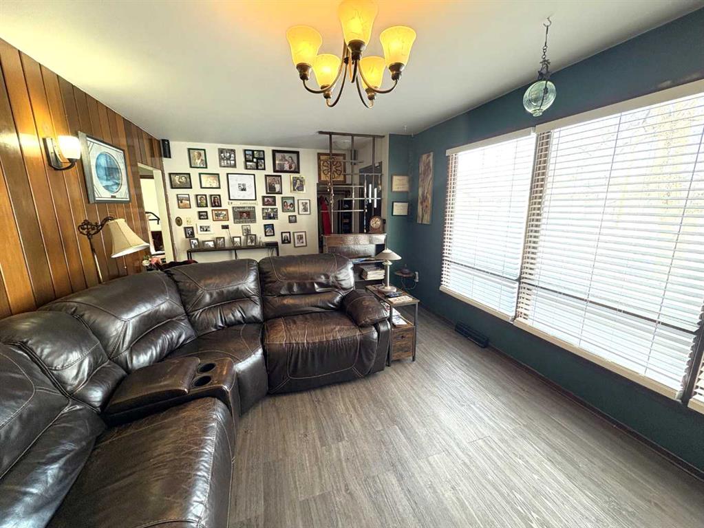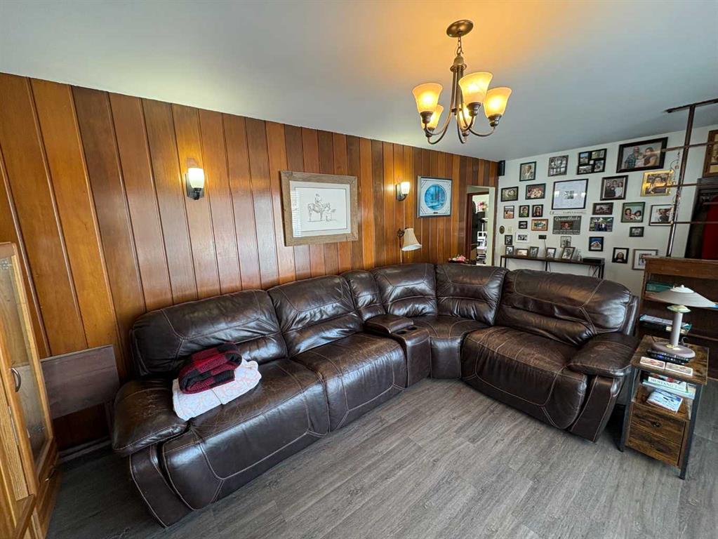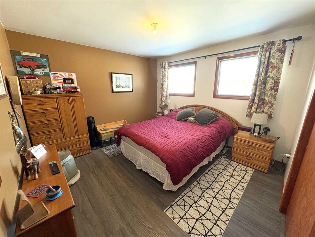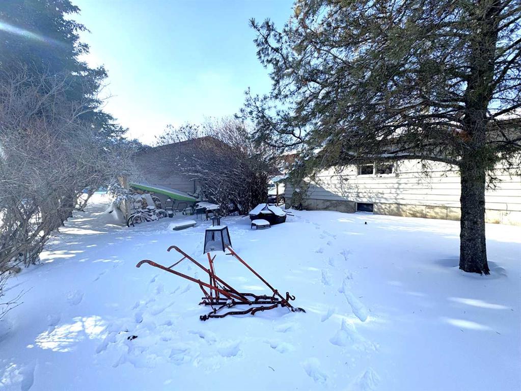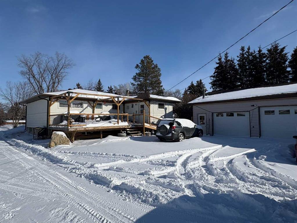 TAKE A LOOK AT THIS AFFORDABLE FAMILY HOME. 1002 SQFT. BUNGALOW, THE MAIN FLOOR FEATURES A BRIGHT LIVING ROOM WITH LARGE PICTURE WINDOW TO LET IN ALL THE SUNLIGHT. THE SPACIOUS KITCHEN HAS ROOM FOR AN ISLAND OR COFFEE BAR, NICE EATING AREA, 2 GOOD SIZE BEDROOMS. 4PC BATH WITH NEW RENOS. LARGE BACK ENTRY HAS UTILITY SINK AND PLENTY OF ROOM FOR COATS AND BOOTS. THE PARTIAL FINISHED BASEMENT HAS MANY POSSIBILITIES FOR YOUR PERSONAL TOUCH AND NEW CARPET JUST INSTALLED. LARGE FAMILY ROOM, 1 MORE BEDROOM, 2PC BATH, ONE MORE LARGE ROOM. SPACIOUS LAUNDRY AREA WITH MORE THAN ENOUGH STORAGE SPACE. THERE IS A POSSIBILITY FOR A SECOND BASEMENT BEDROOM. OUTSIDE YOU WILL FIND A NEW DECK TO ENJOY YOUR MORNING COFFEE. FENCED SIDE YARD. NOW LETS TALK ABOUT THAT DREAM TRIPLE GARAGE. 28'X49,' HEATED, 220 V. TWO REGULAR OVERHEAD DOORS AND ONE OVER SIZED DOOR WITH A 2 POST 9000lb. HOIST AND VAULTED CEILING. PERFECT FOR WORKING ON YOUR VEHICLE OR STACKING TWO FOR ADDITIONAL INSIDE PARKING. MORE THAN ENOUGH ROOM TO PARK AND STORE ALL YOUR TOYS WITH THE ADDED BONUS OF A HUGE DRIVEWAY. THERE IS ALSO EXTRA SPACE FOR RV PARKING WITH SIDE AND BACK LANE ACCESS. ALL OF THIS IS WAITING FOR YOU IN THE FRIENDLY COMMUNITY OF FORESTBURG, K-12 SCHOOL, ARENA, POOL, GOLF COURSE AND GREAT RESTAURANTS AND STORES