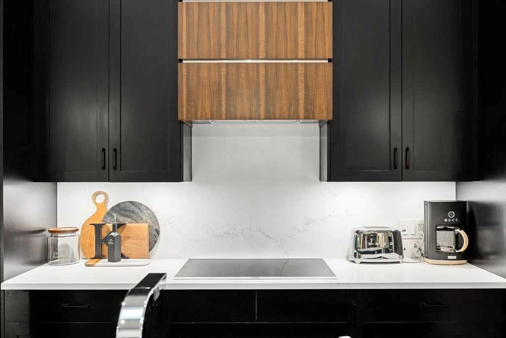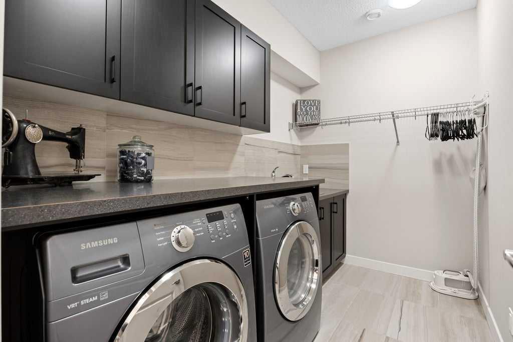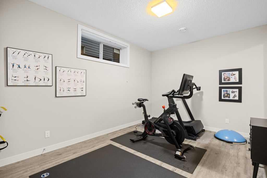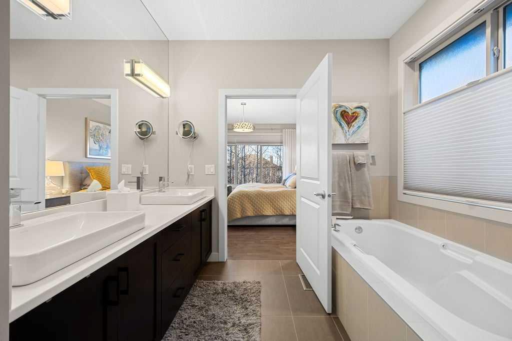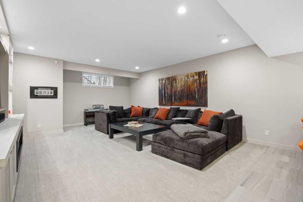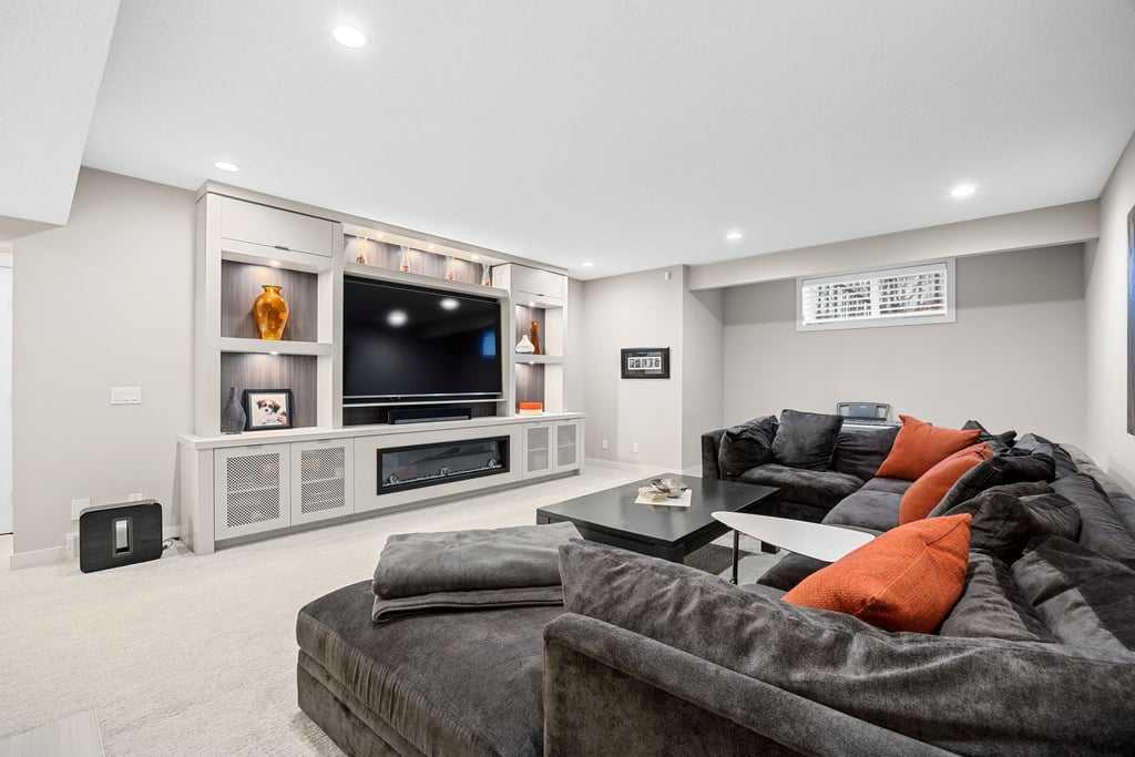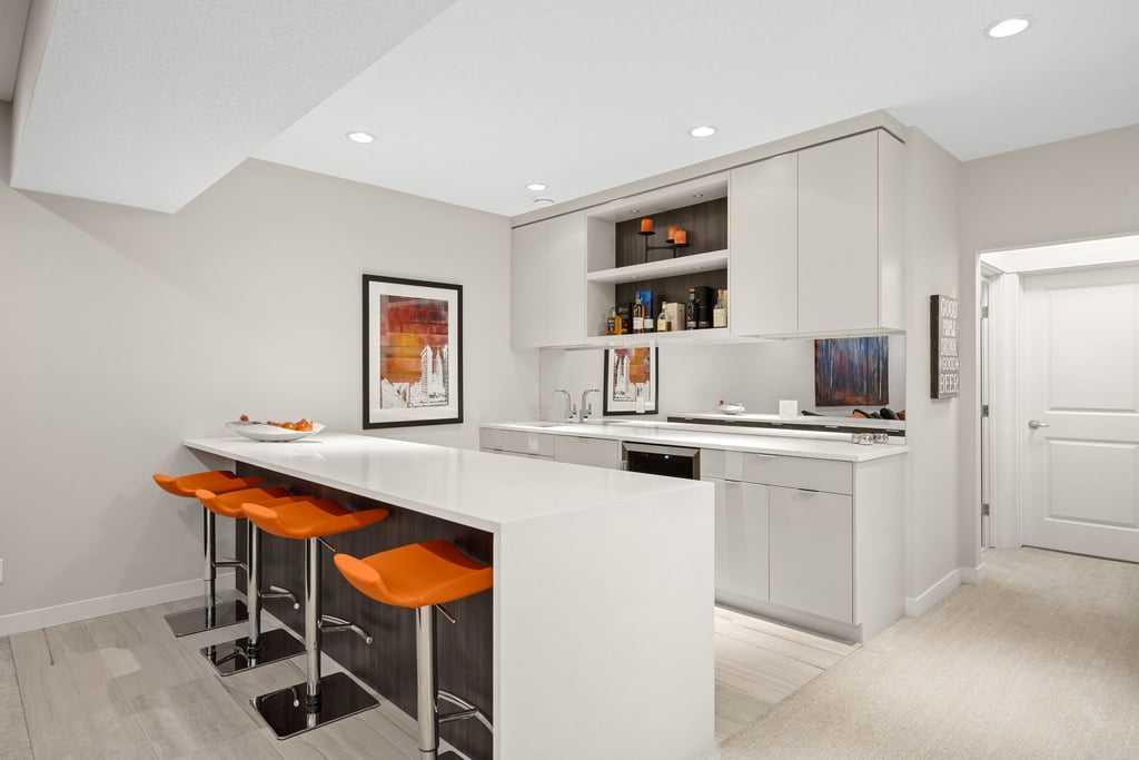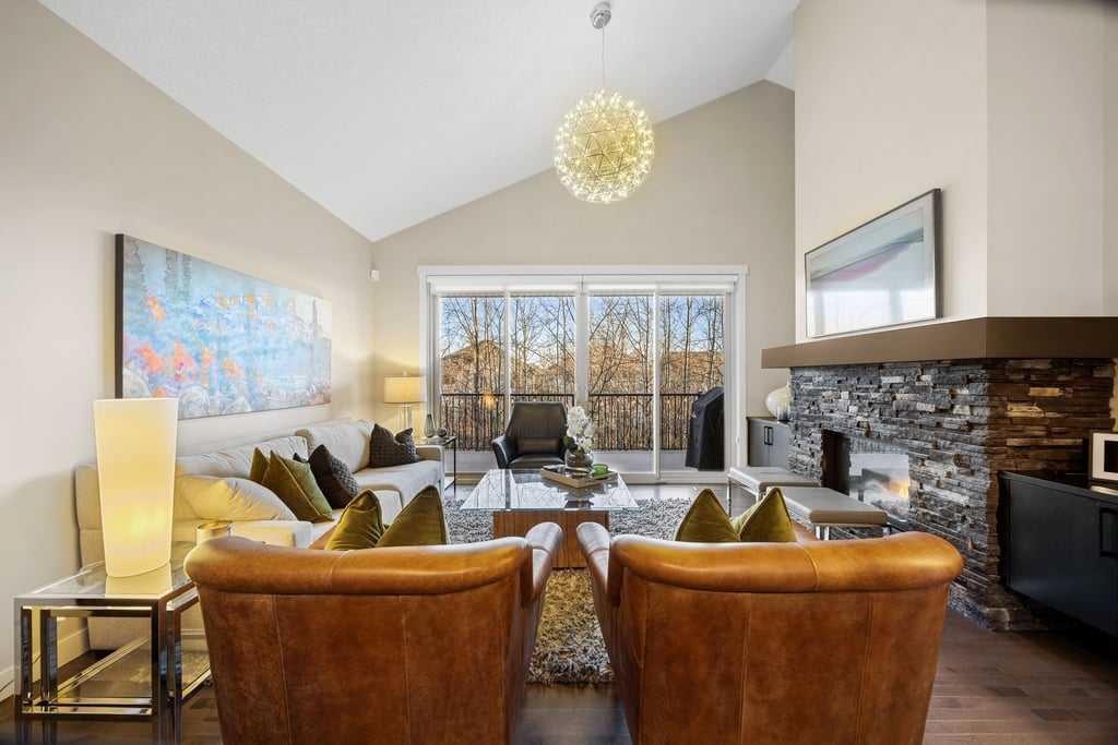 Backing onto a treed green space in Montreux and just moments from Aspen Landing, this stunning detached bungalow villa offers a rare blend of privacy, elegance, and effortless living. Part of an exclusive 30-unit bareland condominium enclave, this Trico-built home showcases quality craftsmanship and thoughtful design, with exceptional summer privacy thanks to its lush natural backdrop. Designed for both everyday comfort and refined entertaining, the main level features vaulted ceilings and a large skylight over the kitchen that fills the home with natural light, refreshed hardwood flooring, upgraded lighting throughout, and elevated finishes at every turn. The chef-inspired kitchen has been beautifully updated with new quartz countertops, a new Blanco sink, premium appliances including an induction cooktop, and seamless flow into the open living and dining areas. The main floor includes a spacious primary retreat with a luxurious 5-piece ensuite featuring a soaker tub and oversized shower, along with a second bedroom or den offering flexibility for guests or a private workspace. The mudroom is enhanced with Denca customized cabinetry, offering both style and exceptional everyday functionality. Just off the living space, a partially covered rear deck with durable Duradek surface and stairs to the backyard creates an ideal setting for outdoor living. The fully developed lower level expands the home with a generous recreation and media room centred around an electric fireplace with heater, creating a warm and inviting space to relax or entertain. The custom bar area is thoughtfully designed with a second dishwasher, wine fridge, and bar sink — perfect for hosting. Electric heated floors add comfort to the basement bathroom, laundry room, and bar area, while two additional bedrooms and a full bathroom provide excellent guest or family space. The large laundry room offers abundant storage along with a convenient laundry sink. Additional highlights include a custom-finished garage with epoxy flooring, extensive hanging storage, and a convenient hot water tap. With exterior maintenance, landscaping, and snow removal included, this residence offers a rare balance of lock-and-leave ease and elevated design — a timeless bungalow villa defined by quality craftsmanship and understated sophistication.