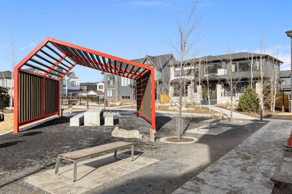 Welcome to this exceptional executive family home, perfectly positioned on one of the premier wide lots in the vibrant and thoughtfully designed community of Alpine Park, facing directly onto Orchard Green, a beautiful park featuring fruit trees, open play spaces, a community garden, and a Harvest Table for gatherings and picnics, offering a rare combination of privacy, scenery, and lifestyle. Set on an impressive 60 ft wide lot, the property enjoys peaceful park views from the front deck, living room, family room, and primary bedroom, with mature trees providing natural privacy, and offers over 3,600 sq ft of developed living space across three levels, showcasing outstanding craftsmanship and upgrades throughout while presenting like a builder’s showhome with the warmth and functionality of a true family home. Upon entry, you are immediately struck by the attention to detail and thoughtful design, with a bright main floor living room featuring large south-facing windows and a stunning floor-to-ceiling stone gas fireplace, flowing seamlessly into the heart of the home, a beautifully appointed kitchen with crisp white cabinetry, large island, stainless steel appliances, built-in oven, expansive north-facing window, and walk-in pantry. The spacious dining area is ideal for hosting large gatherings and features sliding patio doors leading to the upper deck and landscaped, fenced yard, along with a shaded lower patio perfect for summer relaxation. A stylish two-piece powder room and generous home office with park views and private deck access provide both convenience and versatility, while a custom-designed mudroom with closet and bench with lift-up storage completes the main level. The second level is a private retreat featuring a spacious family room with large park-facing windows, a unique bridge leading to the primary suite with expansive south-facing windows and a sliding barn door into the luxurious ensuite with dual vanities, large walk-in shower with dual shower heads, and elegant soaker tub. The custom walk-in closet connects to a well-appointed laundry room with folding counter and built-in sink, while two additional generously sized bedrooms and a five-piece main bathroom complete this level. The fully developed basement offers excellent additional living space with a large rec room ideal for teens, guests, or movie nights, a fourth bedroom, and a four-piece bathroom, plus rough-in plumbing for a future wet bar and an oversized utility and storage area for exceptional organization. The double attached garage is oversized in height, allowing for the potential addition of a vehicle lift or extra storage. Facing directly onto parkland, this home offers a quiet, traffic-free setting where you can relax on the front deck, enjoy your favorite beverage, and watch children play, delivering the perfect balance of luxury, comfort, and community-focused living in one of Calgary’s most exciting new neighbourhoods.