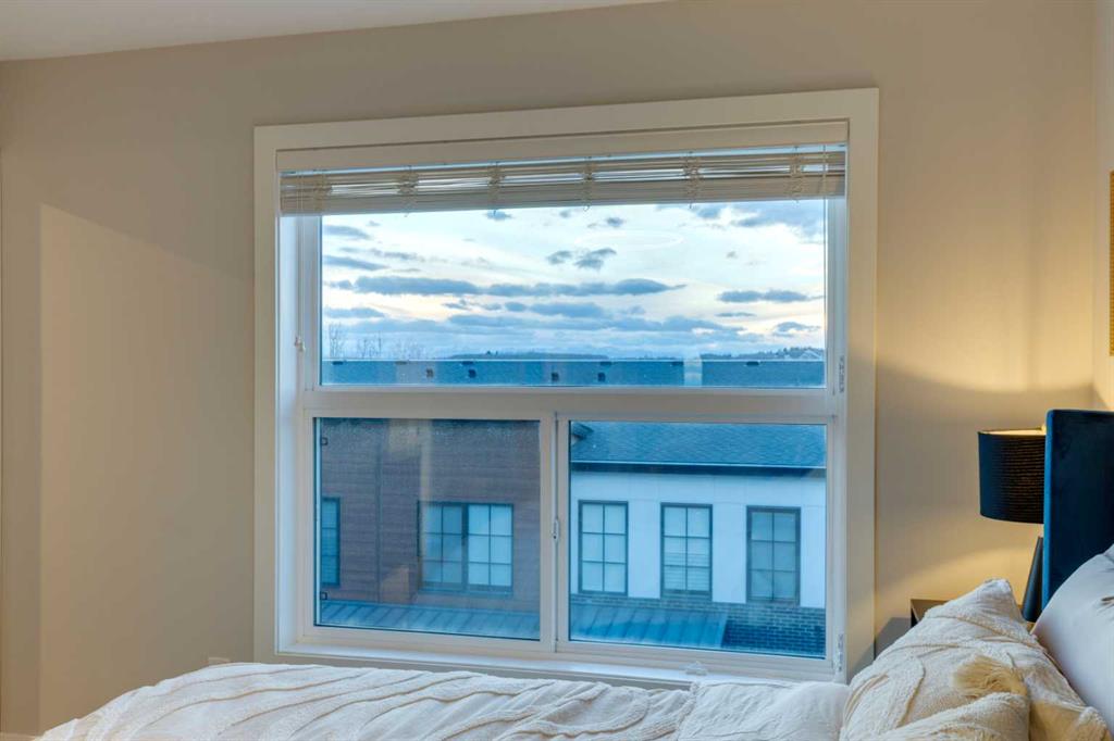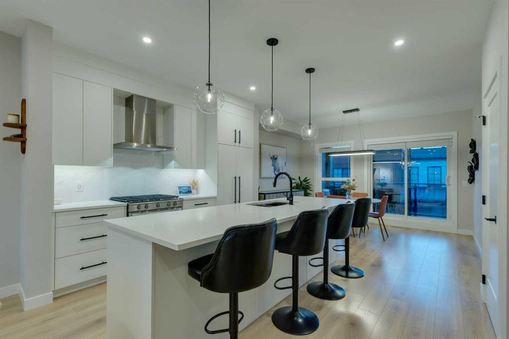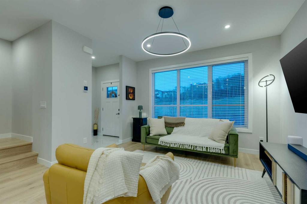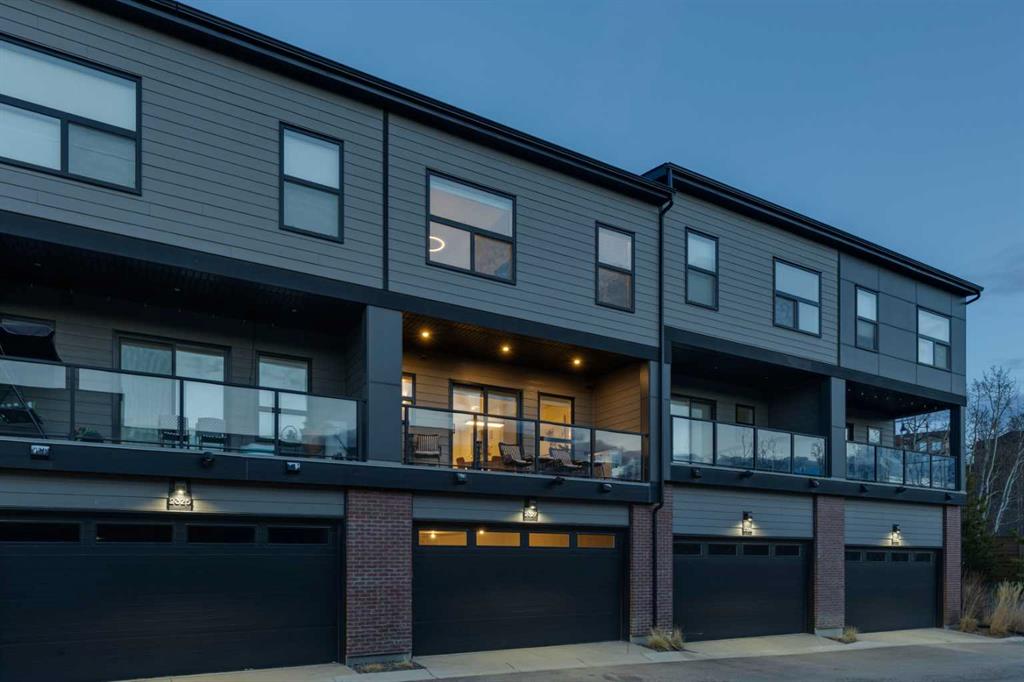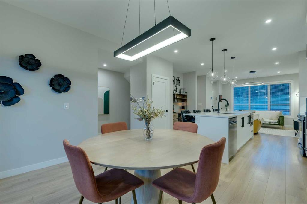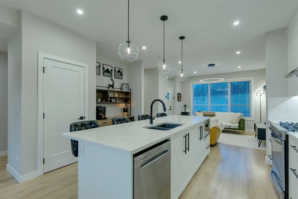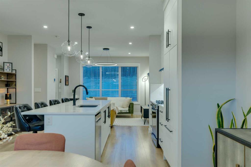 This beautifully designed 3-bedroom townhome blends modern style with warm, boho-inspired touches throughout. The focal brick facade leads to the welcoming entry with a bright foyer, mirrored closet, and clean white tile, before opening into a spacious main floor with soft, light luxury hardwood laminate flooring and sleek black accents. 9ft flat panel ceilings with recessed led lighting allow for ample front to back natural light. The living room sits to the left, while the central kitchen offers white cabinetry, under-cabinet lighting, a long flush top granite island with seating for four, a black modern sink, pendant lighting, gas range, and a built-in panelled fridge for a seamless designer look. To the right, the dining area features contemporary LED lighting and patio doors leading to a balcony with stunning sunset skies and a peaceful treed view to the side. A discrete, stylish half bath finishes the main level and provides lower access to the double width, TRIPLE attached garage(tandem depth on one side). Upstairs, the primary bedroom captures beautiful light and mountain views above the rooftops, with a gorgeous tray ceiling, a walk-in closet and a modern ensuite featuring white finishes, black fixtures, and a fully tiled walk-in shower. Two additional bedrooms with peaked ceilings & full windows offer versatility, including a charming nursery with a soft woodland mural, and the other with a flexible Murphy bed, all centered with a lovely 4-piece bathroom, upper laundry, and space in the hallway for an accent table or open tech area. Offering central A/C, an incredible accessible location near the C-Train station(s), and many desirable schools nearby, along with the excellent premier shops in Aspen Landing, this home offers enduring value and ideal location. With its thoughtful design, absolutely immaculate condition, and twilight views that make every evening feel special, this home delivers a perfect blend of comfort, style, and convenience. Even convenient shopping is nearby. This like-new townhome offers a fresh, modern lifestyle with a welcoming sense of personality from the moment you step through the front door. Offered in pristine move-in ready condition with flexible possession. Make sure to watch the video! Welcome home!