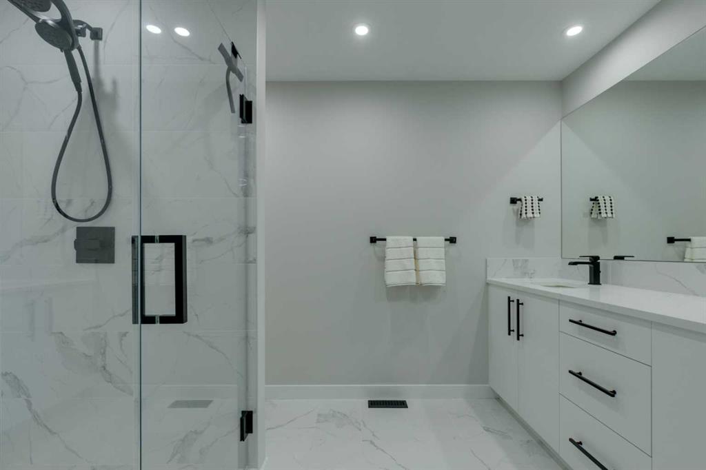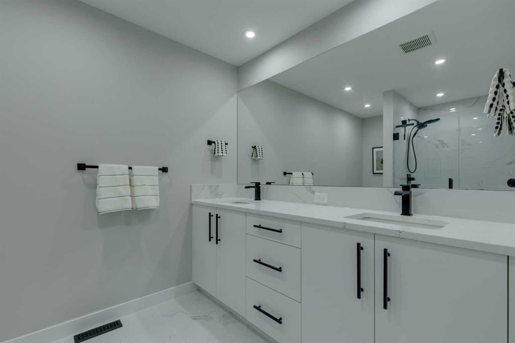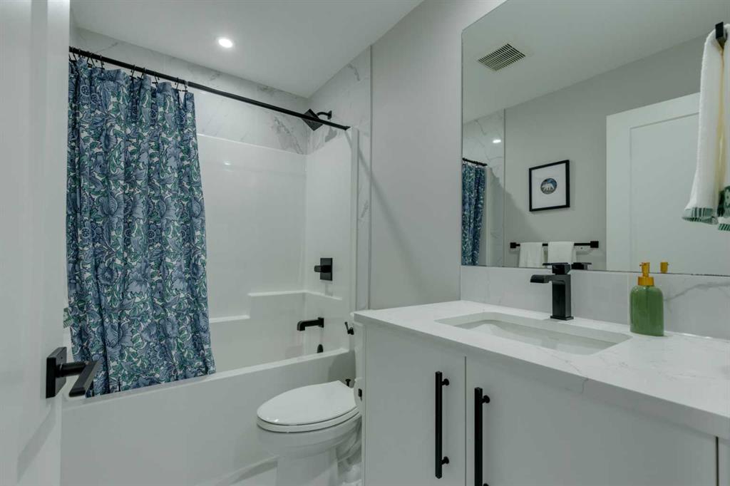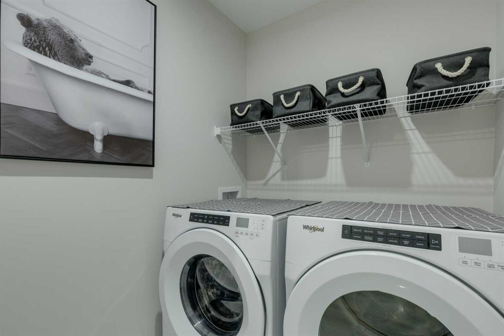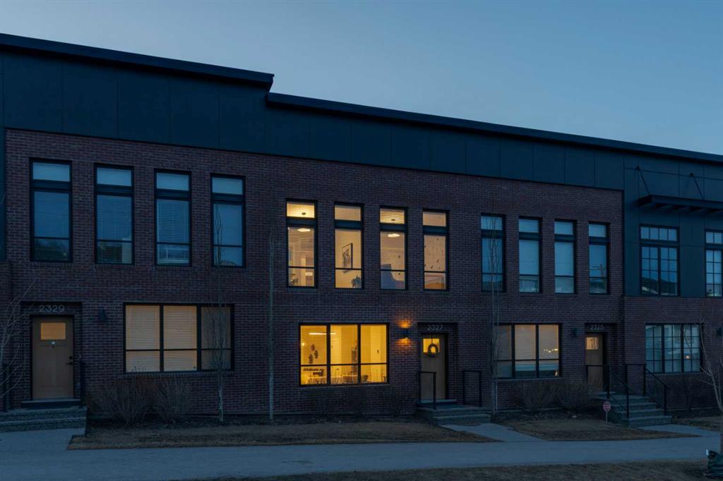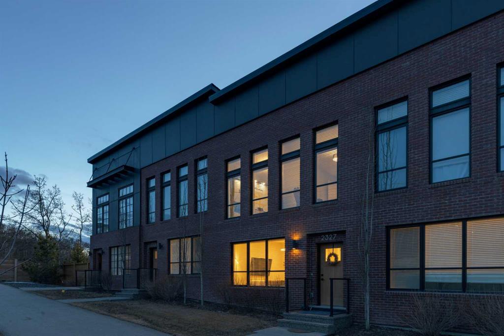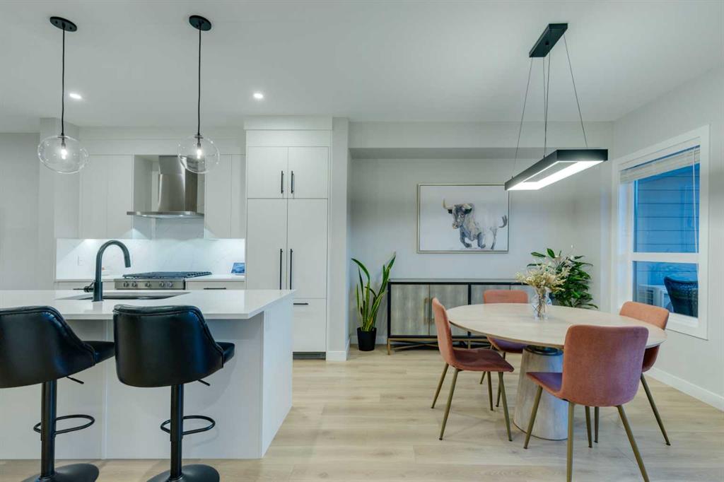 This beautifully designed 3-bedroom townhome blends modern style with warm, boho-inspired touches throughout. The focal brick facade leads to the welcoming entry with a bright foyer, mirrored closet, and clean white tile, before opening into a spacious main floor with soft, light luxury hardwood laminate flooring and sleek black accents. 9ft flat panel ceilings with recessed led lighting allow for ample front to back natural light. The living room sits to the left, while the central kitchen offers white cabinetry, under-cabinet lighting, a long flush top granite island with seating for four, a black modern sink, pendant lighting, gas range, and a built-in panelled fridge for a seamless designer look. To the right, the dining area features contemporary LED lighting and patio doors leading to a balcony with stunning sunset skies and a peaceful treed view to the side. A discrete, stylish half bath finishes the main level and provides lower access to the double width, TRIPLE attached garage(tandem depth on one side). Upstairs, the primary bedroom captures beautiful light and mountain views above the rooftops, with a gorgeous tray ceiling, a walk-in closet and a modern ensuite featuring white finishes, black fixtures, and a fully tiled walk-in shower. Two additional bedrooms with peaked ceilings & full windows offer versatility, including a charming nursery with a soft woodland mural, and the other with a flexible Murphy bed, all centered with a lovely 4-piece bathroom, upper laundry, and space in the hallway for an accent table or open tech area. Offering central A/C, an incredible accessible location near the C-Train station(s), and many desirable schools nearby, along with the excellent premier shops in Aspen Landing, this home offers enduring value and ideal location. With its thoughtful design, absolutely immaculate condition, and twilight views that make every evening feel special, this home delivers a perfect blend of comfort, style, and convenience. Even convenient shopping is nearby. This like-new townhome offers a fresh, modern lifestyle with a welcoming sense of personality from the moment you step through the front door. Offered in pristine move-in ready condition with flexible possession. Make sure to watch the video! Welcome home!