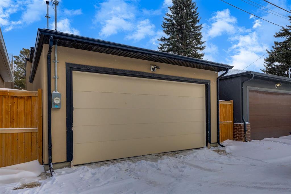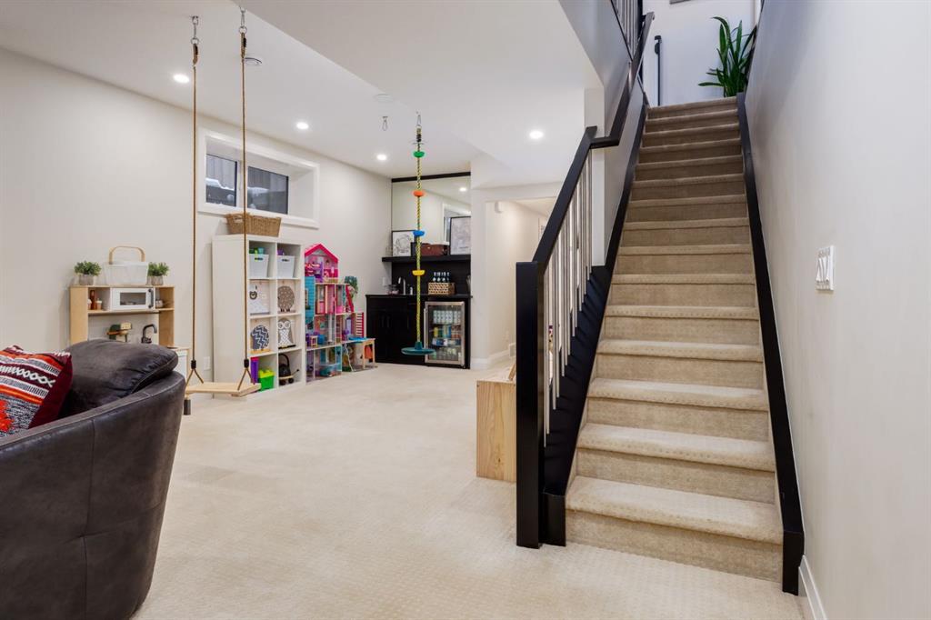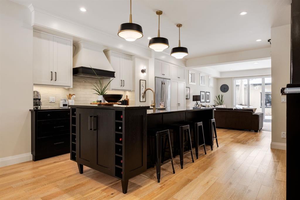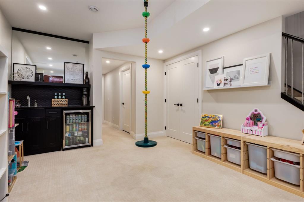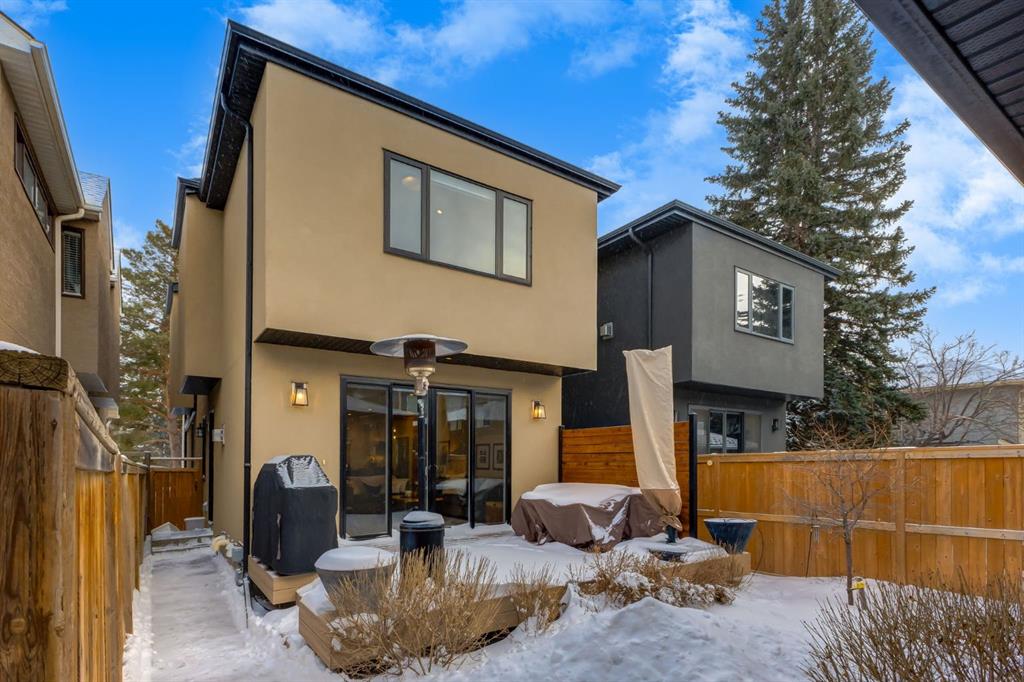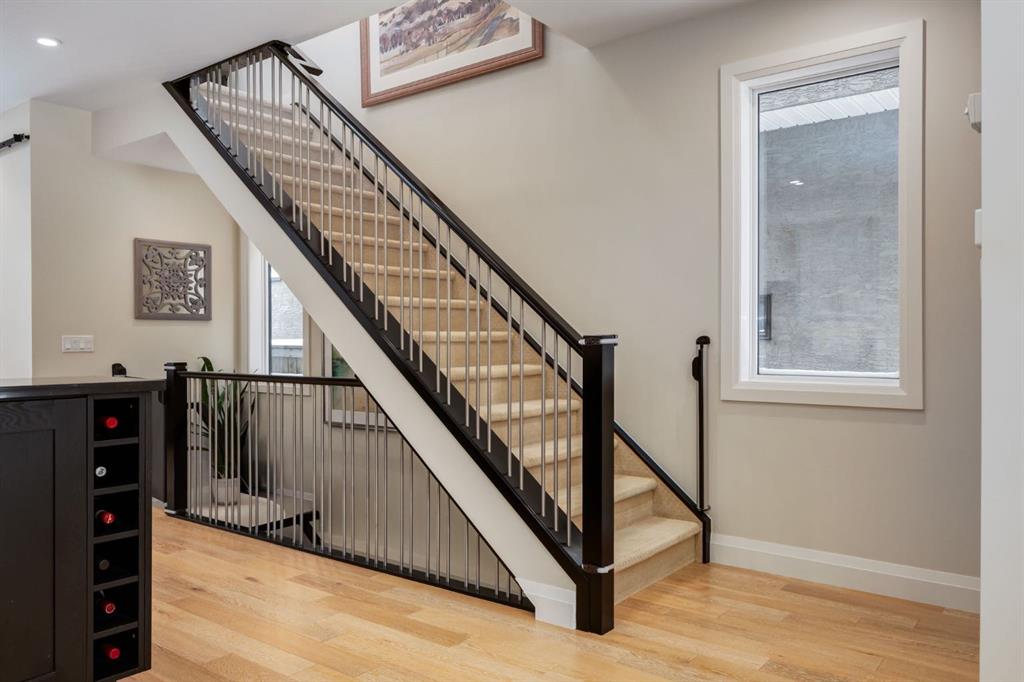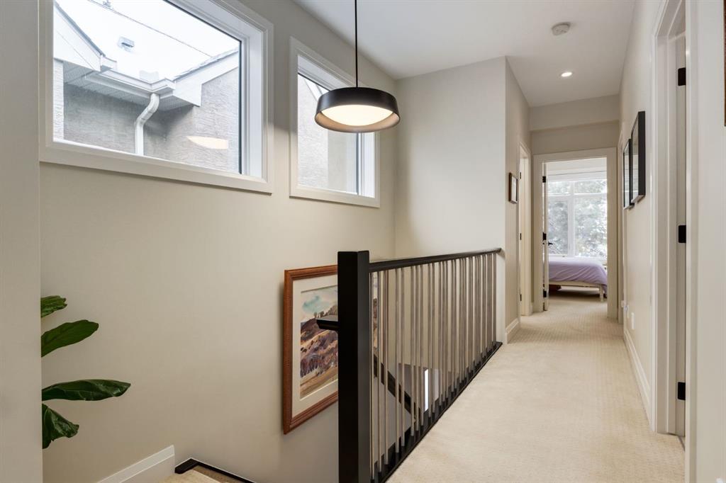 Located in highly coveted Shaganappi, this detached home was expertly built with quality in mind, no expense sparred, and a timeless elegance that will never go out of style. This stunning 4-bedroom, 3.5 bath home affords you a luxurious lifestyle and a quick walk to two LRT stations and endless amenities. Ditch the cheap materials used in most modern infills and upgrade to high end supplies including solid wood cabinetry and millwork as well as custom window coverings, central AC, a heated garage, and manicured landscaping including composite decking, mature perennials, and garden beds. As you walk up the front steps, the stunning curb appeal of this home stands out with classic white brick complimented by stone and metal accents. You’re greeted through the entryway into the barely lived in, open concept main floor which boasts engineered wood floors, soaring ceilings, designer lighting, and spectacular natural light through many expansive windows. The massive kitchen is fit for a large family with solid wood cabinetry, a custom range hood, gas stove, enormous kitchen island with bar seating, wine storage, and a pull-out pantry, all of which is accented by designer pendant lighting, ambient wall sconces, and an ageless backsplash. Enjoy family gatherings in your spacious dining room under a spectacular chandelier with mature trees lending privacy outside of the bright front windows. The large living room is flooded with natural light through floor to ceiling glass sliding doors and additional transom windows and is warmed by a striking gas fireplace with subway tile surround, adorned by a crafted mantle. Step outside onto the west facing composite deck to relax and enjoy the sunshine in your private, west facing backyard with landscaping including mature perennials and garden beds. Enjoy a moody mud room with a hexagonal tile accent wall and gold hardware. Rear entry from the garage is possible through your side mud room with built in storage including a bench with hooks, perfect for a bustling family. Enjoy elegant open railings as you ascend to the upper level which includes 3 beautiful skylights and large windows. The primary retreat has vaulted ceilings, west facing windows, and a large walk-in-closet with built-ins. The newly remodelled, luxurious spa-like ensuite showcases a free-standing tub that’s flooded in natural light, dual sinks with tons of extra storage, and a beautifully tiled stand-up shower with bench seating. Upstairs features two generously sized kid’s bedrooms allowing room for larger furniture and space to play. The kids’ bedrooms share a stunning 4-piece bathroom. Enjoy an upstairs laundry room with custom millwork, quartz countertops and tiled backsplash, endless storage, and a must-have sink. Downstairs boast a huge media space with a bespoke wet bar and wine fridge, office space, playroom, and room for guests with an additional large bedroom and a 3 -piece bathroom matching the finishes you’ve come to expect.