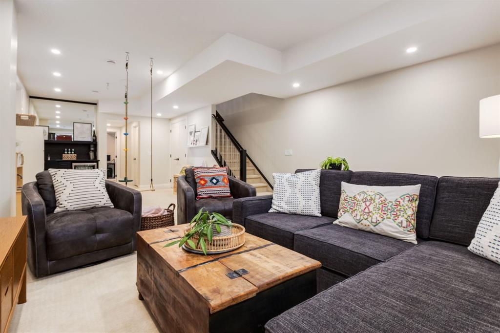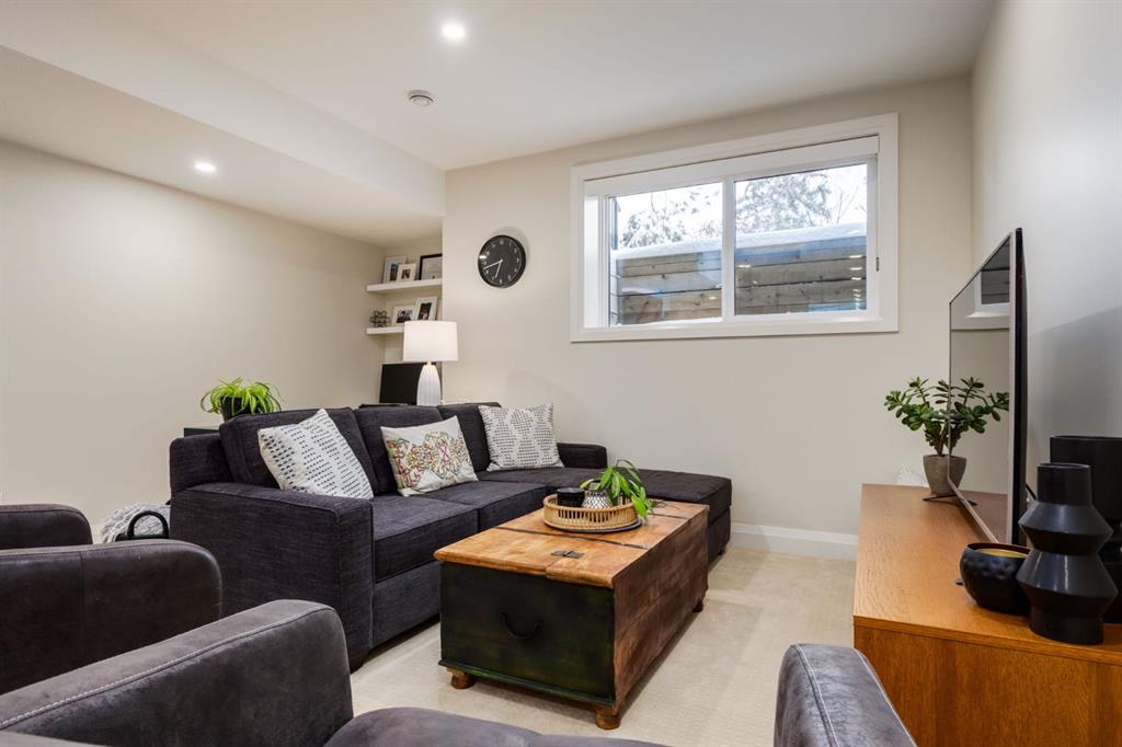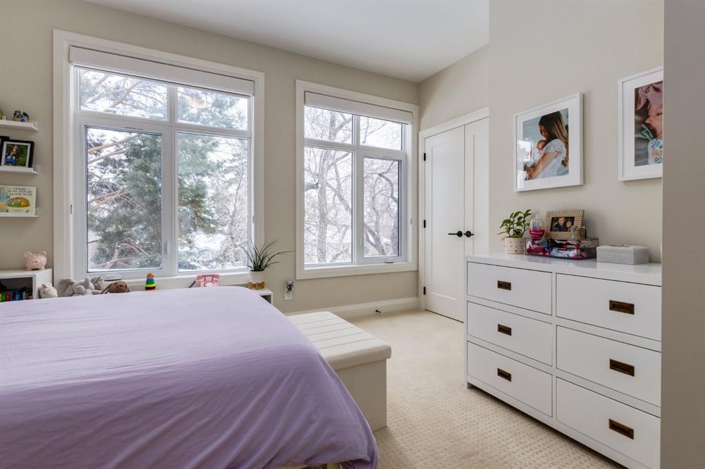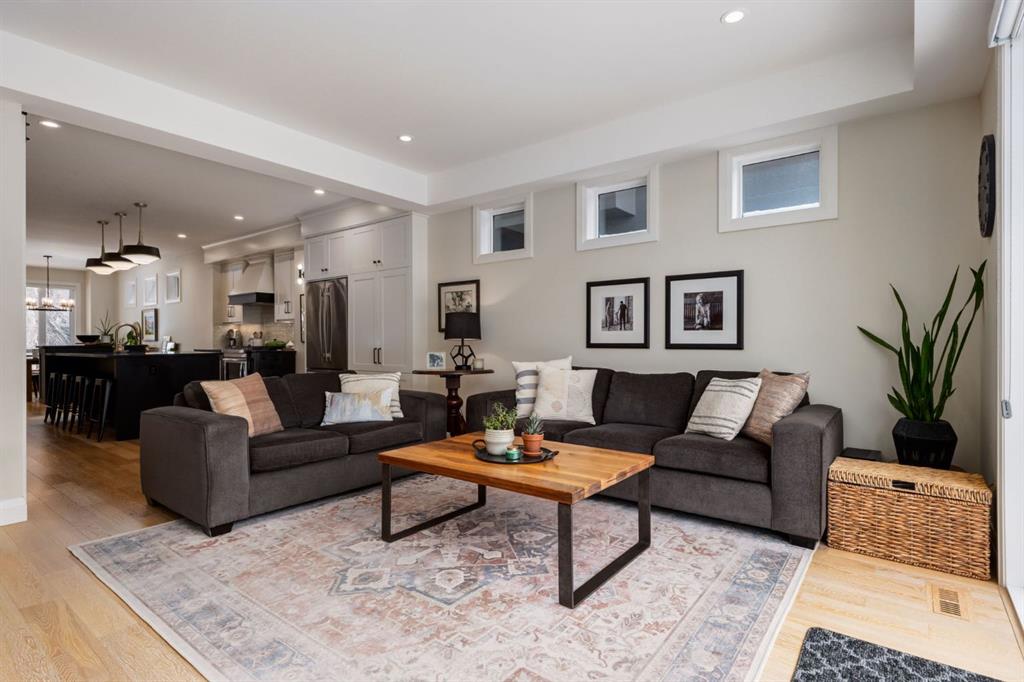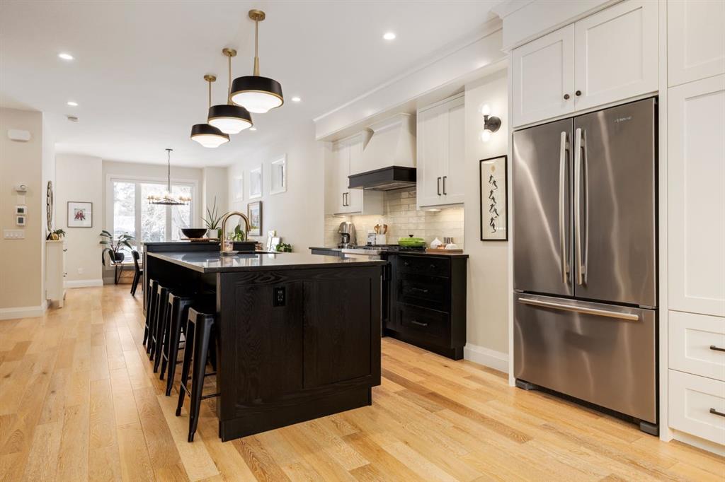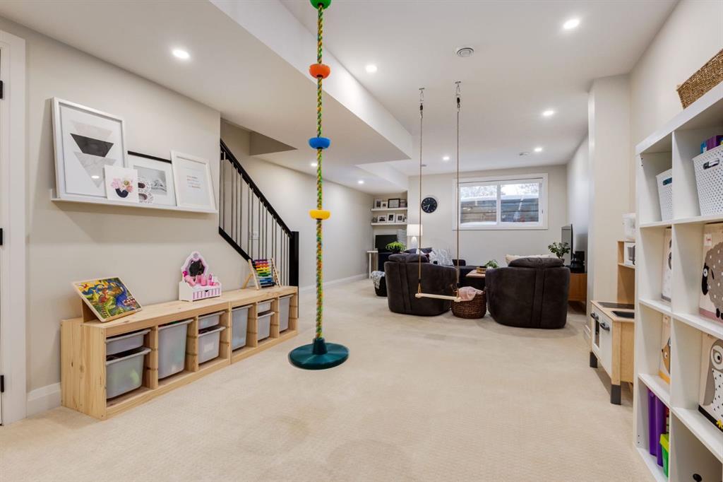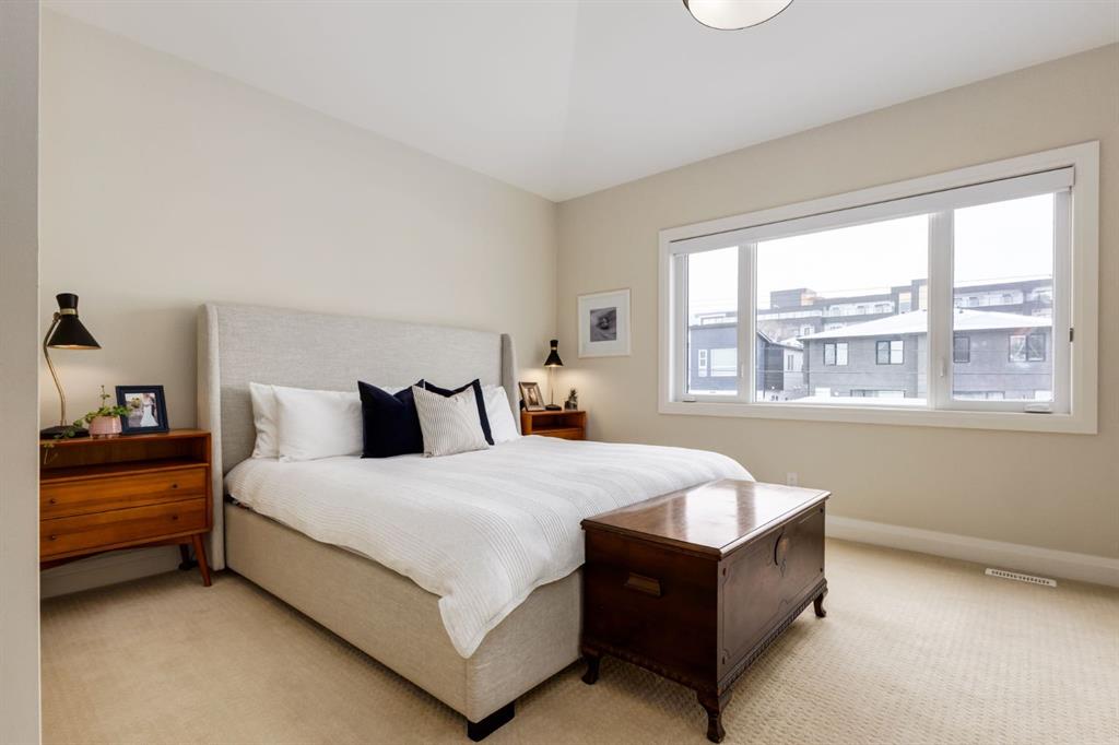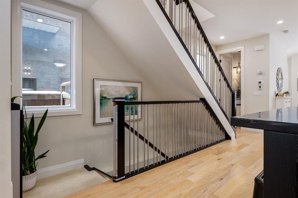 Located in highly coveted Shaganappi, this detached home was expertly built with quality in mind, no expense sparred, and a timeless elegance that will never go out of style. This stunning 4-bedroom, 3.5 bath home affords you a luxurious lifestyle and a quick walk to two LRT stations and endless amenities. Ditch the cheap materials used in most modern infills and upgrade to high end supplies including solid wood cabinetry and millwork as well as custom window coverings, central AC, a heated garage, and manicured landscaping including composite decking, mature perennials, and garden beds. As you walk up the front steps, the stunning curb appeal of this home stands out with classic white brick complimented by stone and metal accents. You’re greeted through the entryway into the barely lived in, open concept main floor which boasts engineered wood floors, soaring ceilings, designer lighting, and spectacular natural light through many expansive windows. The massive kitchen is fit for a large family with solid wood cabinetry, a custom range hood, gas stove, enormous kitchen island with bar seating, wine storage, and a pull-out pantry, all of which is accented by designer pendant lighting, ambient wall sconces, and an ageless backsplash. Enjoy family gatherings in your spacious dining room under a spectacular chandelier with mature trees lending privacy outside of the bright front windows. The large living room is flooded with natural light through floor to ceiling glass sliding doors and additional transom windows and is warmed by a striking gas fireplace with subway tile surround, adorned by a crafted mantle. Step outside onto the west facing composite deck to relax and enjoy the sunshine in your private, west facing backyard with landscaping including mature perennials and garden beds. Enjoy a moody mud room with a hexagonal tile accent wall and gold hardware. Rear entry from the garage is possible through your side mud room with built in storage including a bench with hooks, perfect for a bustling family. Enjoy elegant open railings as you ascend to the upper level which includes 3 beautiful skylights and large windows. The primary retreat has vaulted ceilings, west facing windows, and a large walk-in-closet with built-ins. The newly remodelled, luxurious spa-like ensuite showcases a free-standing tub that’s flooded in natural light, dual sinks with tons of extra storage, and a beautifully tiled stand-up shower with bench seating. Upstairs features two generously sized kid’s bedrooms allowing room for larger furniture and space to play. The kids’ bedrooms share a stunning 4-piece bathroom. Enjoy an upstairs laundry room with custom millwork, quartz countertops and tiled backsplash, endless storage, and a must-have sink. Downstairs boast a huge media space with a bespoke wet bar and wine fridge, office space, playroom, and room for guests with an additional large bedroom and a 3 -piece bathroom matching the finishes you’ve come to expect.