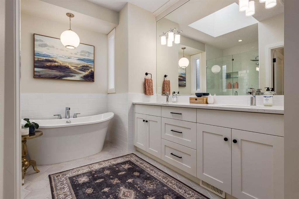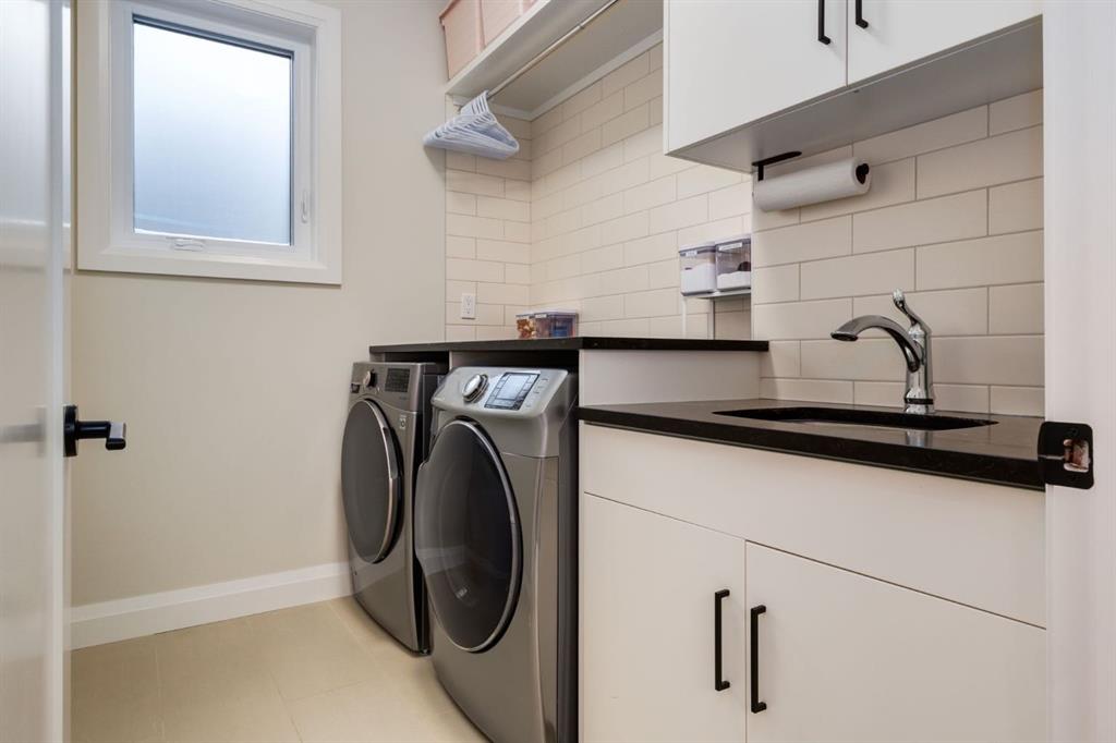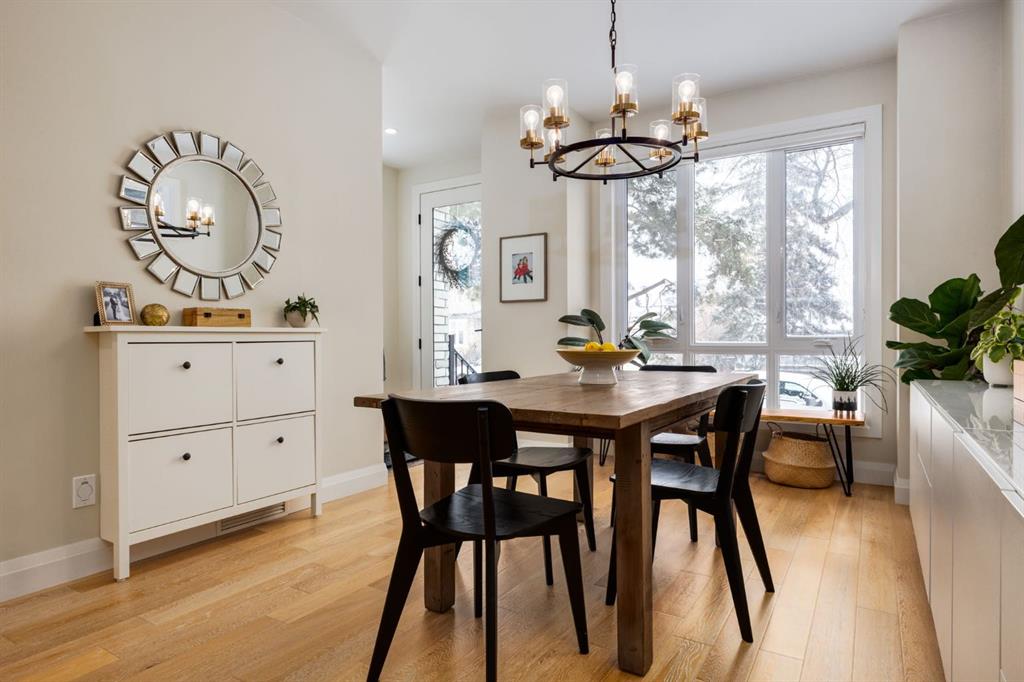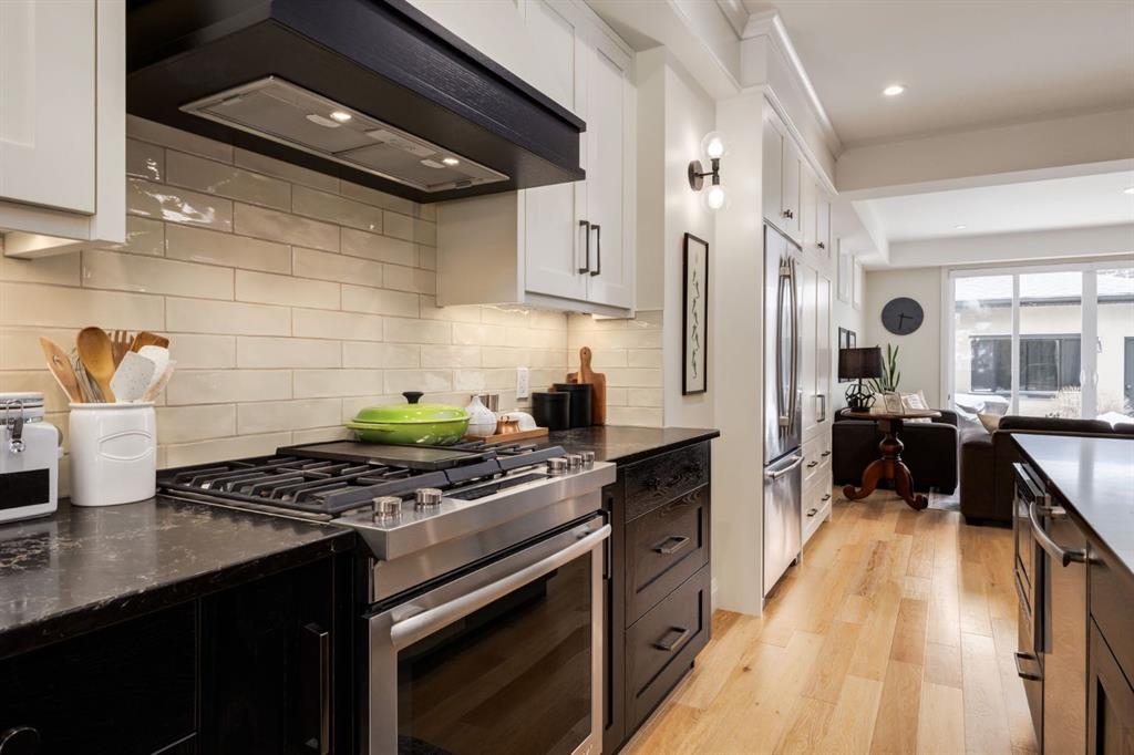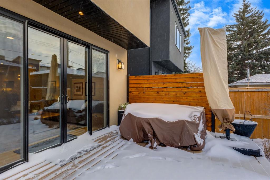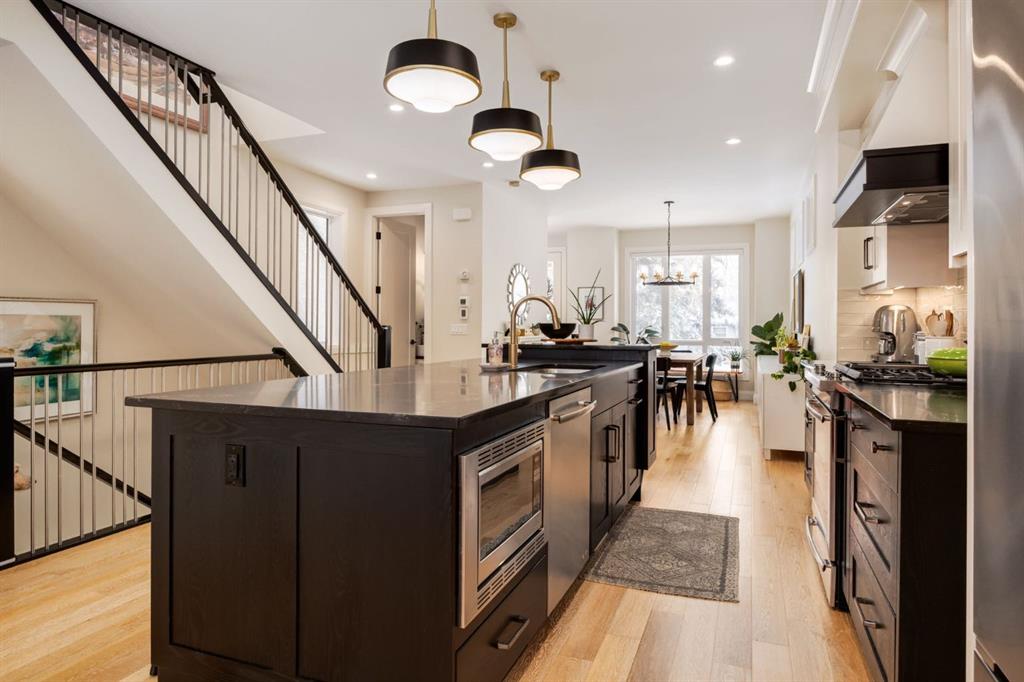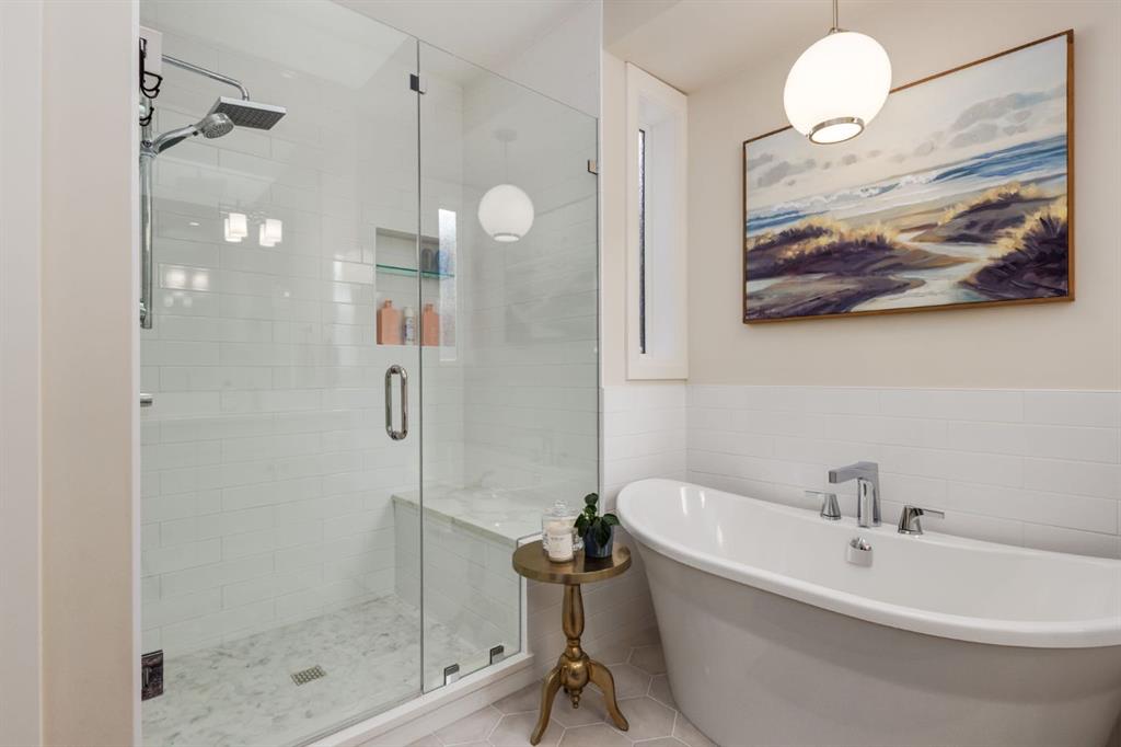 Located in highly coveted Shaganappi, this detached home was expertly built with quality in mind, no expense sparred, and a timeless elegance that will never go out of style. This stunning 4-bedroom, 3.5 bath home affords you a luxurious lifestyle and a quick walk to two LRT stations and endless amenities. Ditch the cheap materials used in most modern infills and upgrade to high end supplies including solid wood cabinetry and millwork as well as custom window coverings, central AC, a heated garage, and manicured landscaping including composite decking, mature perennials, and garden beds. As you walk up the front steps, the stunning curb appeal of this home stands out with classic white brick complimented by stone and metal accents. You’re greeted through the entryway into the barely lived in, open concept main floor which boasts engineered wood floors, soaring ceilings, designer lighting, and spectacular natural light through many expansive windows. The massive kitchen is fit for a large family with solid wood cabinetry, a custom range hood, gas stove, enormous kitchen island with bar seating, wine storage, and a pull-out pantry, all of which is accented by designer pendant lighting, ambient wall sconces, and an ageless backsplash. Enjoy family gatherings in your spacious dining room under a spectacular chandelier with mature trees lending privacy outside of the bright front windows. The large living room is flooded with natural light through floor to ceiling glass sliding doors and additional transom windows and is warmed by a striking gas fireplace with subway tile surround, adorned by a crafted mantle. Step outside onto the west facing composite deck to relax and enjoy the sunshine in your private, west facing backyard with landscaping including mature perennials and garden beds. Enjoy a moody mud room with a hexagonal tile accent wall and gold hardware. Rear entry from the garage is possible through your side mud room with built in storage including a bench with hooks, perfect for a bustling family. Enjoy elegant open railings as you ascend to the upper level which includes 3 beautiful skylights and large windows. The primary retreat has vaulted ceilings, west facing windows, and a large walk-in-closet with built-ins. The newly remodelled, luxurious spa-like ensuite showcases a free-standing tub that’s flooded in natural light, dual sinks with tons of extra storage, and a beautifully tiled stand-up shower with bench seating. Upstairs features two generously sized kid’s bedrooms allowing room for larger furniture and space to play. The kids’ bedrooms share a stunning 4-piece bathroom. Enjoy an upstairs laundry room with custom millwork, quartz countertops and tiled backsplash, endless storage, and a must-have sink. Downstairs boast a huge media space with a bespoke wet bar and wine fridge, office space, playroom, and room for guests with an additional large bedroom and a 3 -piece bathroom matching the finishes you’ve come to expect.