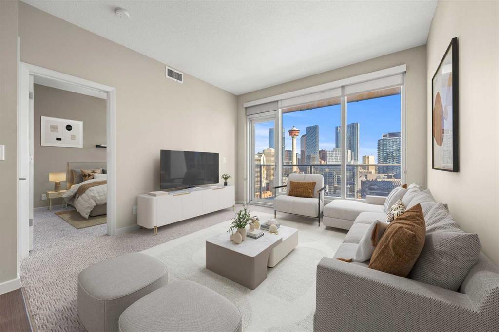Experience downtown living at its finest in this beautifully designed 2 bed, 2 bath condo located in the heart of Calgary’s vibrant core. Offering nearly 800 sq ft of thoughtfully planned space, this unit blends style, comfort, and convenience—perfect for professionals, roommates, or those looking to downsize without compromising on location or function. Step inside to discover a bright and open living area with floor-to-ceiling windows that flood the space with natural light and showcase amazing city views. The modern kitchen is equipped with stainless steel appliances, quartz countertops, and sleek cabinetry, all seamlessly integrated into the open-concept layout that makes entertaining or relaxing feel effortless. Both bedrooms are strategically located on opposite sides of the unit, providing excellent privacy. Each features a walk-through closet and direct access to a full bathroom—ideal for shared living or hosting guests. The spacious primary bedroom includes a private 4-piece ensuite, while the second bedroom connects to the main bathroom, which also offers a secondary entrance from the main living area. Brand new carpets add a fresh, updated feel, complementing the durable tile flooring and bringing warmth to the bedrooms. Comfort is top of mind year-round thanks to central A/C, and in-suite laundry ensures everyday convenience. This well-managed building offers excellent amenities including a fully equipped fitness centre and a sunny outdoor courtyard—perfect for morning coffee or unwinding with friends. You'll also enjoy a titled underground parking stall and assigned storage for all your gear. Located steps from shops, restaurants, cafes, the river pathways, and transit, this condo offers unbeatable access to the best of downtown Calgary. Whether you're investing, downsizing, or buying your first home, this move-in-ready unit offers exceptional value and a lifestyle to match. Don’t miss your chance to call this urban retreat your own!