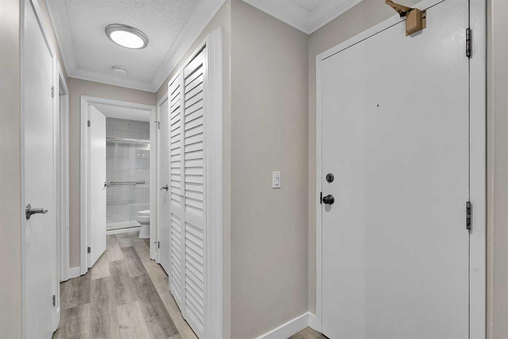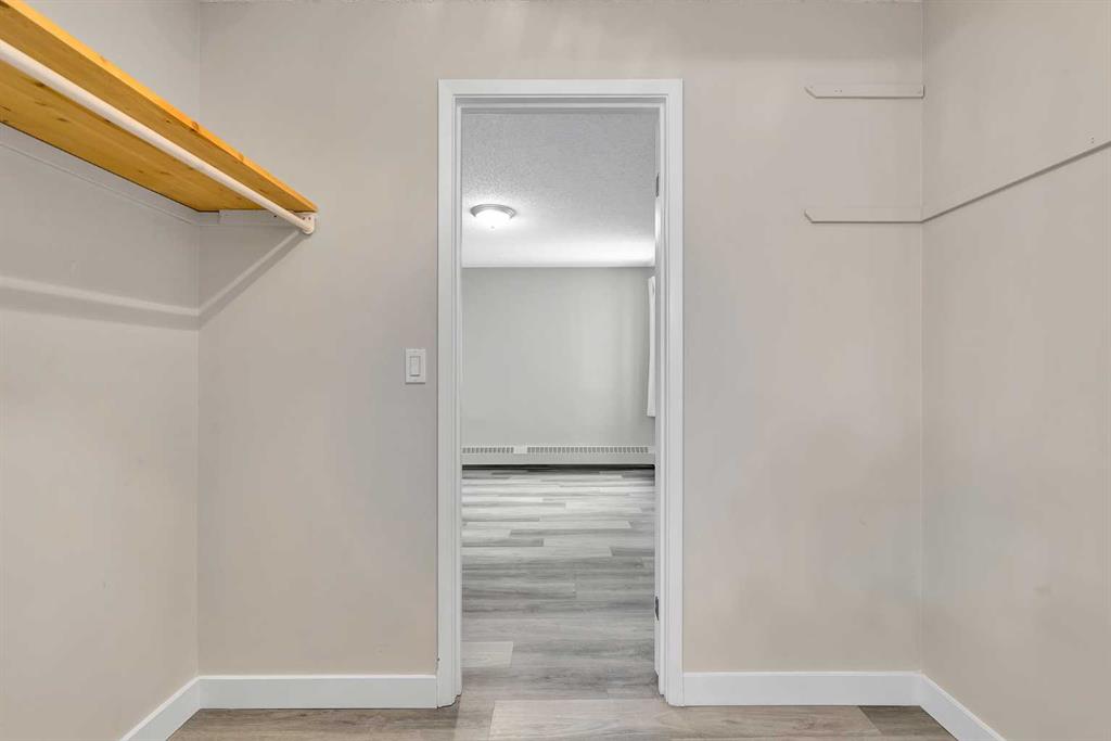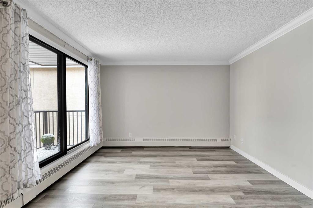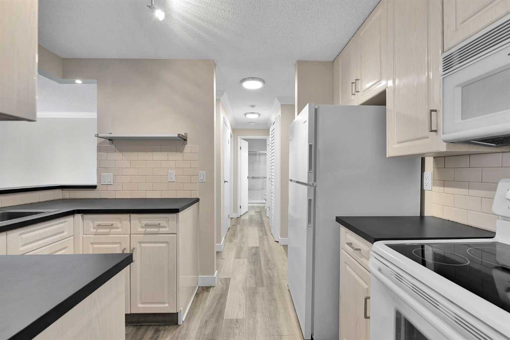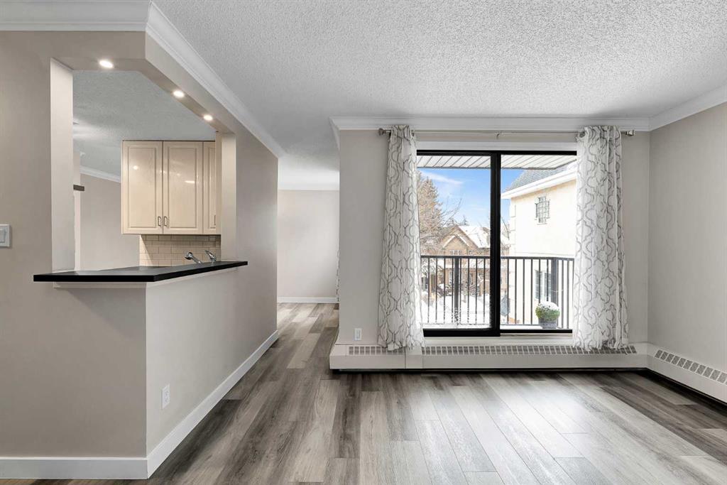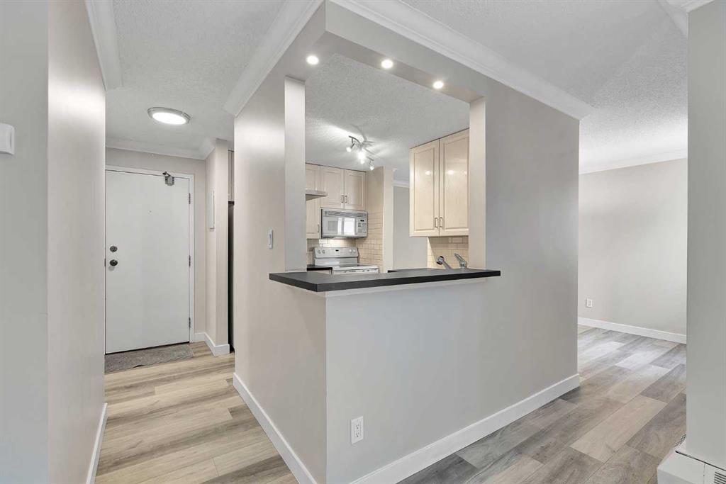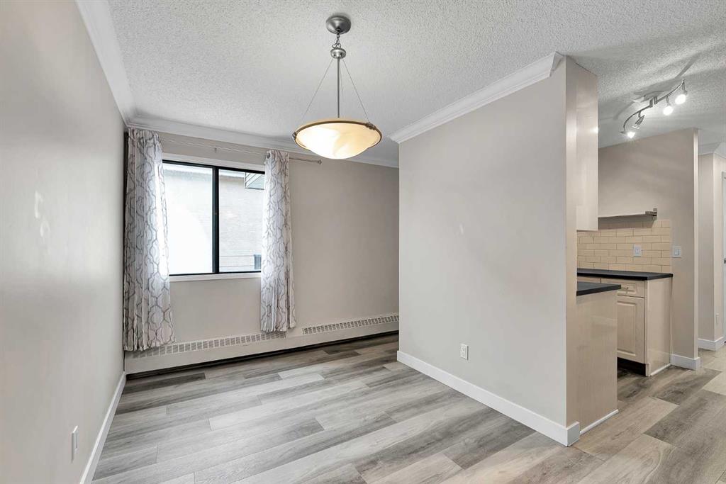 Pristine apartment condo located in quiet adult -oriented building . This immaculate unit has been updated and extremely well taken care of . The perfect location within the building , set in the corner away from other units and offers a private balcony with views . This bright and inviting unit offers an open plan , updated kitchen and breakfast bar opening up to the main living room and offers a large separate dining room . The oversized primary bedroom has room for a king sized bed, armoire and additional furniture . There is a walk-in closet with cheater door to a fully renovated 3 piece bath . There is in suite laundry ( stackable unit ) and additional storage within this well laid out floor plan . There is underground parking in the secured garage with one of the largest stalls in the building . Stall # 60 is conveniently located 3 floors below using the stairs and you are at your vehicle