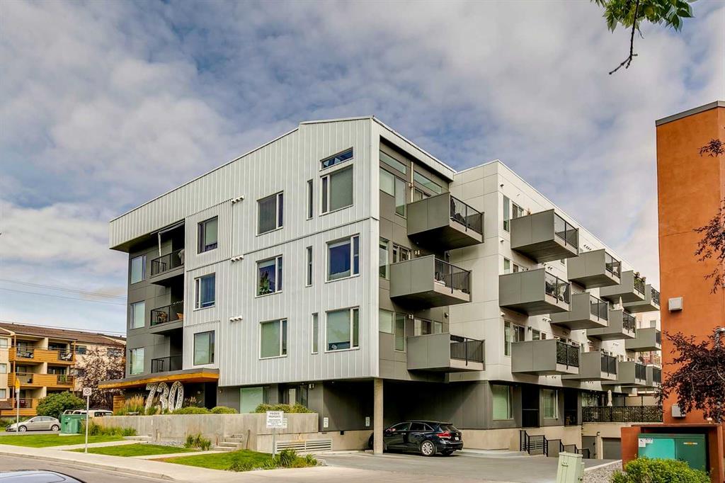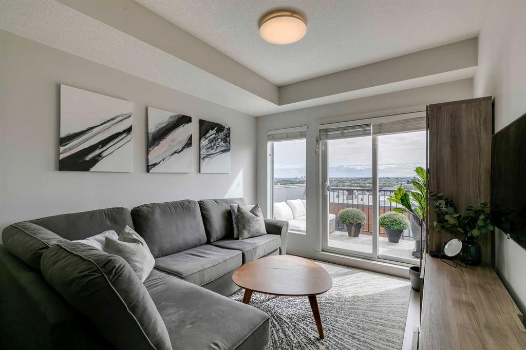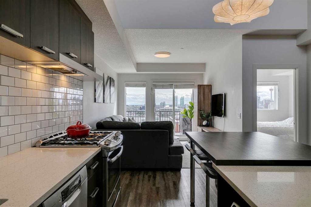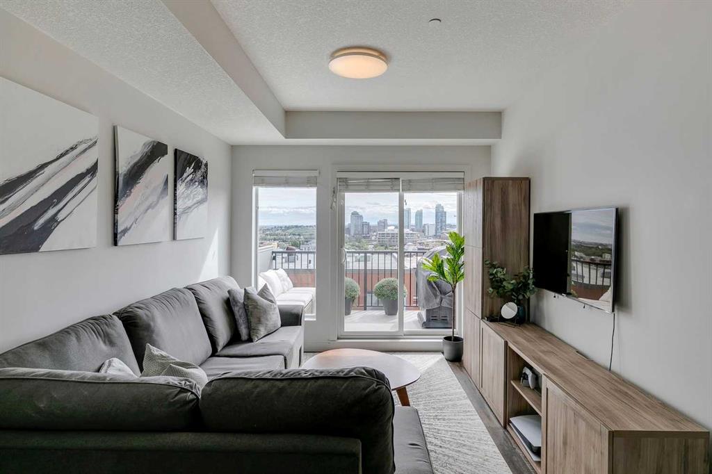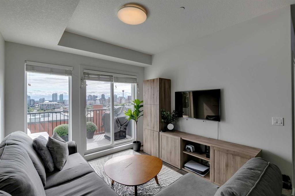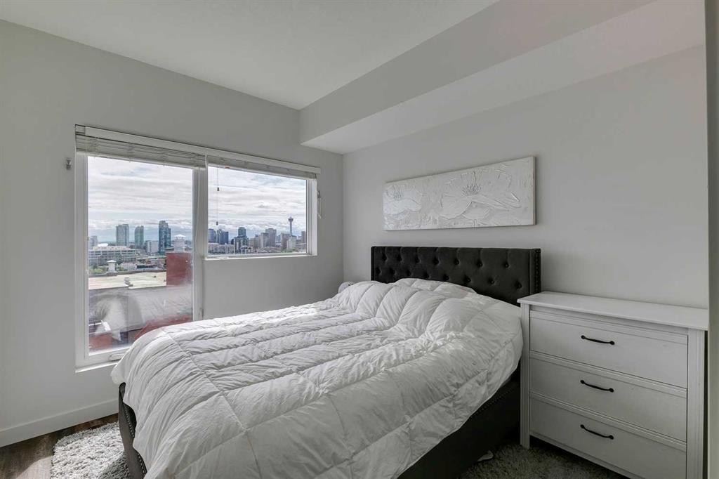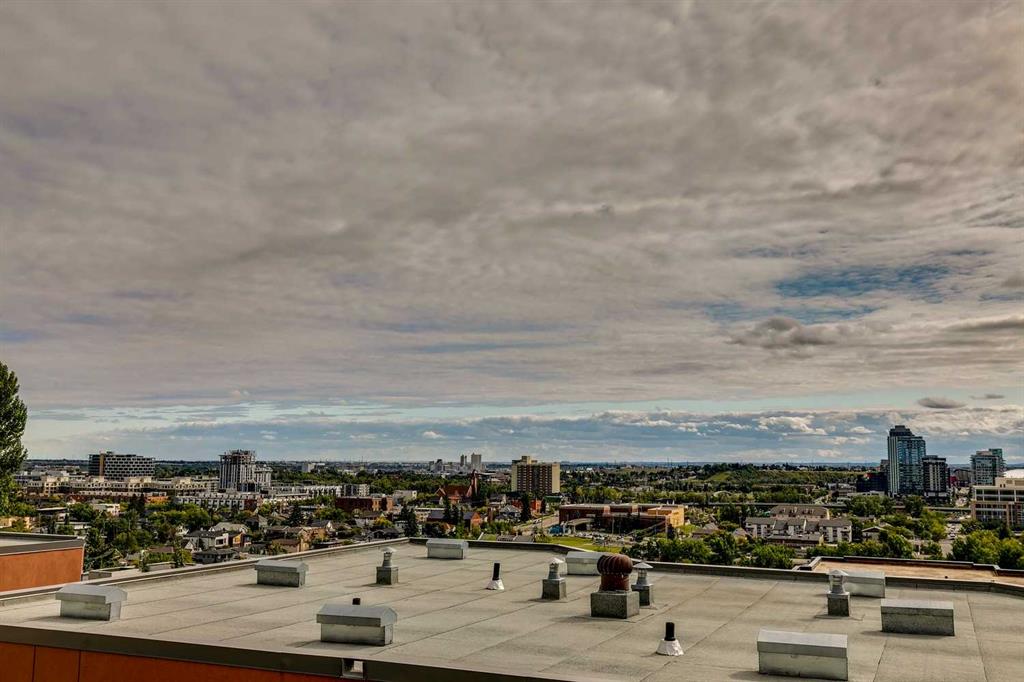 Experience PENTHOUSE living in Renfrew with sweeping, UNOBSTRUCTED VIEWS of downtown, the rolling hills of South Calgary, and even the MOUNTAINS, visible from both your living room and primary bedroom. This top-floor, striking architecture with everyday comfort, featuring 20-ft VAULTED CEILINGS with oversized SKYLIGHTS that pour natural light across the entire home. The kitchen is designed for real living and entertaining, not just looking good. You’ll appreciate the OVERSIZED ISLAND with an integrated eating table, DEEP full-height cabinets, and QUARTZ countertops that offer ample prep space for cooks and hosts alike. The open layout flows effortlessly into the living area and out to your private BALCONY, complete with a GAS line ready for your BBQ. Retreat to a spacious bedroom where morning views greet you daily. A WALKTHROUGH CLOSET leads directly into a well-appointed 4-piece bathroom with a SOAKER tub, creating a spa-like transition from day to night. A separate den/office provides the flexibility to work from home or create a dedicated hobby space. Comfort is top of mind with IN-FLOOR HEATING, AC, and custom WOOD-PLANK WINDOW COVERINGS and BLACKOUT curtains in the bedroom that add warmth and style. STORAGE is never a concern thanks to thoughtful cabinetry throughout. This home includes TITLED underground parking, a HEATED DRIVEWAY into the parkade, designated visitor stalls, plus ample FREE street parking for your guests. Located in one of Calgary’s best inner-city communities, you'll enjoy quick access to downtown, local cafés, parks, and transit. A rare penthouse offering that blends luxury, functionality, and breathtaking views—welcome home to elevated urban living in Renfrew.