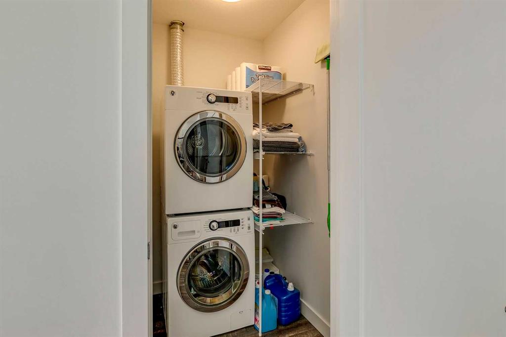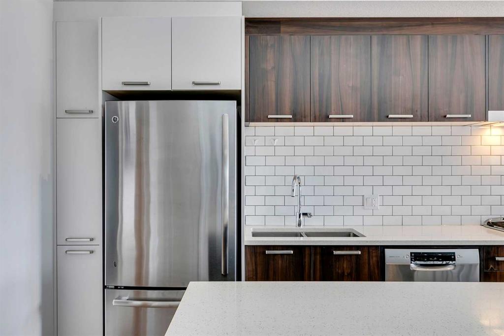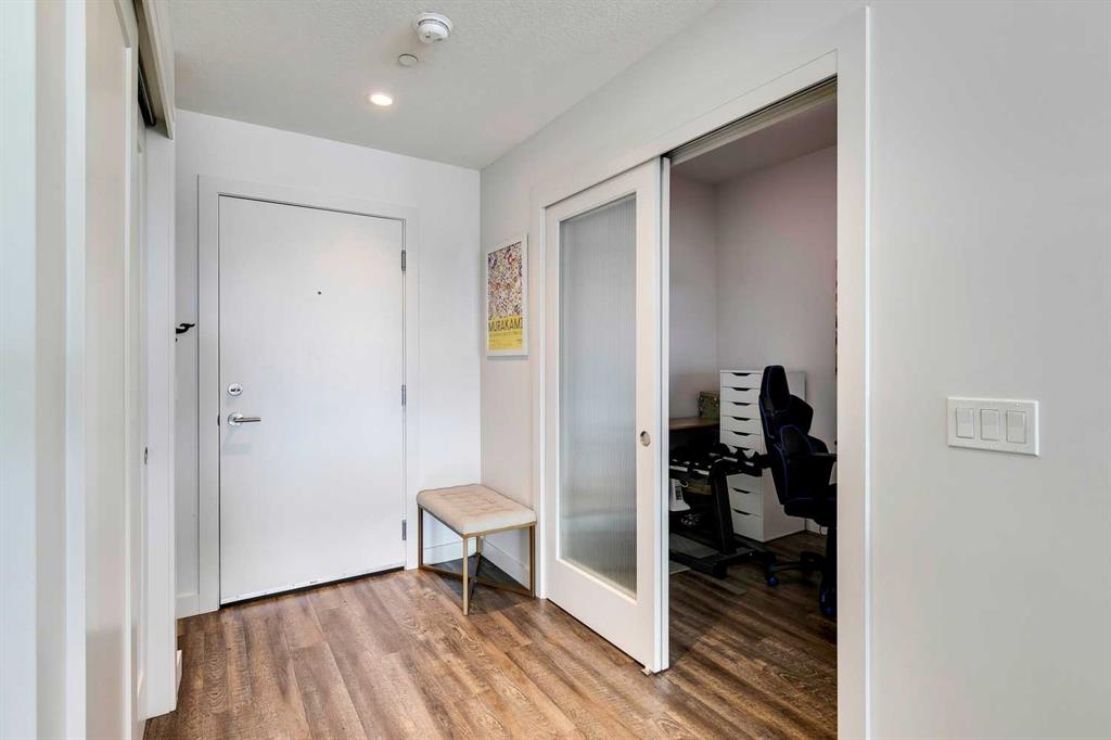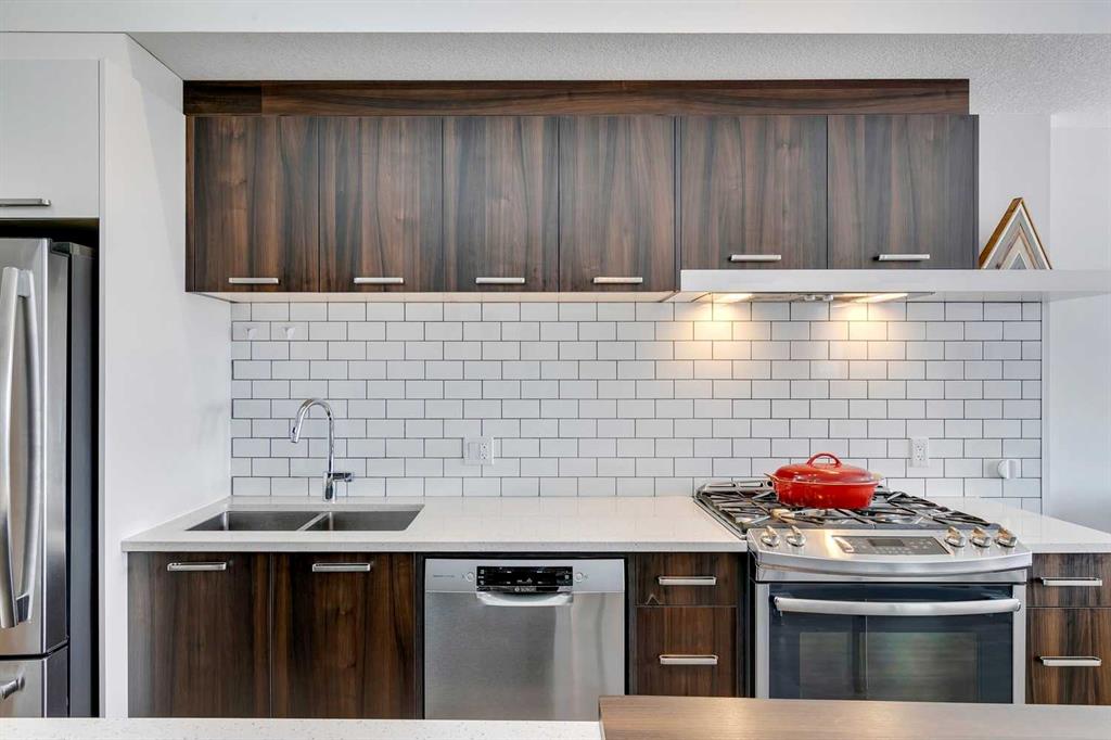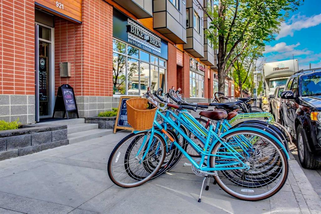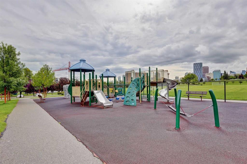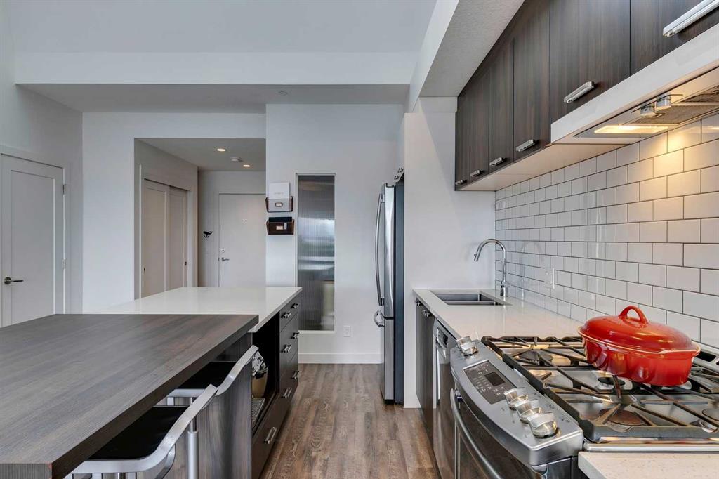 Experience PENTHOUSE living in Renfrew with sweeping, UNOBSTRUCTED VIEWS of downtown, the rolling hills of South Calgary, and even the MOUNTAINS, visible from both your living room and primary bedroom. This top-floor, striking architecture with everyday comfort, featuring 20-ft VAULTED CEILINGS with oversized SKYLIGHTS that pour natural light across the entire home. The kitchen is designed for real living and entertaining, not just looking good. You’ll appreciate the OVERSIZED ISLAND with an integrated eating table, DEEP full-height cabinets, and QUARTZ countertops that offer ample prep space for cooks and hosts alike. The open layout flows effortlessly into the living area and out to your private BALCONY, complete with a GAS line ready for your BBQ. Retreat to a spacious bedroom where morning views greet you daily. A WALKTHROUGH CLOSET leads directly into a well-appointed 4-piece bathroom with a SOAKER tub, creating a spa-like transition from day to night. A separate den/office provides the flexibility to work from home or create a dedicated hobby space. Comfort is top of mind with IN-FLOOR HEATING, AC, and custom WOOD-PLANK WINDOW COVERINGS and BLACKOUT curtains in the bedroom that add warmth and style. STORAGE is never a concern thanks to thoughtful cabinetry throughout. This home includes TITLED underground parking, a HEATED DRIVEWAY into the parkade, designated visitor stalls, plus ample FREE street parking for your guests. Located in one of Calgary’s best inner-city communities, you'll enjoy quick access to downtown, local cafés, parks, and transit. A rare penthouse offering that blends luxury, functionality, and breathtaking views—welcome home to elevated urban living in Renfrew.