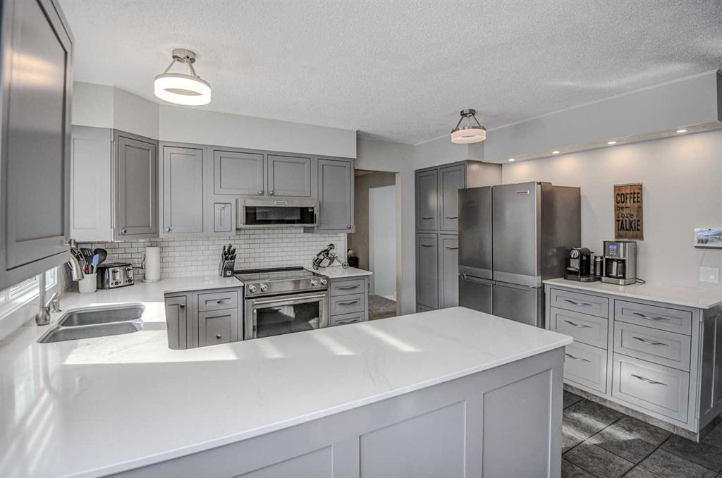 OPEN HOUSE Saturday February 21 and Sunday February 22 from 1 - 3 pm! Large 2 storey split in desirable, amenity rich, Canyon Meadows Estates. Loaded with upgrades and truly move in ready. All the major updates have already been completed, including new kitchen appliances (2025),new washer and dryer (2025), new ECO Star rated windows and gorgeous double front door (2025), plus a new furnace, central air conditioning, hot water tank, and garage furnace (2023). The main floor features a chef-inspired kitchen with stone countertops, ample cabinet space, a breakfast nook, a large formal dining room, and a spacious front living room. You’ll also enjoy the sunken family room with a wood burning fireplace, and patio doors leading to a large deck and sunny south facing backyard. This level also includes convenient bedroom currently being used as an office, main floor laundry and direct access to the oversized 22' x 28' heated garage with an 11’ ceiling. Upstairs, you’ll find a large primary suite with walk in closet and 4-piece ensuite, along with two additional generously sized bedrooms and another 4-piece bathroom. The fully developed basement offers even more living space, including a large family/rec room, a large bedroom, an office/den, a 3-piece bathroom, a storage area, and a large furnace room with built in shelving to keep everything neatly organized. This home is a must-see, beautifully updated, spacious, and priced to move. All that's left to do is move in!