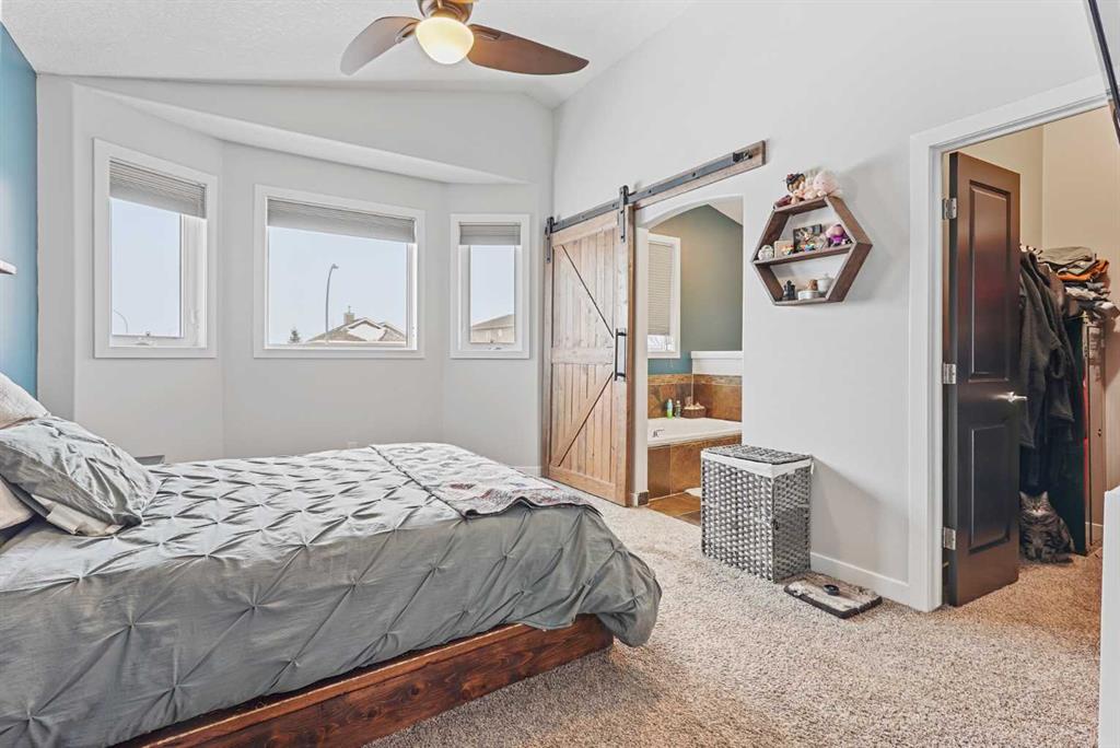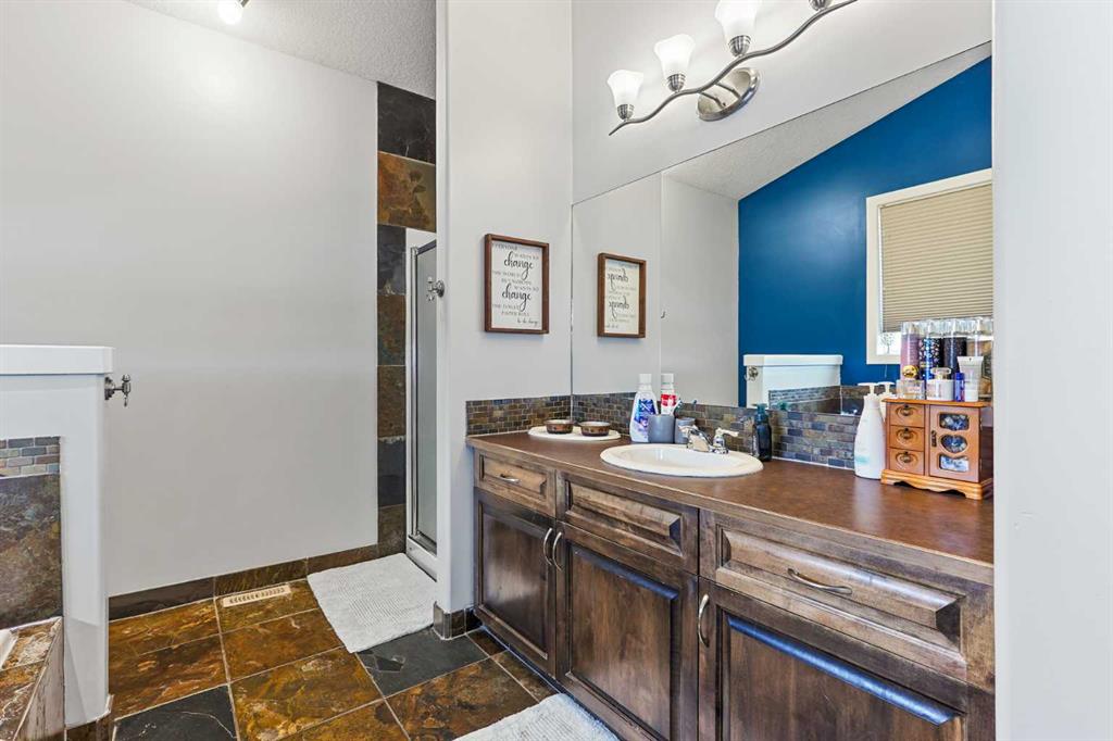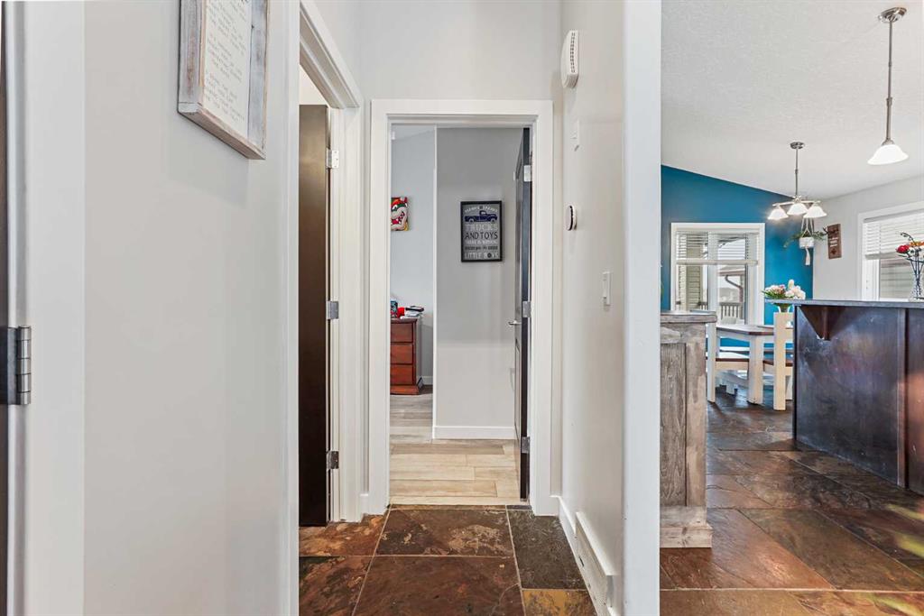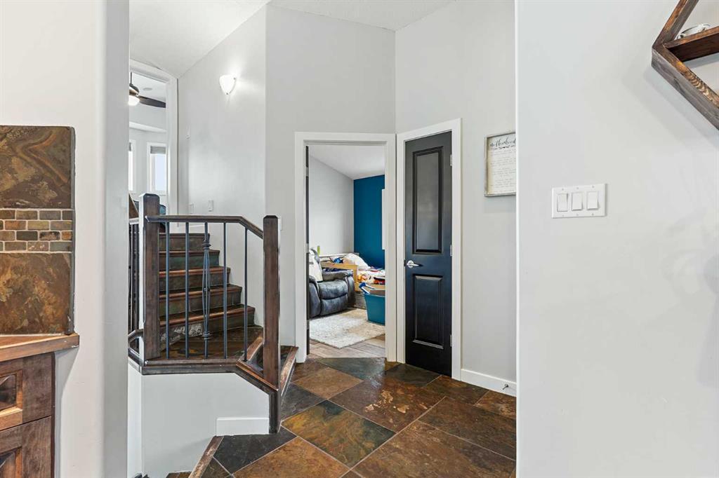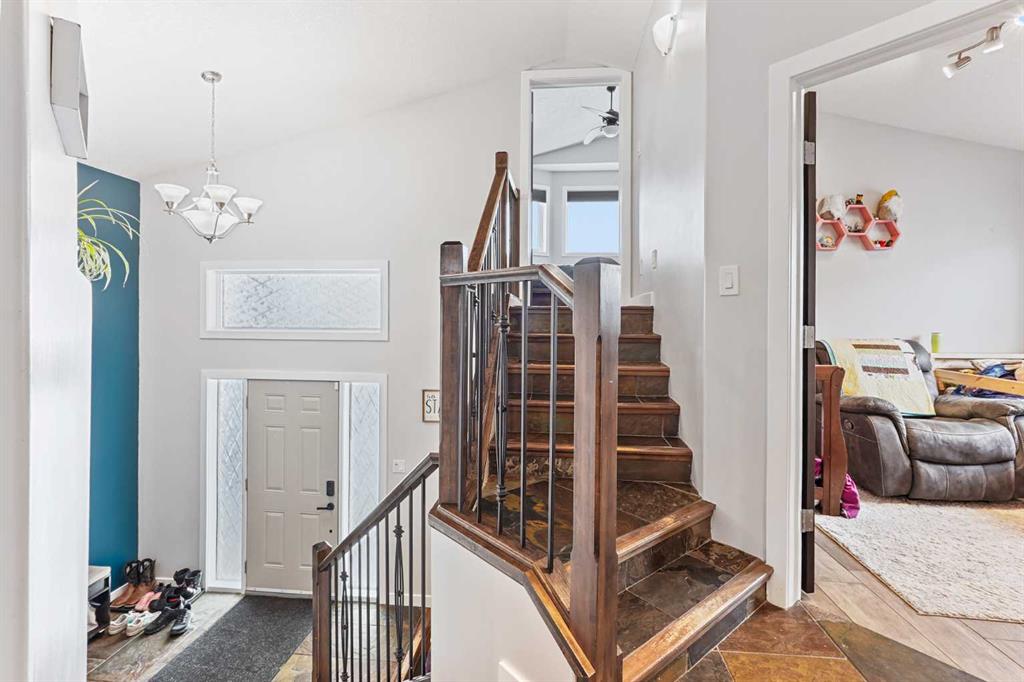 This modified bi-level home offers a balanced layout that prioritizes both natural light and personal privacy. The main floor features airy vaulted ceilings and durable slate flooring that runs through the primary living areas, anchored by large windows that bring in sun throughout the day. A standout feature of the floor plan is the master suite, which is positioned privately above the double attached garage and includes its own four-piece ensuite. Two additional bedrooms and a second full bathroom complete the main level, providing plenty of space for family or guests. ?The home continues to impress in the bright walkout basement, which leads directly to a recently landscaped backyard. This lower level adds a fourth bedroom, a third four-piece bathroom, and a dedicated office space perfect for a quiet work-from-home setup. With a double attached garage and a functional, uncrowded design, this home offers a practical and inviting environment both inside and out. Situated in a quiet neighborhood, this home is just a short walk from a local park and within easy reach of nearby shopping an d amenities. This location offers a perfect balance of community convenience and a peaceful residential feel.