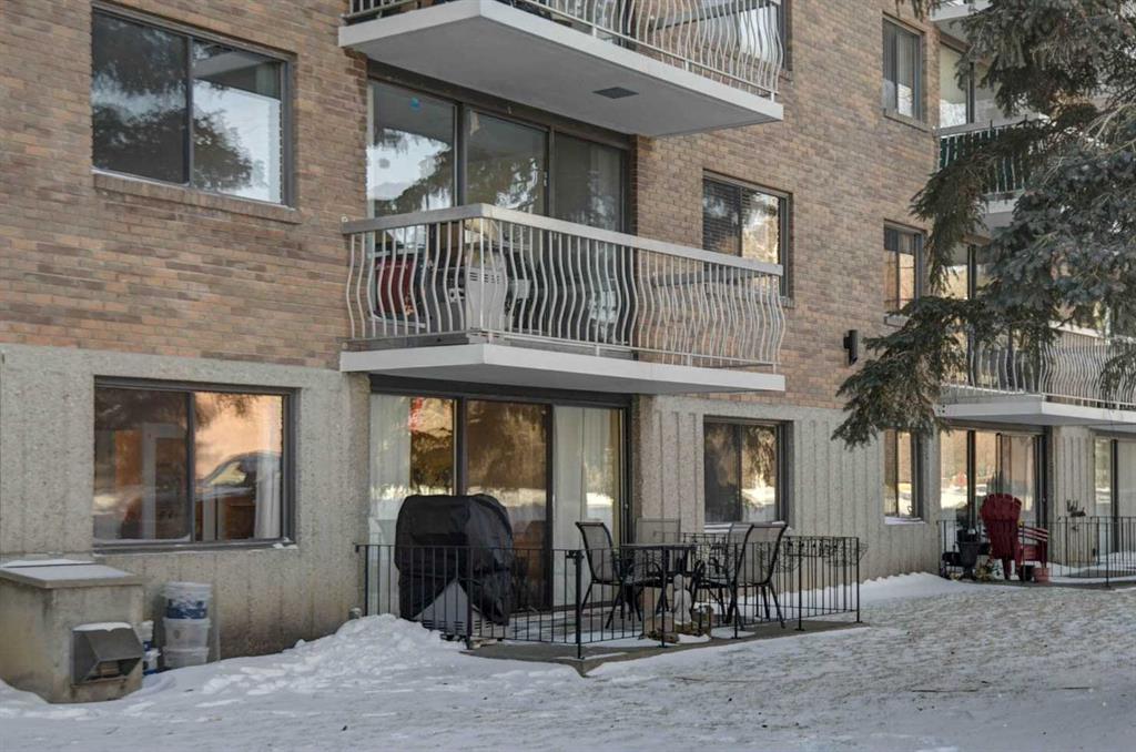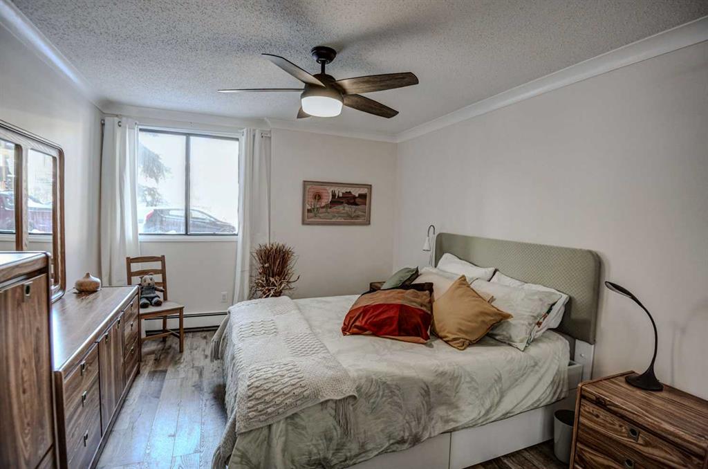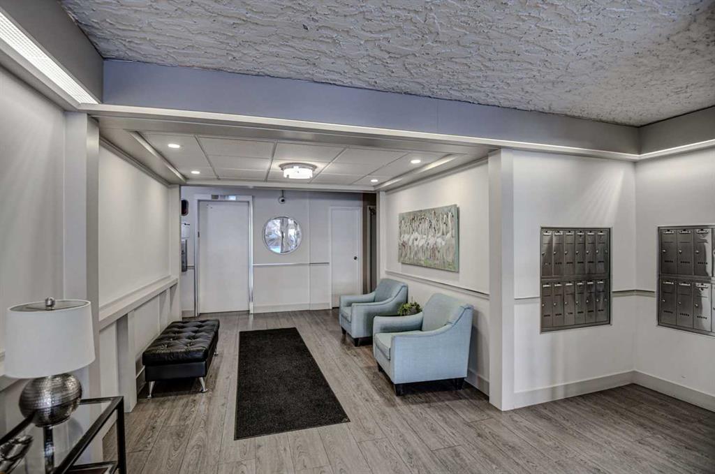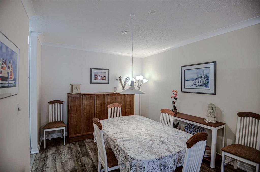 March 29 Open house cancelled. Quiet, 40+ age restricted living can be yours in Chinook Manor, a well-managed and maintained five storey concrete building, with elevator, that is only a couple of blocks from Chinook Center. The spacious two-bedroom unit offers 993 square feet of living space and literally needs no work. Just move in and enjoy. This home is freshly painted throughout. along with all brand-new vinyl plank flooring . Large open living room dining room combination with crown moulding overlooking your exclusive use patio. Second bedroom can be used as an office. The Murphy bed is included.The full bath has a newer vanity. In-unit laundry and storage room.There is also a separate assigned storage room locker . Amenities Include a social room, billiard room, fitness room, laundry room and hobby workshop room. The available underground parking is an option, subject to availability, over and above the building’s included surface parking and abundant on-street parking. There is a strict no-pet policy here and respectable condo fees of $604 per month. Enjoy the quiet lifestyle.Close to transportation and all types of shopping and restaurants.