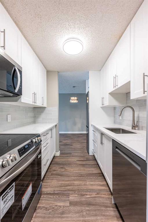 Fantastic location with unbeatable convenience! Public transit is just steps away with easy access across the city and a quick commute downtown. Only a few blocks from Chinook Centre and the C-Train station, with the golf course, Elbow River, Stanley Park, and MNP Community & Sport Centre all close by. Enjoy quick connections to Glenmore Trail, Deerfoot Trail, Macleod Trail, and Elbow Drive. This upgraded, south-facing unit features a full-length balcony—perfect for morning coffee in the sun or evening BBQs. Large, newer windows fill the home with natural light. The NEWLY RENOVATED KITCHEN showcases quartz countertops along with a brand new dishwasher, electric stove, and microwave hood fan, creating a fresh and modern cooking space. The spacious living room offers an oversized patio door, and the thoughtfully designed layout includes two generously sized bedrooms, a large storage room, and a separate linen closet. The NEWLY RENOVATED 4-PC BATHROOM has been beautifully updated with a new soaker tub, new tile walls, new shower faucet, new exhaust fan, and new vanity with a quartz countertop. Fresh new paint throughout adds a crisp, clean finish to the home. Additional features include an assigned parking stall with a plug-in. An excellent opportunity in a well-managed building at an attractive price!