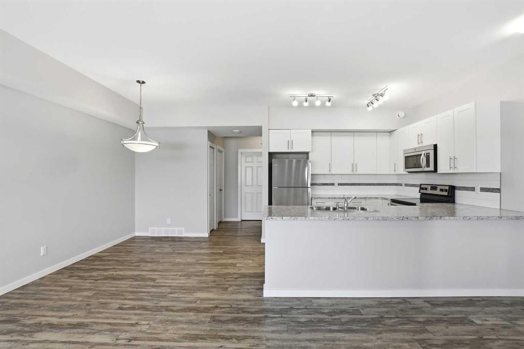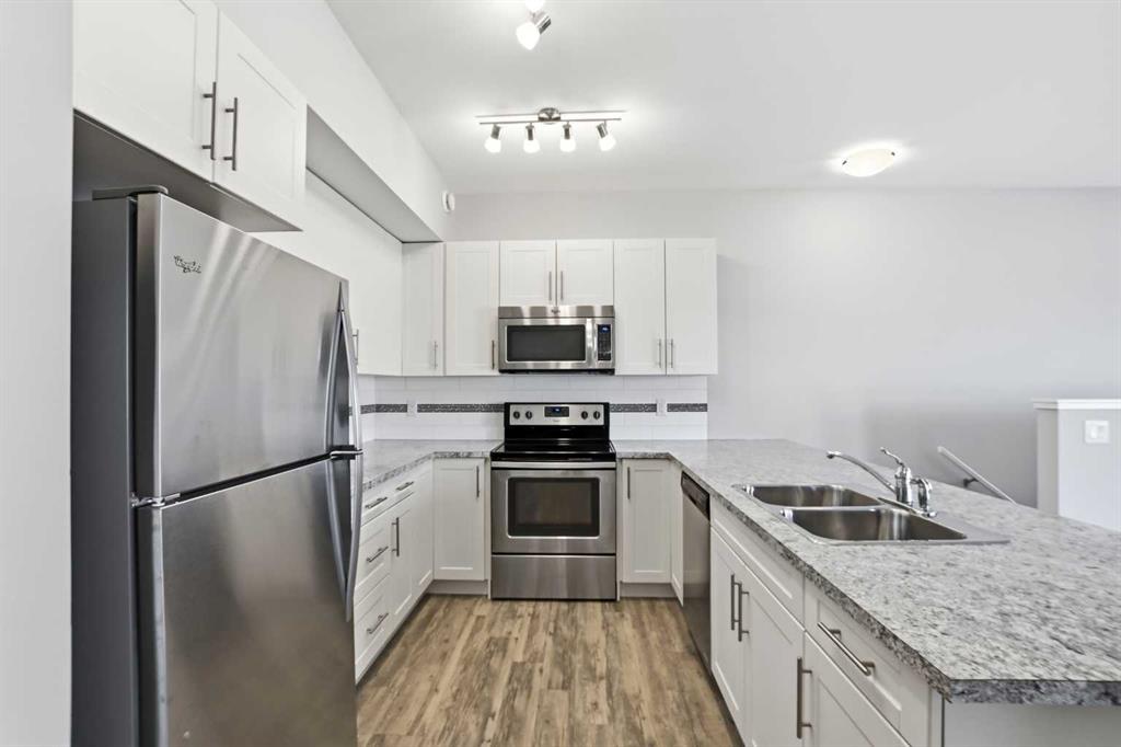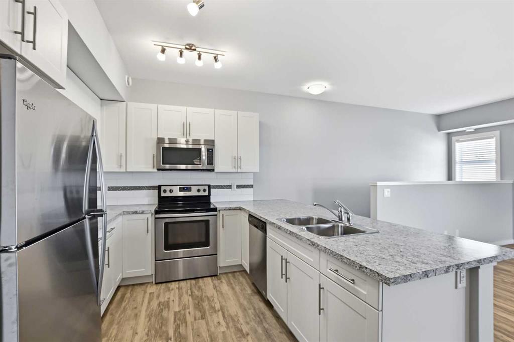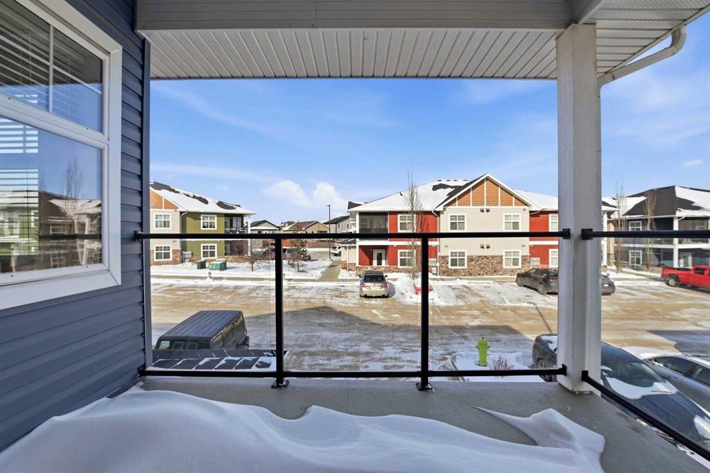 UPPER LEVEL condo in the popular VALLEY CROSSING development. Pull into one of your 2 ASSIGNED POWERED PARKING STALLS right in front of your front door. Once on the main living level - you'll fall in love with the OPEN CONCEPT KITCHEN & LIVING AREA with a large peninsula perfect for entertaining guests or just appreciating the tons of counter space you have for meal preparation or baking. The living area opens out to the COVERED NORTH/EAST FACING DECK. Back inside is 2 good sized BEDROOMS including the primary and ENSUITE WITH UPGRADED SHOWER. There's another full bathroom as well as IN-SUITE LAUNDRY. Come check it out!! It's easy to find because it's right beside the Abbey Center, walking trails and shopping and has quick access to both Hwy 2 and Hwy 2A.