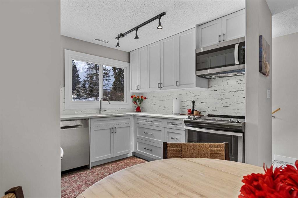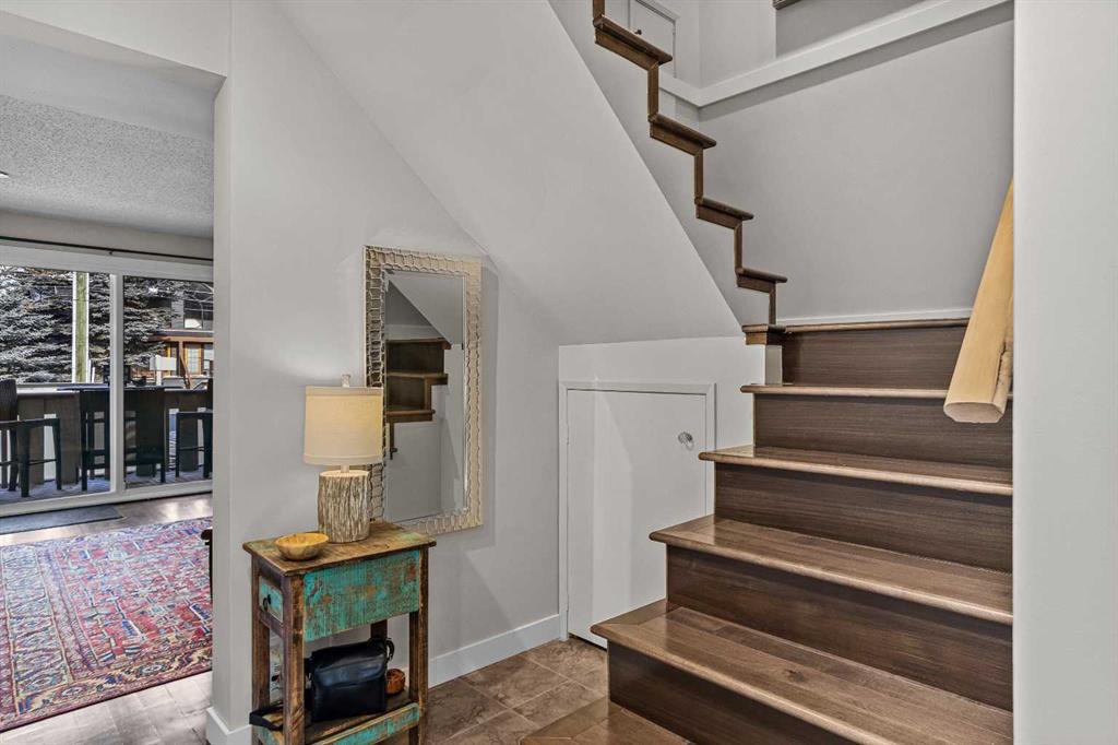 Positioned in the heart of highly sought-after South Canmore, this thoughtfully renovated townhome offers the ideal balance of mountain lifestyle, quality craftsmanship, and everyday functionality. With direct front and rear access to the outdoors, secure on-site storage, and a fully reconstructed kitchen, this property stands out for both substance and setting. From the moment you enter, the attention to detail is evident. The home has been freshly painted, creating a bright and cohesive interior. All interior doors, trim, and baseboards have been replaced, giving the space a clean architectural finish and elevating the overall aesthetic. The kitchen was completely renovated — not simply refreshed. New plumbing, electrical, venting, quartz counter tops, new back splash and custom-built cabinetry provides durability and quality rarely found at this price point. The result is a highly functional, professionally executed kitchen designed for long-term performance and everyday enjoyment. The main living area flows seamlessly from the kitchen into the dining and living spaces, creating an open and practical layout. A classic wood-burning fireplace anchors the room, delivering authentic mountain ambiance and a warm focal point during cooler months. Large windows invite natural light while maintaining privacy and comfort. Upstairs, the bedrooms capture beautiful mountain views, offering a peaceful backdrop to daily life. Wake up to the surrounding peaks and unwind each evening in a setting that reflects the very best of the Bow Valley. The bedrooms are well proportioned and filled with natural light, enhancing the sense of space. One of the home’s unique advantages is its direct front and rear outdoor access — providing immediate connection to fresh air, pathways, and green space without the need to navigate interior corridors. Whether heading out for a morning ride, walk along the Bow River, or quick access to town, the convenience is exceptional. In addition, the property includes secure on-site storage approximately 6’ x 7’, ideal for bikes, skis, seasonal gear, and tools — an invaluable feature for active mountain living. Located just minutes from trails, parks, downtown amenities, and year-round recreation, this South Canmore address offers walkability and access in one of the community’s most established neighbourhoods. With professional renovations, quality materials, mountain views, dedicated storage, and seamless indoor-outdoor flow, this home presents a compelling opportunity in today’s Canmore market.