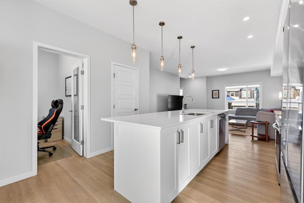 Welcome to Cranston, where light, space, and modern design converge in a 2022-built townhome that feels as elevated as it is effortless. Offering 1,876 square feet of above-grade living space, this impeccable residence invites you to step into something more refined - where clean architectural lines, thoughtful upgrades, and serene pond views quietly signal that you’ve found the one. From the moment you enter, a versatile flex space on the first level unfolds with possibility, ready to become your home gym, studio, executive office, or private retreat. Upstairs, 9-foot ceilings and an open-concept layout create a sense of expansiveness, while natural light beams through both east and west-facing windows, illuminating the luxury vinyl plank flooring. The kitchen is both refined and functional, featuring stainless steel appliances, full-height cabinetry, a large pantry, and a breakfast bar island that naturally becomes the heart of the home. An enclosed office overlooking the glass-railed balcony offers an inspiring workspace with serene pond views, while the balcony’s gas line makes outdoor entertaining effortless. A roomy half bath completes this thoughtfully designed level. The third floor delivers privacy and comfort, with a spacious laundry room offering additional storage and a west-facing primary bedroom that captures warm afternoon light. The deep walk-in closet and elegant ensuite - complete with dual sinks, quartz countertops, and an oversized shower - create a daily ritual of calm and convenience. Two additional generously sized bedrooms share a well-appointed four-piece bathroom, providing flexibility for family or guests. Beyond aesthetics, this 2022-built Cranston townhome is equipped for the future with a brand new air conditioner, hot water on demand, a heat recovery ventilator, fibre optic high-speed internet, and an oversized insulated double attached garage with a double driveway comfortably fitting four vehicles. The garage is already equipped with an electrical panel for a future EV charger, blending practicality with forward-thinking design. Visitor parking within the complex and additional street parking ensure convenience for guests, while pet-friendly policies with board approval make it easy to bring every member of the family home. Overlooking a scenic wet pond and located near the river pathways of Fish Creek Park, shopping, schools, and everyday amenities, this home offers easy access to the ring road and Deerfoot Trail, connecting you seamlessly to the rest of Calgary.