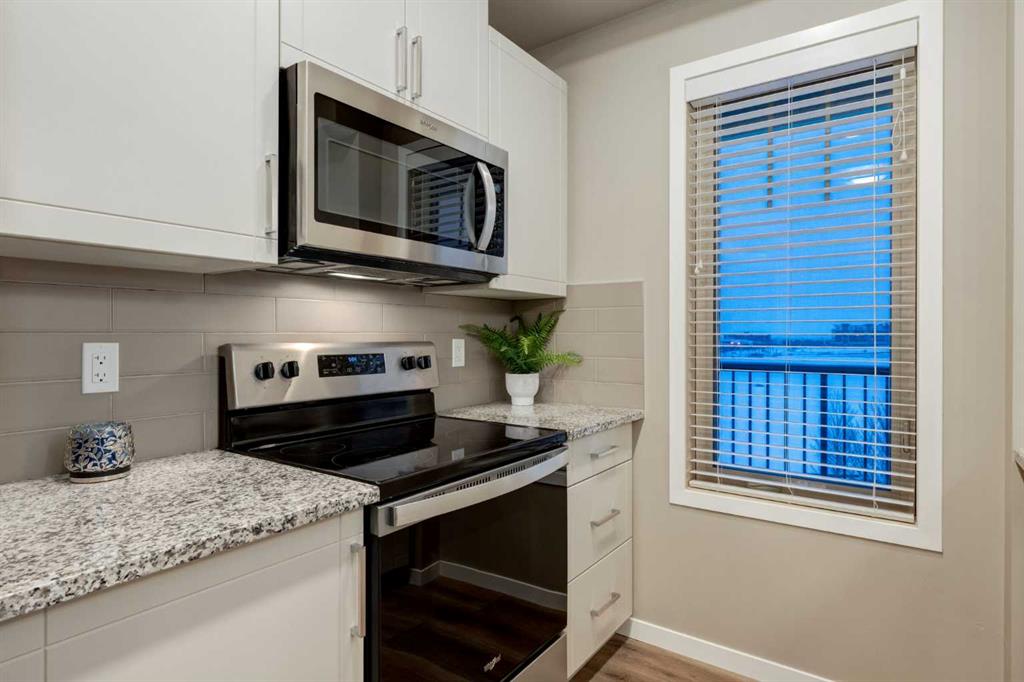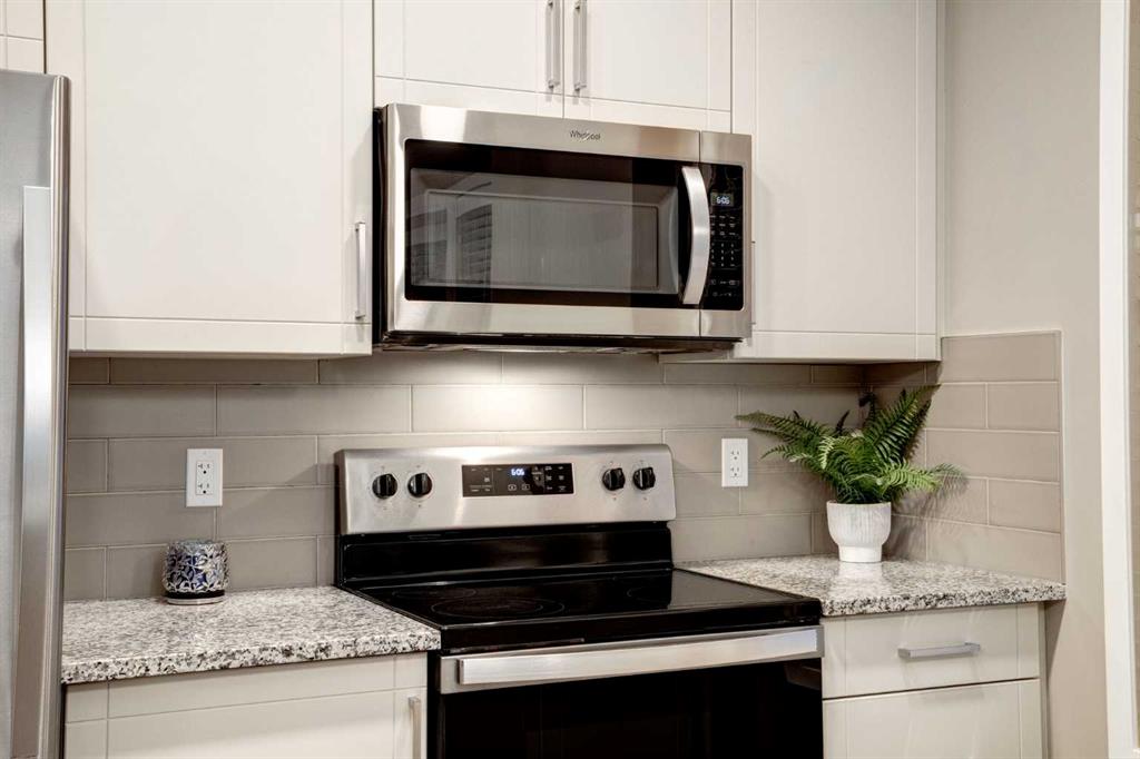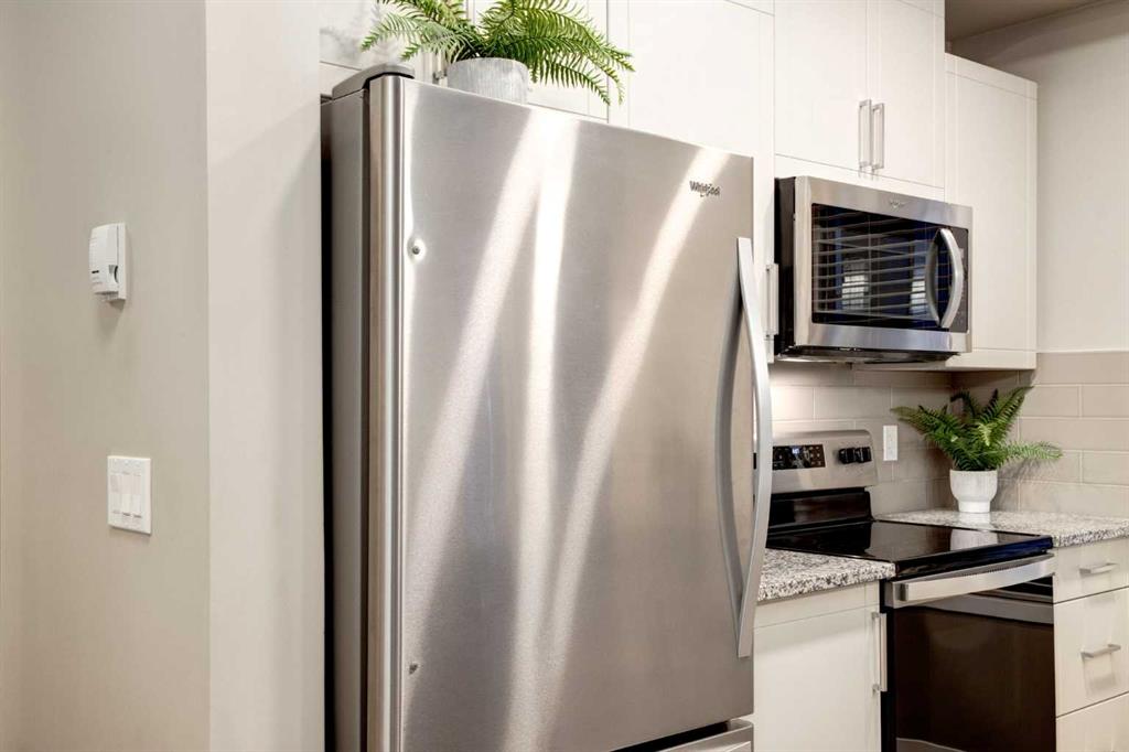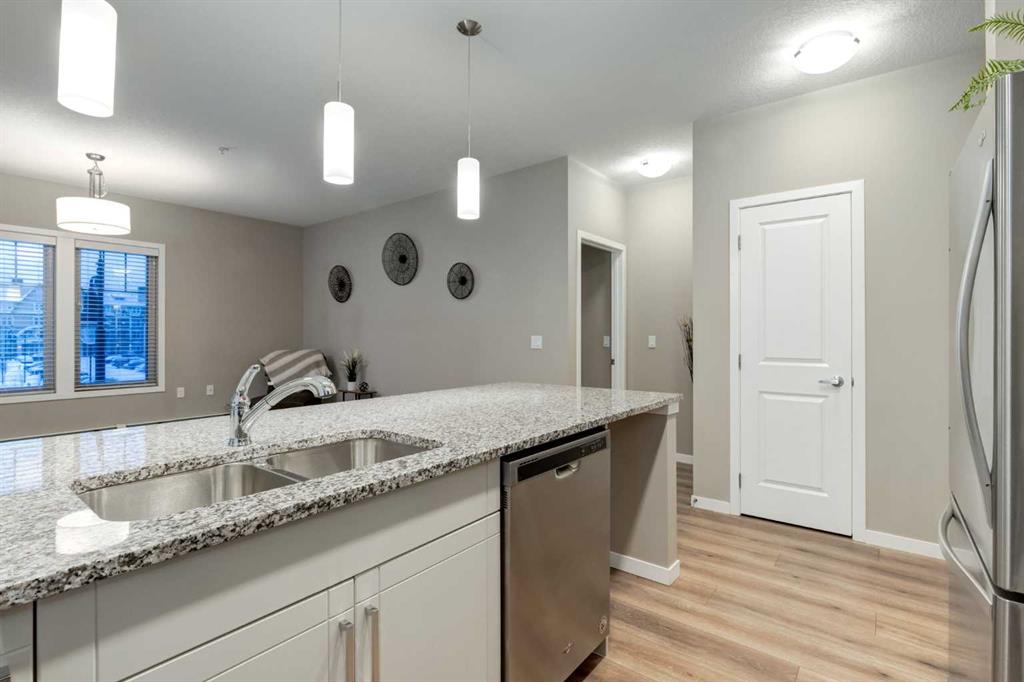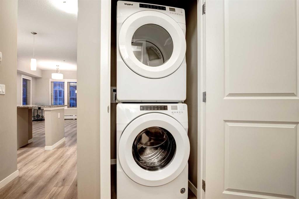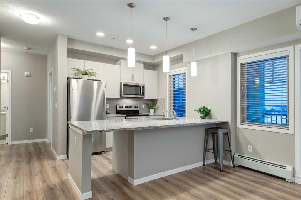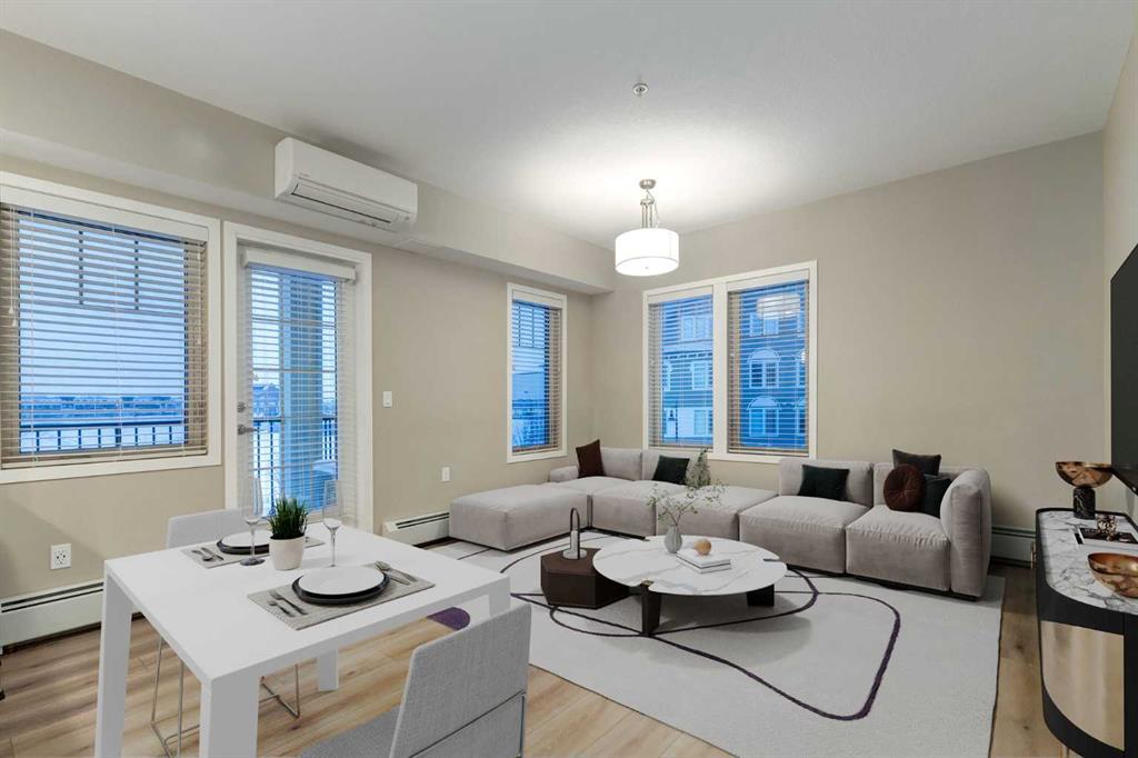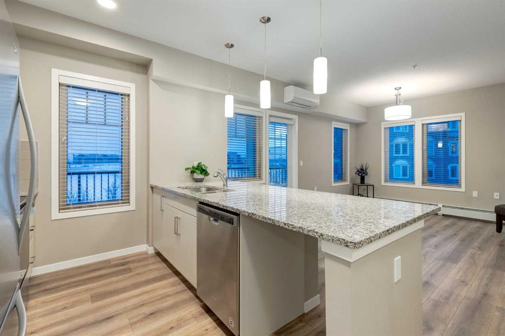 Welcome to this AIR-CONDITIONED 2 BEDROOM, 2 BATHROOM, 898 SQ FT CORNER UNIT in the heart of MAHOGANY - one of Calgary’s most desirable LAKE COMMUNITIES! This stunning condo includes TITLED PARKING in the HEATED UNDERGROUND PARKADE, a STORAGE UNIT + full access to the MAHOGANY BEACH CLUB AMENITIES!! Stepping inside the Foyer, you’re greeted w/NEUTRAL Colours, 9 FT CEILINGS + UPGRADED Vinyl Plank Flooring that leads you down the hall; 4-PC Bathroom sits next to the 2nd GOOD-SIZED Bedroom - this split-bedroom layout is IDEAL for GUESTS, ROOMMATES, or a PRIVATE HOME OFFICE - w/a stacked WASHER/DRYER conveniently located across from the bathroom. Enjoy the OPEN-CONCEPT layout filled w/NATURAL LIGHT from your SOUTH + WEST FACING WINDOWS, + discover an array of UPGRADED FEATURES that truly set this home apart. The Eat-In Kitchen is equipped w/UPGRADED SS Appliances, 1 ¼” GRANITE Counters, a Tiled Backsplash + Bright White CABINETRY w/a FULL PANTRY - delivering both style + function for everyday living or entertaining. The Living Room is WARM + INVITING, filled w/sunlight from the LARGE WINDOWS, creating the perfect place to unwind, host friends, or enjoy a quiet evening in. With its SEAMLESS CONNECTION to the dining area + kitchen and direct access to your PRIVATE SOUTH-FACING COVERED BALCONY, this space offers an ideal blend of comfort, flow + relaxation. The PRIMARY SUITE features LARGE WINDOWS, a WALK-IN CLOSET + a beautifully appointed 4-PC ENSUITE w/EXTRA STORAGE + a GLASS WALK-IN SHOWER - your personal retreat after a busy day. Additional perks include IN-SUITE LAUNDRY, CENTRAL A/C (wall unit), LUXURY VINYL PLANK FLOORING, and a spacious foyer with coat + linen closets. This WELL-MANAGED, PET-FRIENDLY building (with board approval) offers ELEVATOR ACCESS, VISITOR PARKING, and condo fees that INCLUDE Water, Heat, Insurance, Reserve Fund Contributions, Professional Management, and more. To help visualize the space, professionally virtually-staged photos are included, highlighting the layout, scale, and design possibilities this beautiful condo offers. Located steps from PARKS, PATHWAYS, TRANSIT, RESTAURANTS, SHOPS, + of course the MAHOGANY LAKE & BEACH CLUB, this home delivers the perfect balance of convenience + vibrant lakeside living. Whether you're a first-time buyer, downsizing in style, or seeking a turn-key investment, this is URBAN LAKESIDE LIVING at its finest. BOOK YOUR SHOWING TODAY!!!