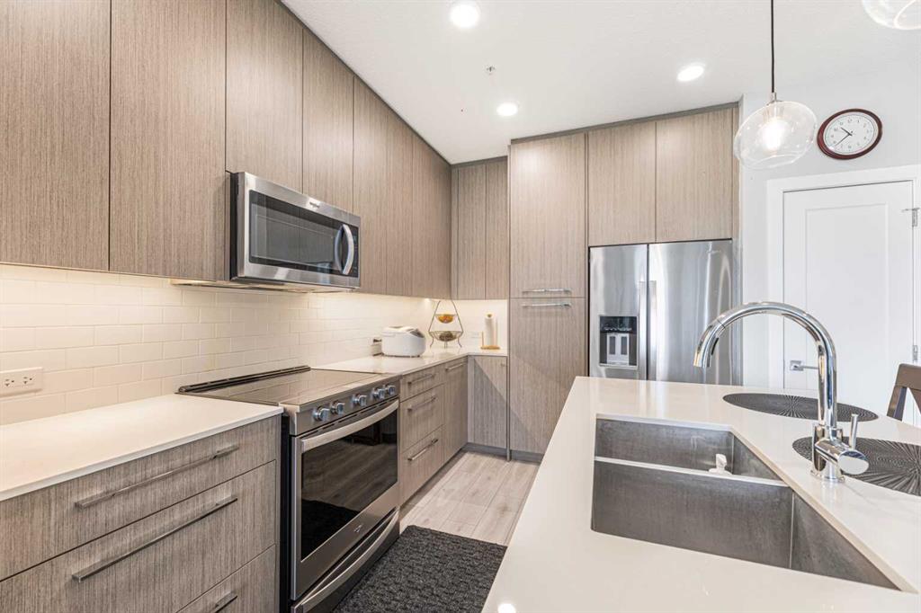 Welcome to this pristine 2 bedroom, 2 bathroom corner apartment that comes with titled underground parking. This unit is one of the largest plans in the complex and is very sought after! As you enter, you'll notice the meticulous care the current owner has invested to maintain its new condition. Situated on the main floor, it offers the quietude of having no adjacent neighbors. The kitchen boasts floor-to-ceiling cabinetry, providing ample storage and a large island with eating area. The stainless steel appliances are in like-new, undamaged condition and the stove was recently upgraded. Luxury Vinyl Plank flooring and ceramic tiles grace the bath and laundry areas. The living room is welcoming with with an upgraded balcony sliding screen door for bug free enjoyment. The laundry room offers additional storage, and the machines are well-maintained. The complex is an oasis featuring a garden area for those who enjoy growing their own vegetables. There is party room for events, a theater room in building 2000, and a full gym, spin and yoga studios, and a pet spa in building 1000. Ample visitor parking is available. The building is Air BnB friendly for those looking to use for short term rental. Ensure you don't miss out on this exquisite apartment – book your viewing today!