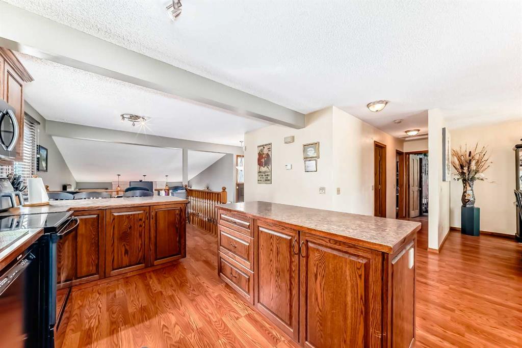 OPEN HOUSE THIS SATURDAY 1-4:00 P.M.!!!Possibly the best location in town! This lovely family home backs onto Big Hill Creek park and the back yard is well treed and private with a relaxing view of the treed creek side park Our "deer" friends come and enjoy the solitude and fresh apples, crabapples and raspberries!. Original kitchen was renovated to add more room and a very nice island. The dining room was added to provide functional and enjoyable friend space ! The sunken living room with feature electric fireplace is private and very comfortable with vaulted ceiling.!!Your huge deck overlooks the babbling brook and park view! Have the wonderful morning sun to enjoy your breakfast coffee,a very private spot to relax and listen to the quiet. Access to a private laundry and storage is off the kitchen in the basement area .There is very convenient access to the jogging/walking paths of the Big Hill creek and the Bow River recreation system. Sheltered access under the deck to the legal basement suite .The bright and sunny basement suite has several big windows and is very comfortable and well set up. includes a gas fireplace and its own laundry .Each level has its own laundry . The attached double front drive garage has an extra long driveway for comfortable off street parking . What a great family neighbourhood ,close to elementary school, parks, and pathways. You must see the condition and beauty of this exceptional home! Make it yours ! (check out the video)