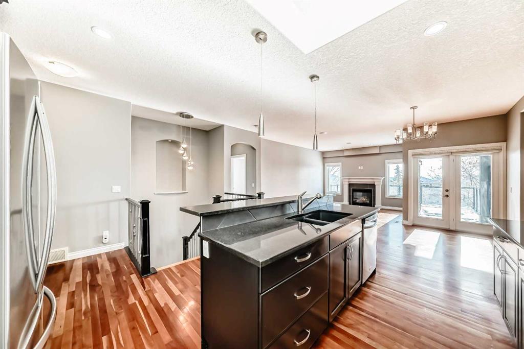 Visit REALTOR® website for additional information.Stunning Fully Developed Walk-Out Bungalow Backing Onto Green Space & Playground, Connected to Cochrane’s Trail System Welcome to this beautifully appointed walk-out bungalow with 9-ft ceilings on both levels, perfectly located in a quiet setting backing directly onto green space and a playground — offering the ideal balance of privacy and community living. From the charming front porch, you’ll step into a bright, open-concept layout featuring pot lights, upgraded fixtures, and rich hardwood flooring. The heart of the home is the stunning kitchen, complete with a skylight, granite countertops, abundant cabinetry, and a walk-thru pantry leading to the oversized attached double garage. The main floor also includes a versatile den or second bedroom — ideal for guests or a home office. At the rear, enjoy a spacious deck with sleek glass railing and a gas line for your BBQ, all while taking in peaceful park and mountain views. The primary suite overlooks the green space and offers a walk-in closet and luxurious ensuite with in-floor heating, air tub, make-up counter, and an impressive tiled shower with bench and multi-head 6-piece configuration. The fully finished walk-out basement is built for entertaining, featuring two additional bedrooms, a full bath, large family room with in-ceiling speakers, wet bar, in-floor heating, and generous storage. Step out to the exposed aggregate patio and beautifully upgraded outdoor space. Additional highlights include a drywalled garage and numerous thoughtful upgrades throughout. A rare combination of space, style, and an unbeatable