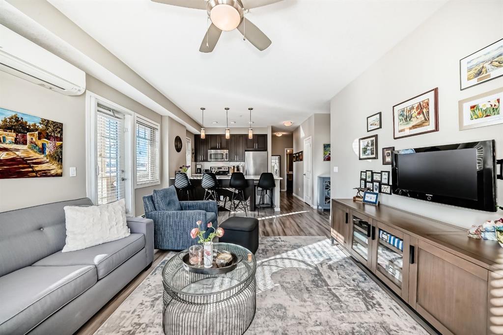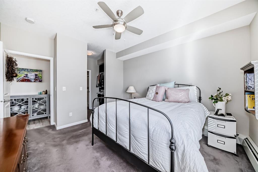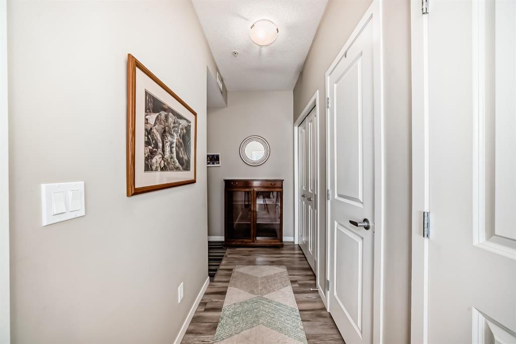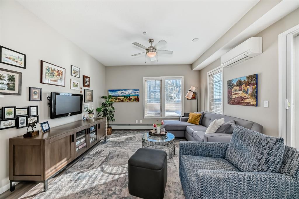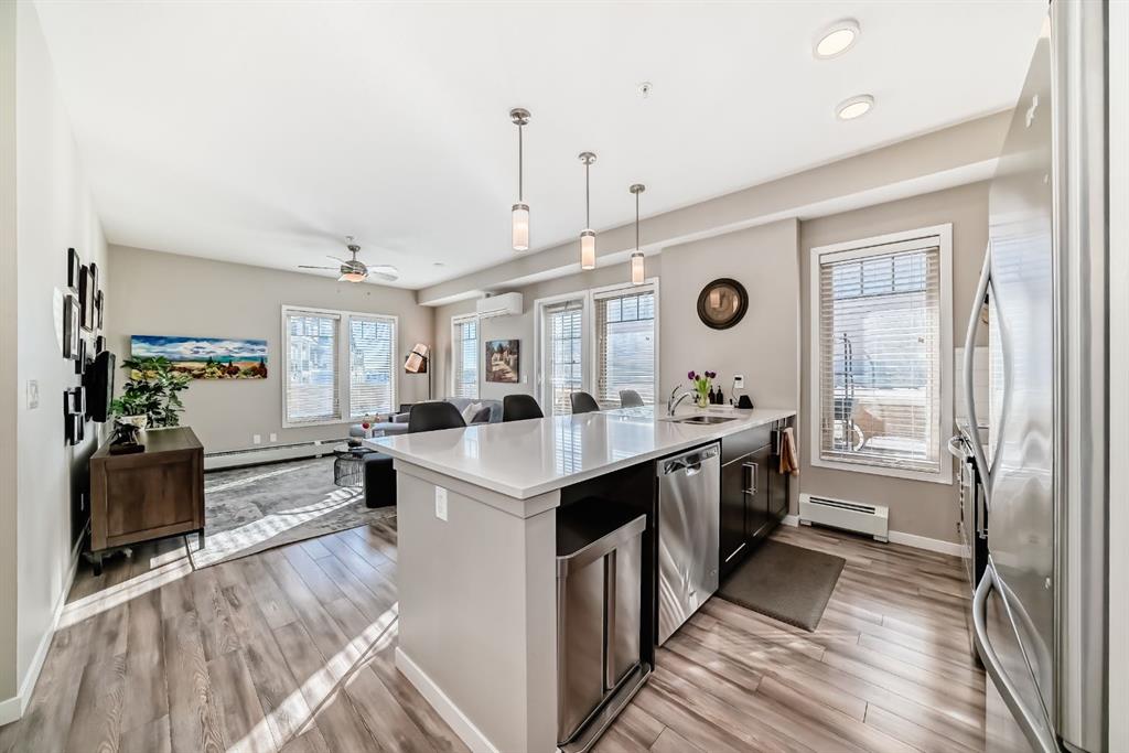 *** OPEN HOUSE SATURDAY APRIL 4TH 12:00-2:00PM ***Welcome to this beautifully maintained 2 bedroom, 2 bathroom corner unit in an unbeatable location. With desirable south facing exposure, this home is filled with natural light throughout the day, creating a warm and inviting atmosphere. The thoughtfully designed layout offers a rare hallway entrance that opens into a bright, open concept living space, creating both privacy and flow. A front entry closet and two additional pantry closets provide exceptional storage, while in unit laundry adds everyday convenience. The primary bedroom features built in shelving within the walk in closet and a private 3 piece ensuite bathroom. Stainless steel appliances were updated in 2019, and air conditioning keeps the space comfortable during the summer months, making this home truly move in ready. Step outside onto the impressive 36 foot south facing balcony with mountain views, an ideal extension of your living space to enjoy a quiet morning coffee or relax in the evening sun. Additional highlights include heated underground parking with a storage locker conveniently located directly in front of the stall, stairwell access just outside the unit, and a private gym within the building. Situated in a vibrant, amenity rich community with shops, dining, schools, and everyday essentials within walking distance, this is condo living at its best. Don't forget that you will have lake access all year round for swimming and skating! A wonderful opportunity to own in a highly sought after neighbourhood.