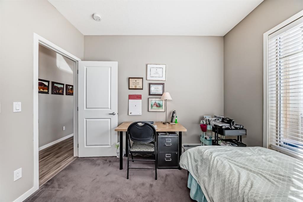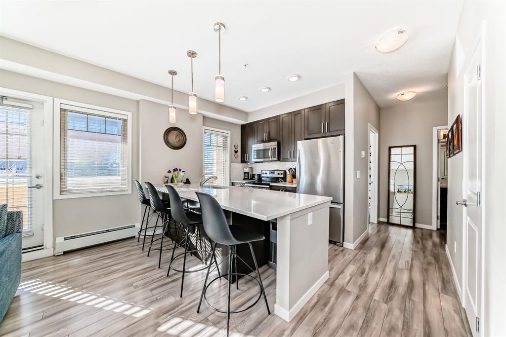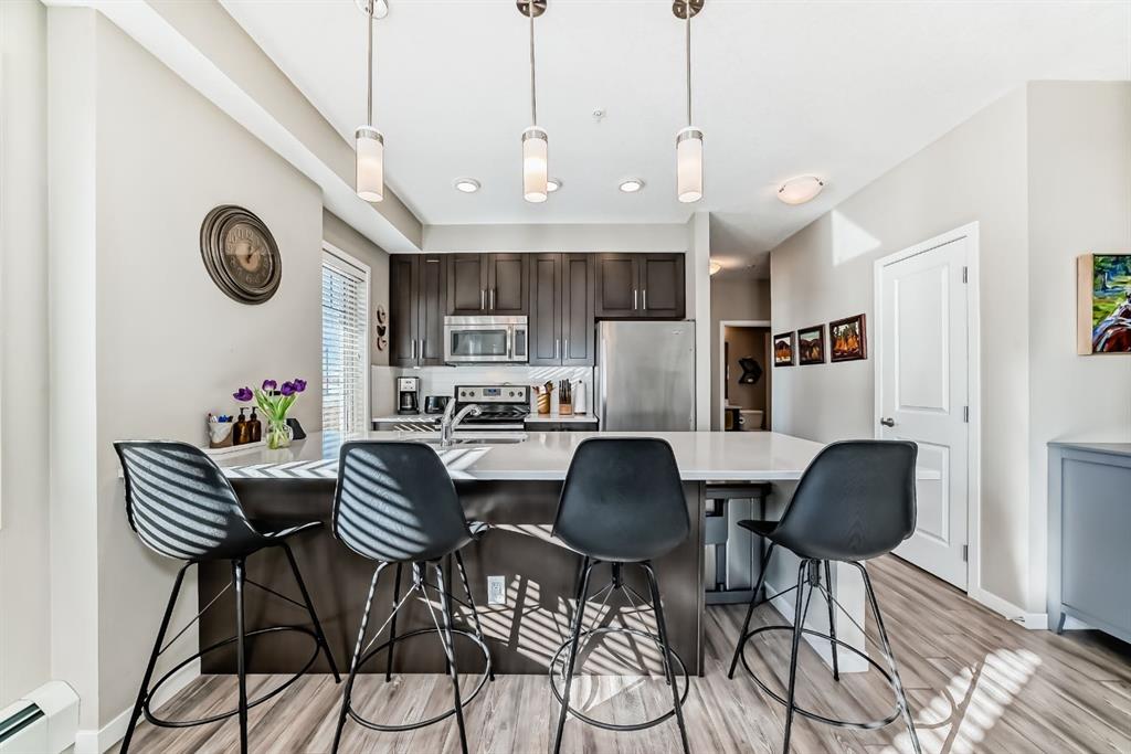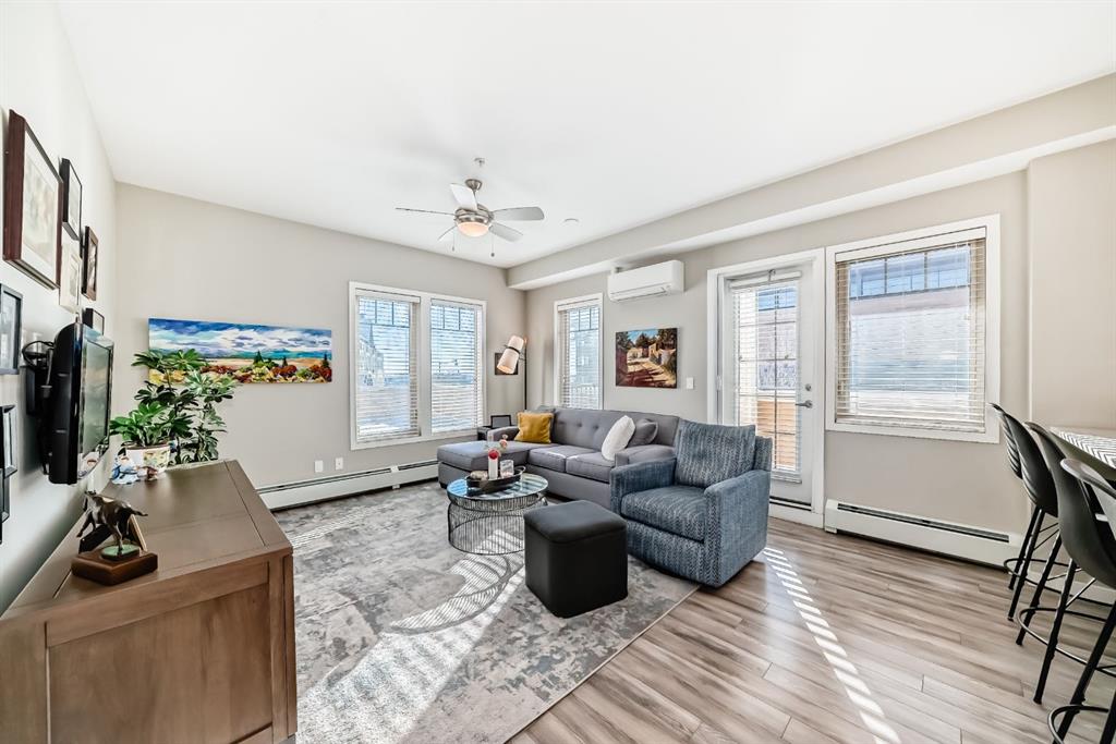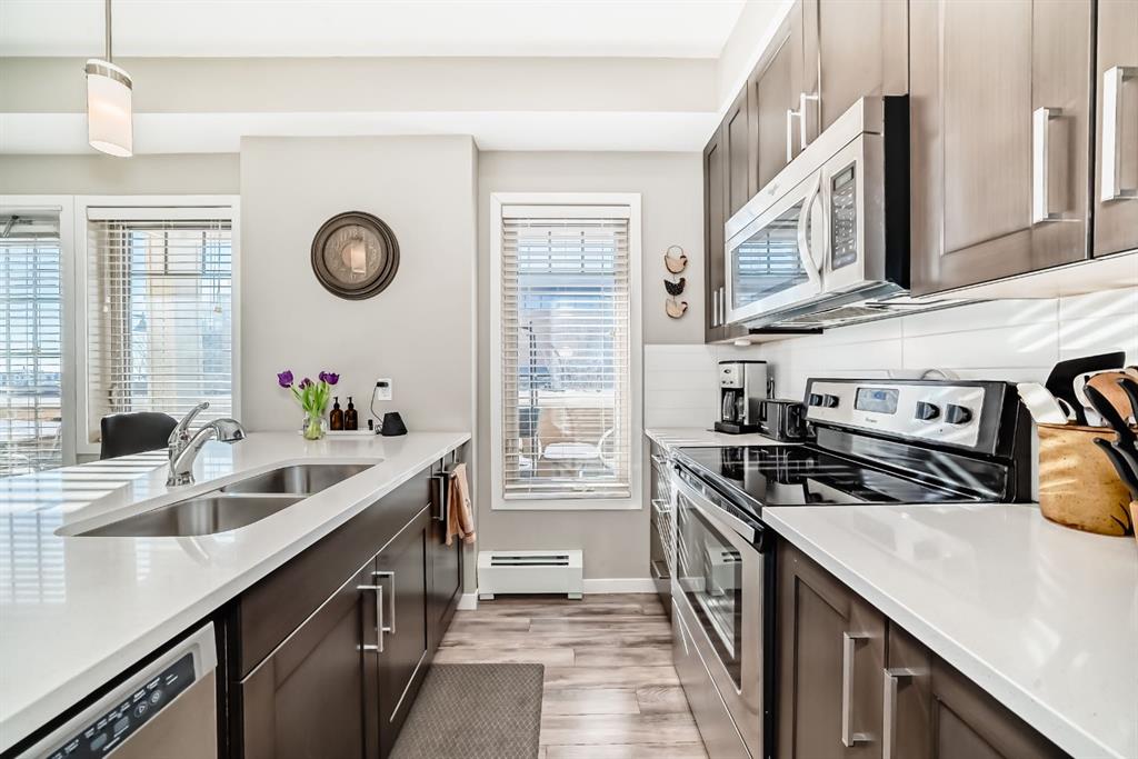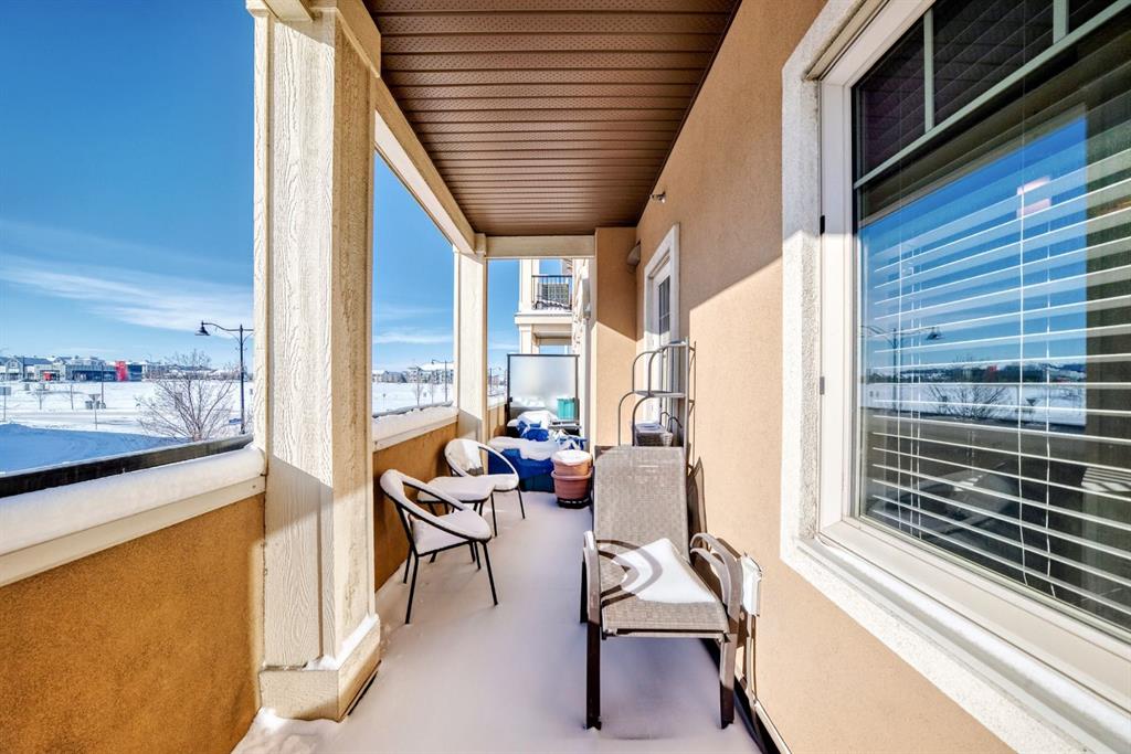 *** OPEN HOUSE SATURDAY APRIL 4TH 12:00-2:00PM ***Welcome to this beautifully maintained 2 bedroom, 2 bathroom corner unit in an unbeatable location. With desirable south facing exposure, this home is filled with natural light throughout the day, creating a warm and inviting atmosphere. The thoughtfully designed layout offers a rare hallway entrance that opens into a bright, open concept living space, creating both privacy and flow. A front entry closet and two additional pantry closets provide exceptional storage, while in unit laundry adds everyday convenience. The primary bedroom features built in shelving within the walk in closet and a private 3 piece ensuite bathroom. Stainless steel appliances were updated in 2019, and air conditioning keeps the space comfortable during the summer months, making this home truly move in ready. Step outside onto the impressive 36 foot south facing balcony with mountain views, an ideal extension of your living space to enjoy a quiet morning coffee or relax in the evening sun. Additional highlights include heated underground parking with a storage locker conveniently located directly in front of the stall, stairwell access just outside the unit, and a private gym within the building. Situated in a vibrant, amenity rich community with shops, dining, schools, and everyday essentials within walking distance, this is condo living at its best. Don't forget that you will have lake access all year round for swimming and skating! A wonderful opportunity to own in a highly sought after neighbourhood.