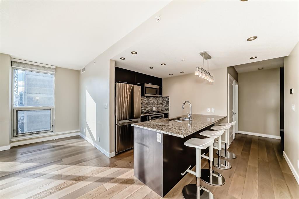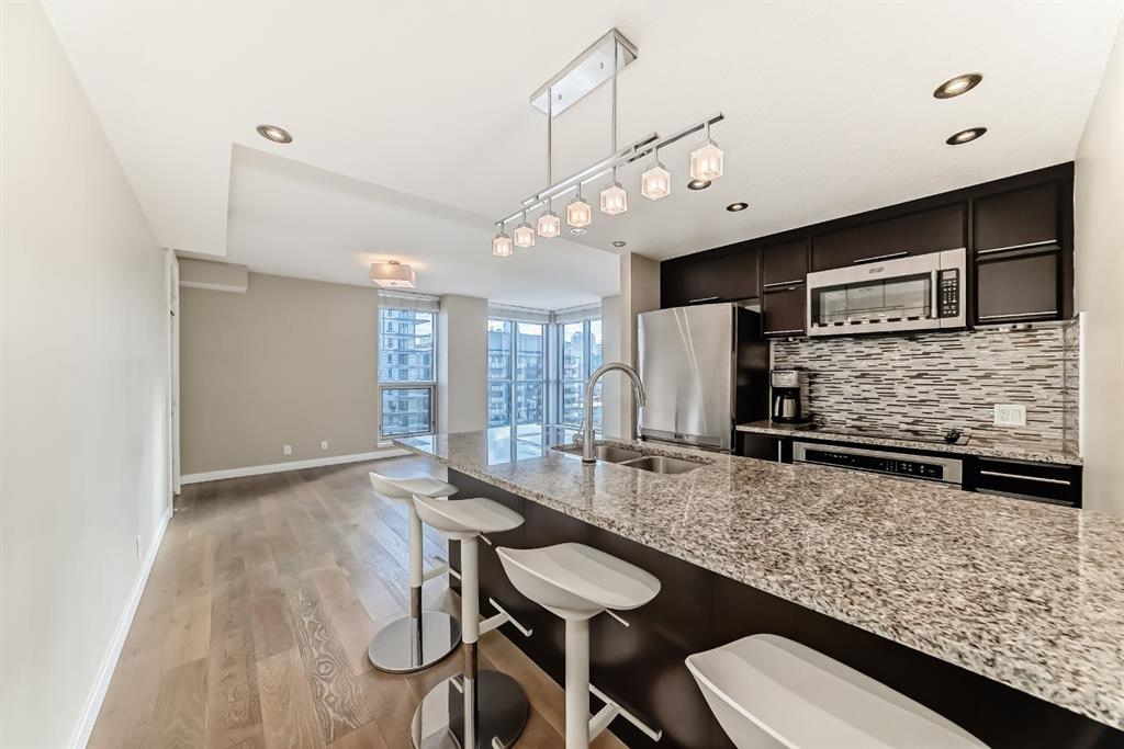 Welcome to this 2 beds, 2 baths condo perfectly located in the vibrant Kensington district. A large corner unit with a well-planned layout(facing to South and East). The living room, dining room, and kitchen area are flooded with natural light, the large windows also provide an amazing view of the downtown skyline. The kitchen boasts granite countertops and stainless steel appliances. The master bedroom is your personal haven, complete with its own three-piece ensuite bathroom and walk-in closet. The second bedroom is spacious and perfect for guests & family. Kitchen with stainless steel appliances, & granite counter tops, laundry in the unit, engineered hardwood floors. The building is secured and well-maintained, featuring titled underground heated parking, secure entry, storage and additional guest parking—everything you need for peace of mind and day-to-day convenience. Walking distance to the Bow River pathways, Riley Park, and endless options for restaurants, bars, grocery shops and boutique shops in Kensington. With easy access to SAIT, the University of Calgary, downtown, and several nearby parks and playgrounds, this is the ideal home for professionals, students, or young families who want to live in the heart of it all. Don’t miss this rare opportunity!