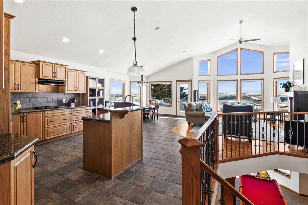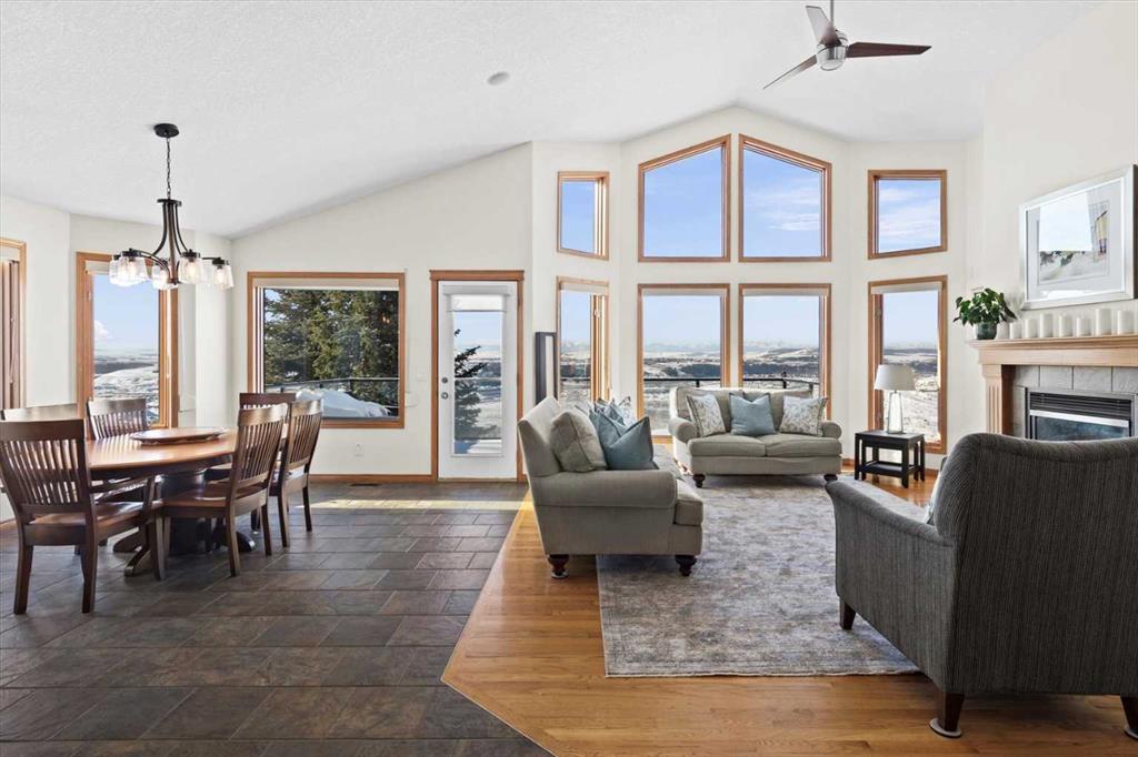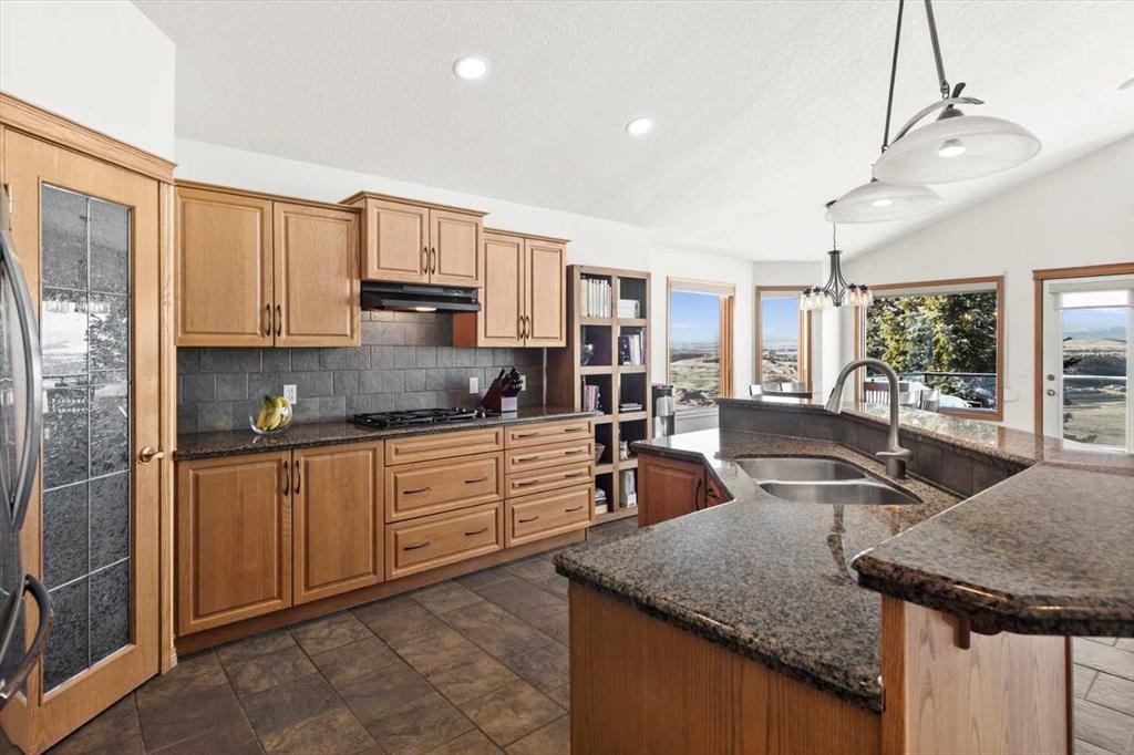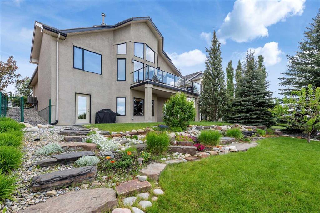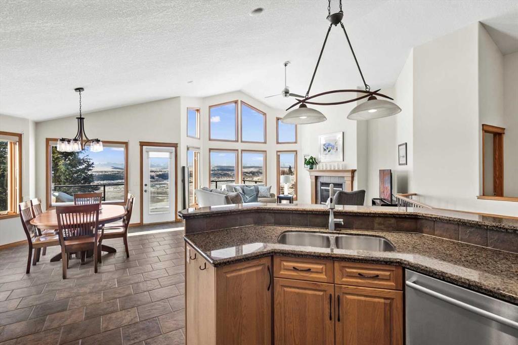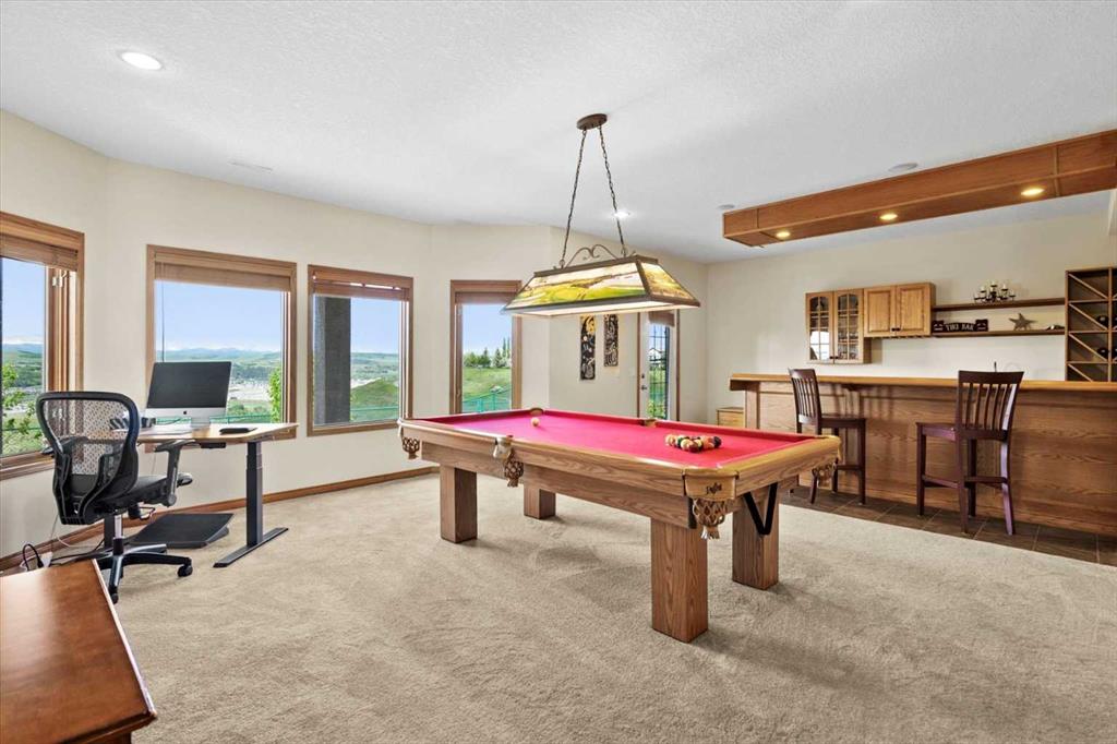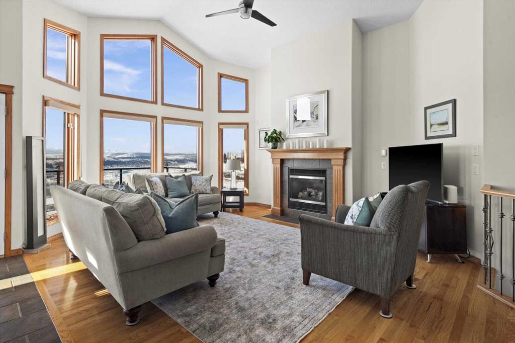 Perched in a prime southwest facing location, this traditionally designed executive walkout bungalow offers unparalleled views of the surrounding mountains and valleys, with no obstructions to spoil the scenic beauty. Impeccably maintained and boasting 1,713 square feet of living space, this home blends classic charm with modern comforts, making it an ideal retreat for both relaxation and entertainment. The spacious entry flows into the open-concept main floor and features a light, neutral interior that enhances the spacious feel of the home. Off the entry is a separate home office or den with French doors for privacy. Opposite the office is the main floor laundry and mud room with lots of storage space and access to the oversized double car garage. The elegant, formal dining room is a perfect location for hosting small or large gatherings. Floor to ceiling windows and soaring high ceilings flood the space with natural light, creating an inviting and airy ambiance. A central fireplace in the living room offers warmth and coziness, perfect for cooler evenings. Sliding doors lead out to a deck, where you can enjoy the stunning views while sipping your morning coffee or hosting gatherings. The chef-inspired kitchen is outfitted with high-end stainless steel appliances, granite countertops, and a large island for additional workspace. New refrigerator, oven, washer and dryer this year and dishwasher 2024. A walk-in pantry provides ample storage, while the adjacent dining area flows effortlessly into the living room, making it perfect for both intimate dinners and entertaining larger groups. The master suite, conveniently located on the main floor, is a true sanctuary. It features a luxurious 5-piece ensuite bath and offers easy access to the main living areas. The walkout lower level is an entertainer’s dream, with in-floor heating and a media room complete with theater seating for an immersive viewing experience. A games room with a full bar and pool table is ideal for hosting friends, while the custom library offers a quiet spot for reading or relaxation. Two additional bedrooms are located on the lower level, along with a spacious 3-piece bath. The lower level also opens onto a patio, offering seamless access to the beautifully landscaped yard with a terraced garden and full irrigation system. For added comfort, the home is equipped with central air conditioning and surround sound throughout, ensuring the perfect atmosphere year-round. Whether you're enjoying a cozy evening by the fire, hosting a game night, or unwinding on the deck with a glass of wine, this home offers an exceptional lifestyle.
